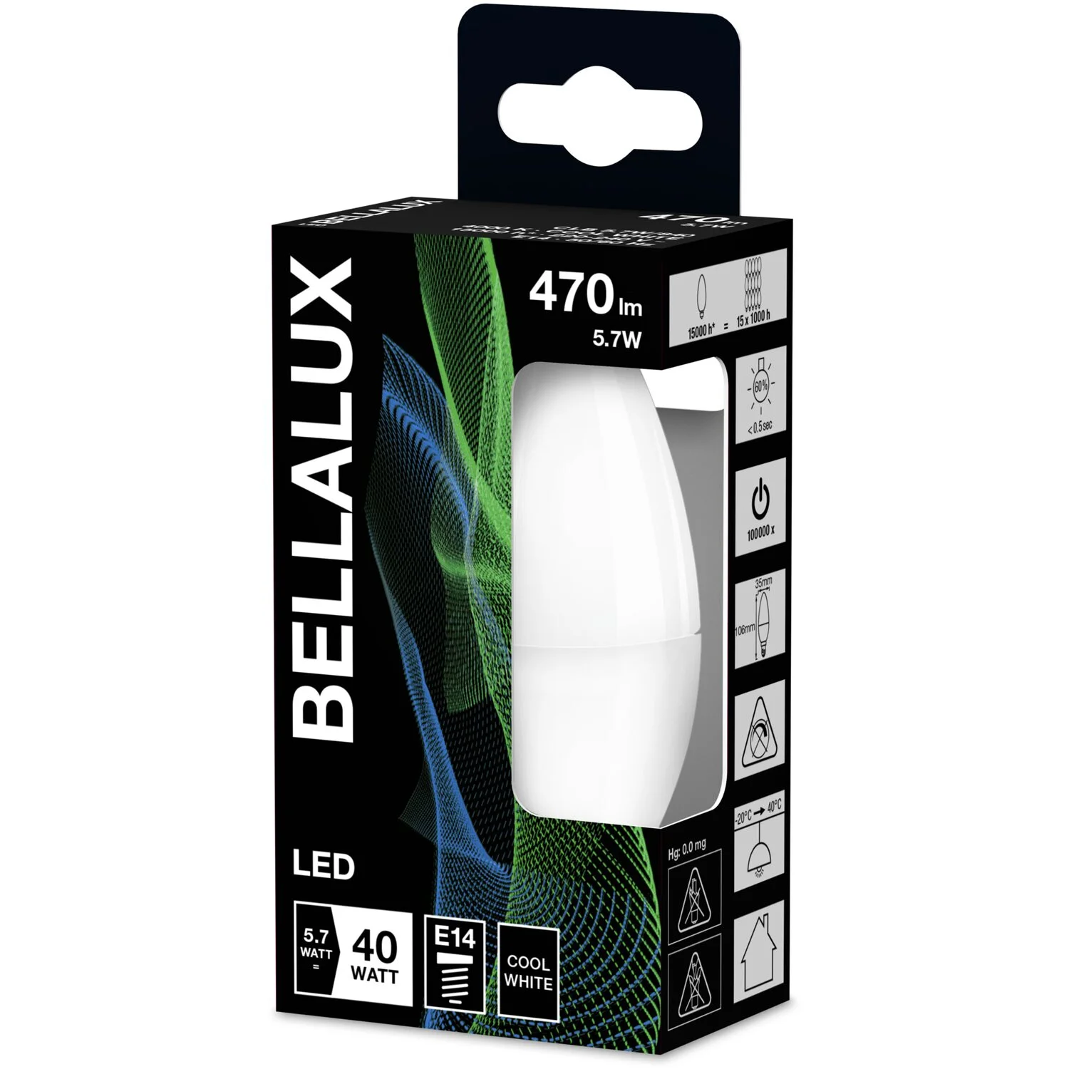 Die Bellalux LED-Lampe in klassischer Kerzenform ist ein sehr energieeffizientes (EEK: F) LED Retrofit Leuchtmittel für E14 Fassungen. Sie kann überall im Haushalt für Allgemeinbeleuchtungszwecke zur Anwendung kommen. Ohne Aufwärmzeit liefert sie sofort 100 % ihres nicht dimmbaren Lichtstroms, ist quecksilberfrei und entwickelt weniger Wärme als herkömmliche Leuchtmittel. Bereits preiswert in der Anschaffung, erfreut die Bellalux zudem mit einer durchschnittlichen Lebensdauer von 15’000 Stunden.