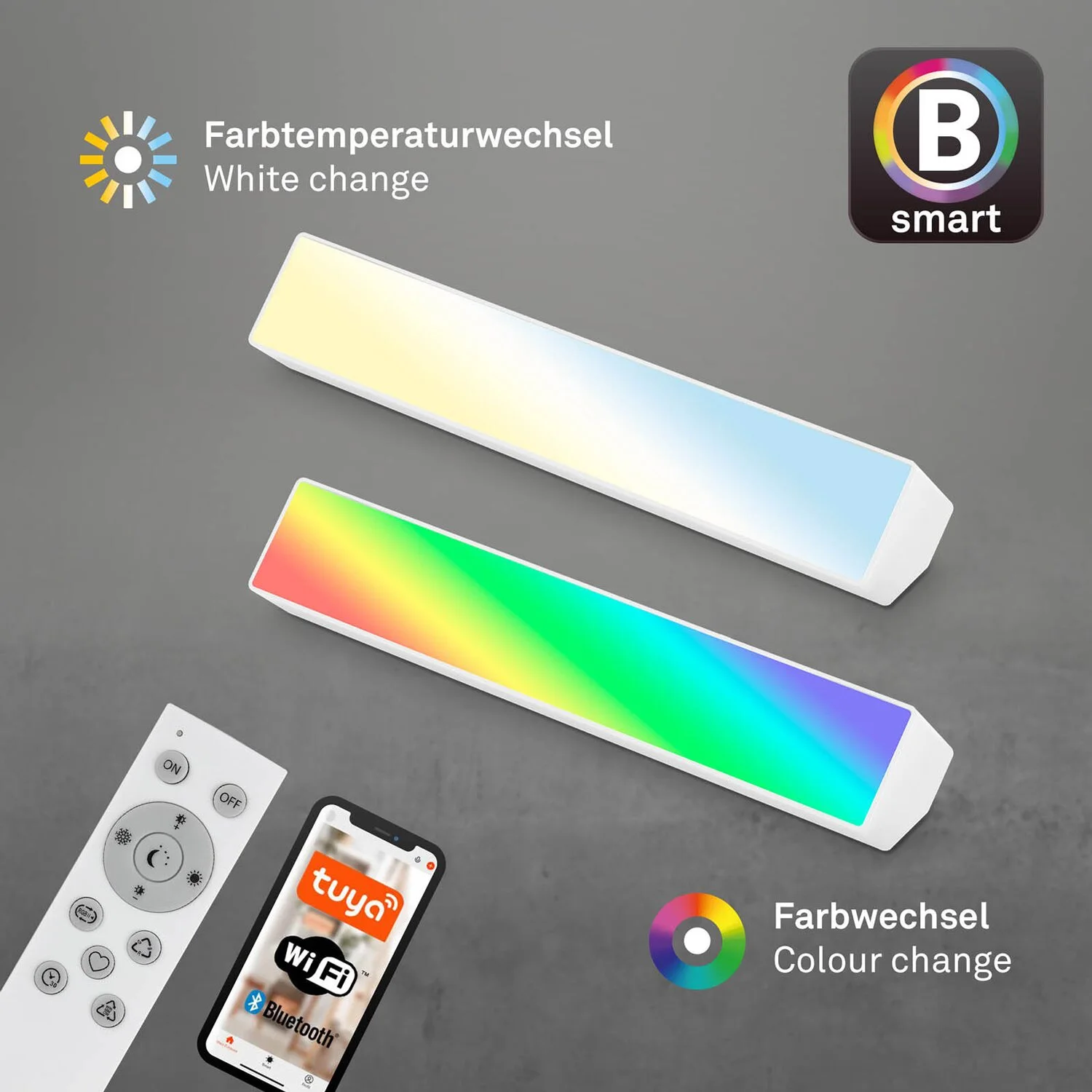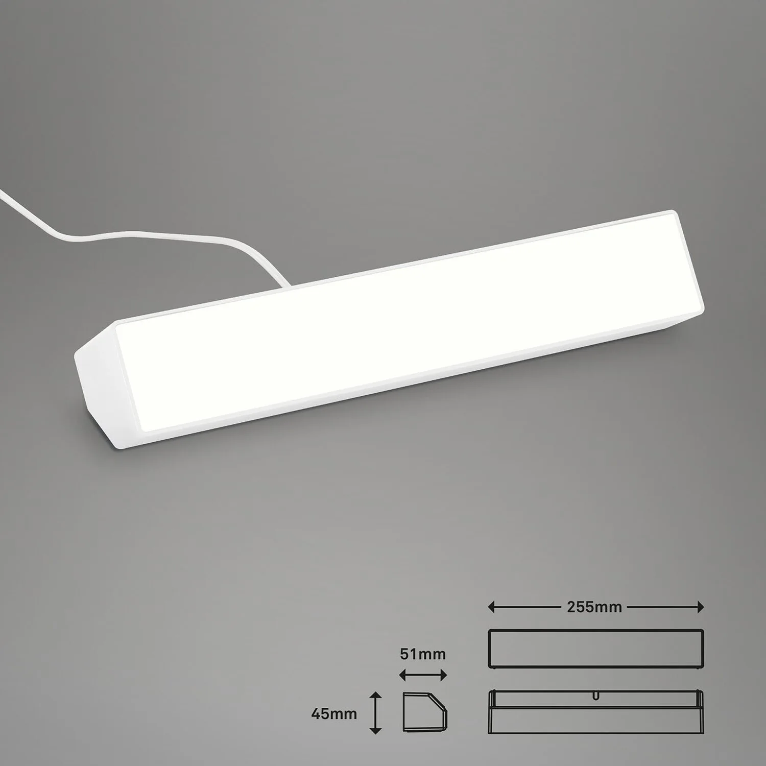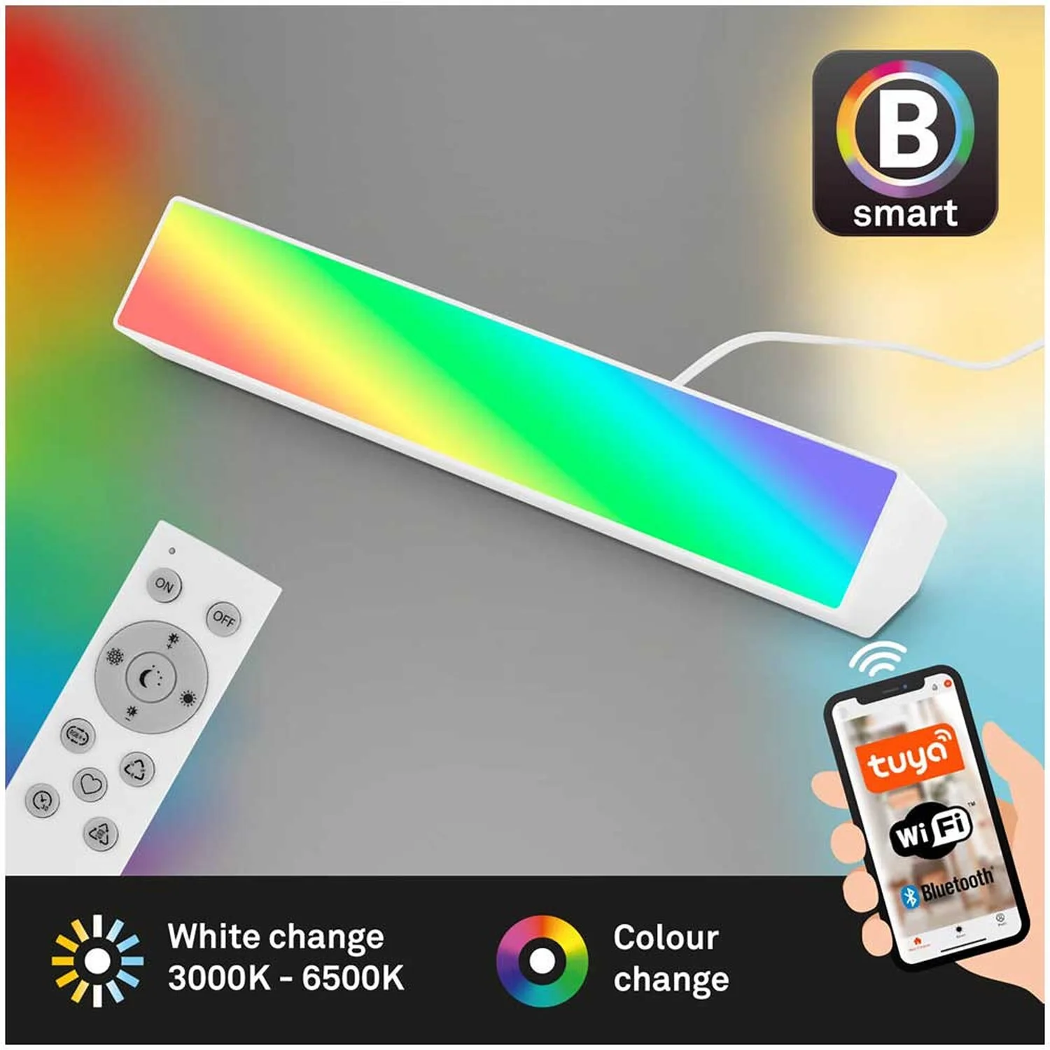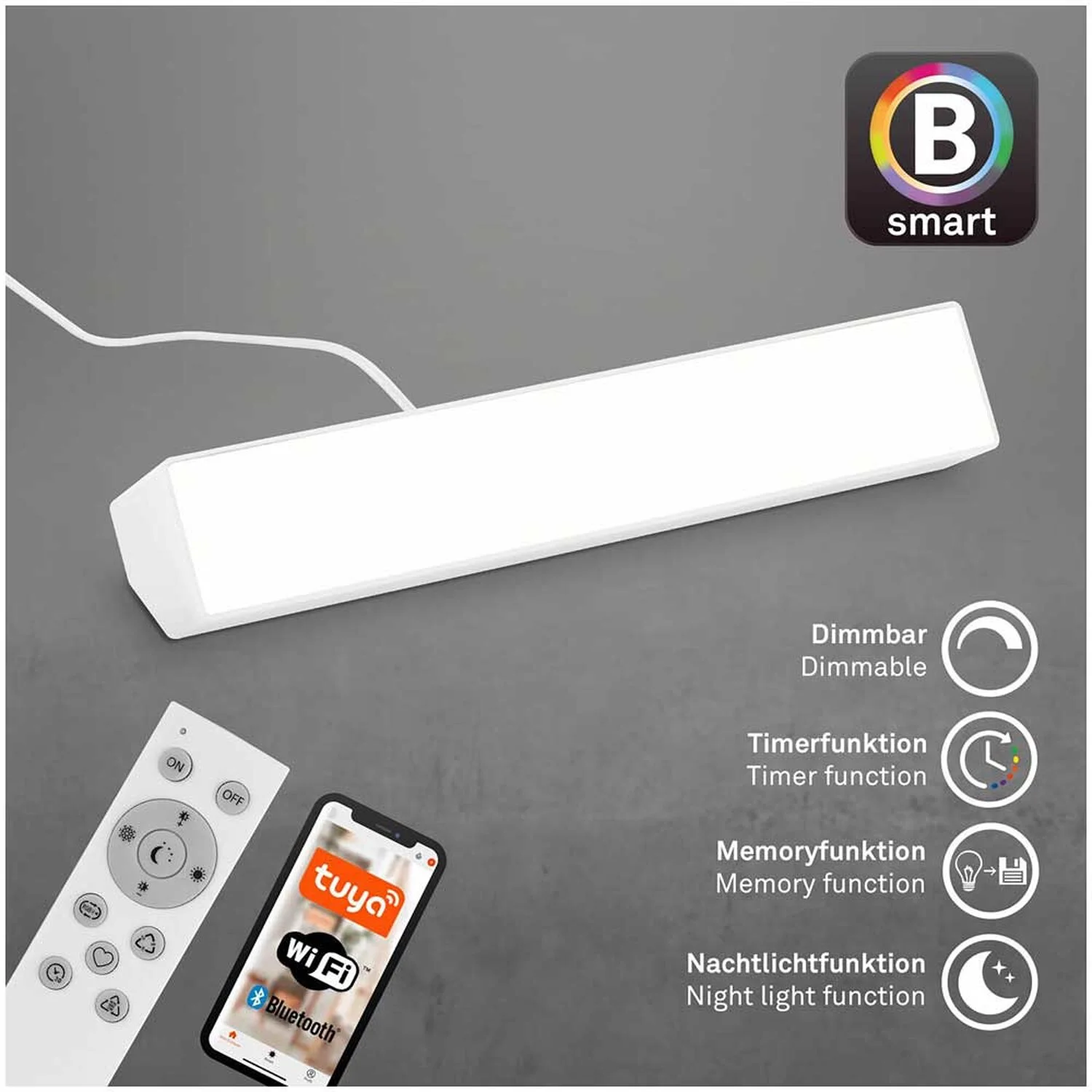Brilo B Smart – das neue Sortiment mit scheinbar endlosen Möglichkeiten der Lichtsteuerung – bietet mit dem Wallwasher Muro S einen modernen Hingucker in jedem Zuhause. Bringen Sie z. B. Ihr liebstes Kunstwerk zum Strahlen. Der Wallwasher ist ein wahrer Allrounder und kann nicht nur über die mitgelieferte Fernbedienung, sondern auch via App und Sprachsteuerung mit Amazon Echo und Google Home gesteuert werden. Dabei kann zwischen verschiedenen Farbtemperaturen (Warmweiss (3’000 K) bis Kaltweiss (6’500 K)), Farbprogrammen und Lichteffekten gewählt werden. Dazu kann die LED Leuchte auch stufenlos gedimmt werden. Somit können Sie ihr Licht immer auf die gewünschte Atmosphäre und Stimmung anpassen. Die Leuchte verfügt ausserdem über eine Nachtlicht- und Timerfunktion, die ebenfalls via App und Fernbedienung zu bedienen sind. Durch die integrierte Memoryfunktion kann sich die Leuchte die zuletzt genutzten Einstellungen merken und beim nächsten Einschalten wiederherstellen. Die eingebaute LED-Platine hat eine Leistung von 9 W und 850 lm. Darüber hinaus verfügt die Leuchte über eine lange Lebenszeit von 20’000 h. Die Masse der Leuchte betragen 255 x 51 x 45mm (LxBxH).