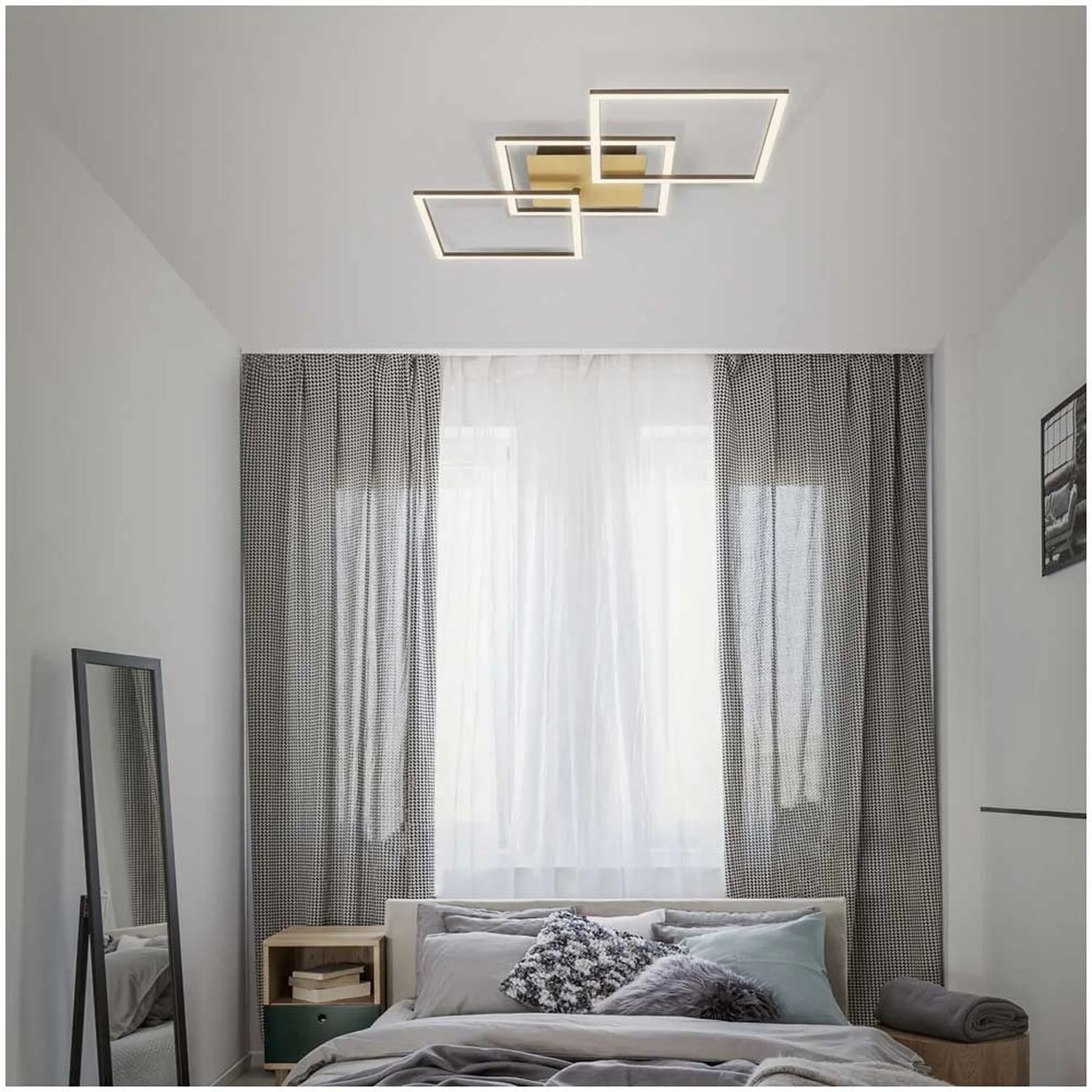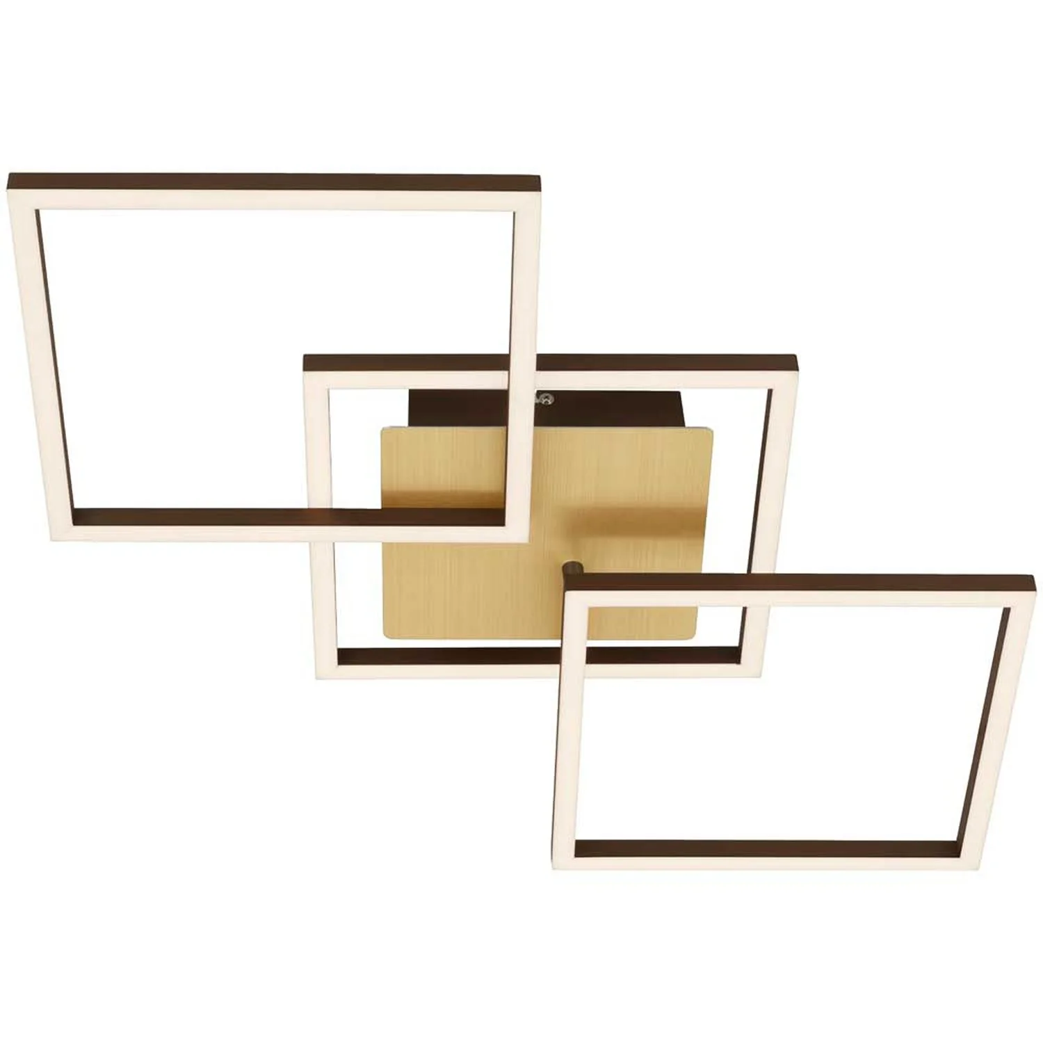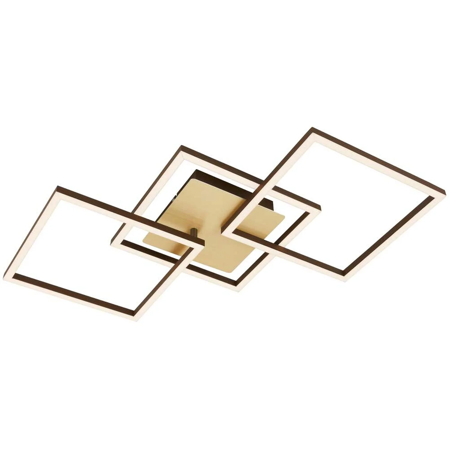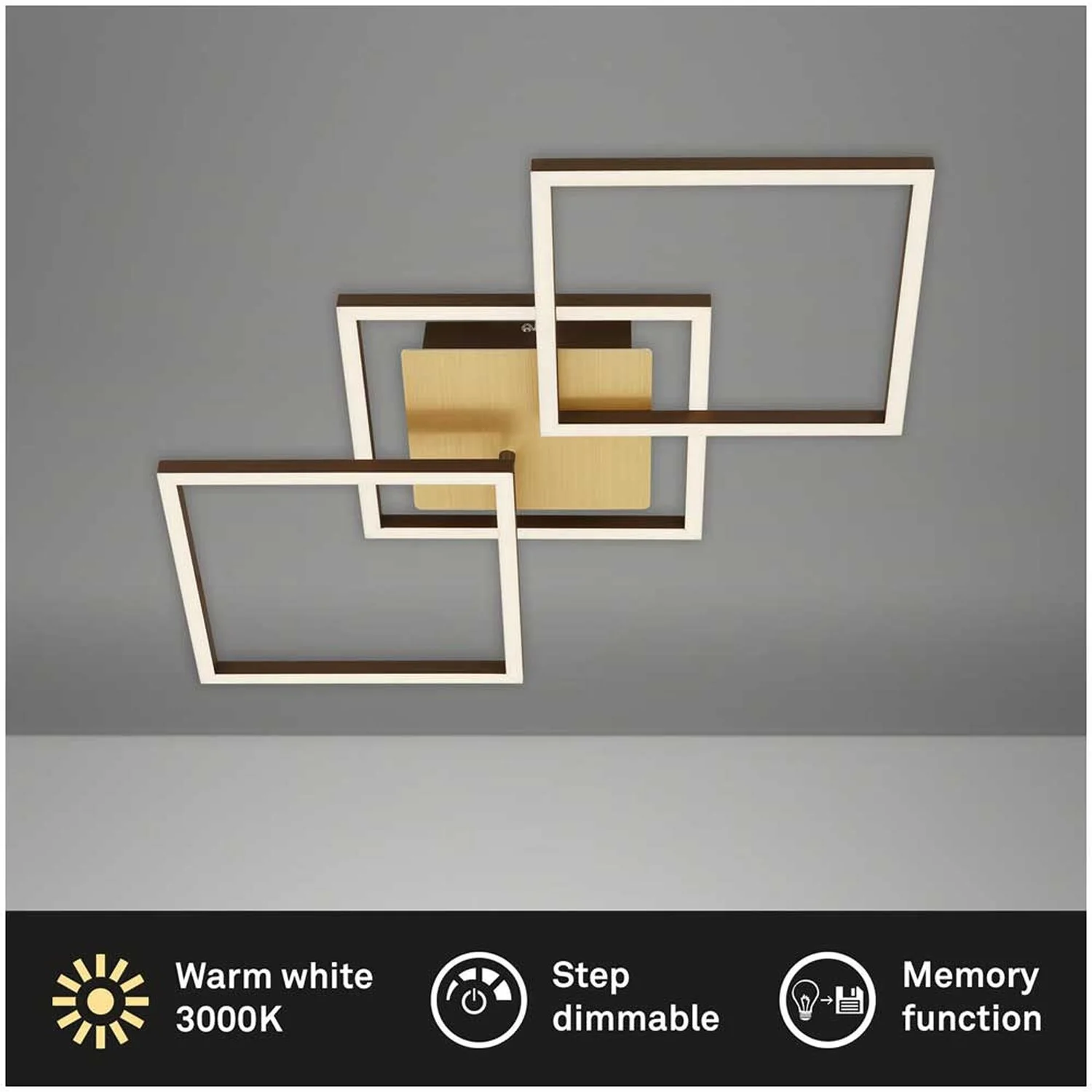 Die goldfarbene LED-Deckenleuchte der Serie Frame hat eine Gesamtleistung von 30 W und 3’900 lm und verfügt über beliebig drehbare Elemente, die individuell in die passende Form eingestellt werden können. Die Leuchte erstrahlt mit 3’000 K in einem angenehmen Warmweiss und kann über einen herkömmlichen Wandschalter in Stufen gedimmt werden.