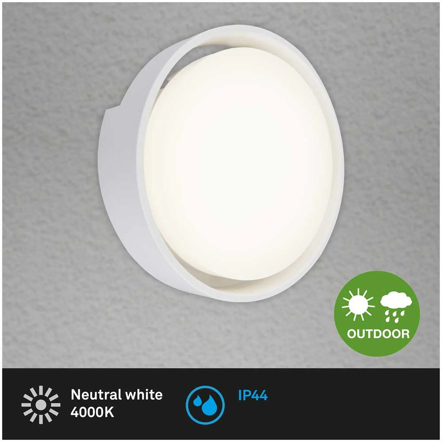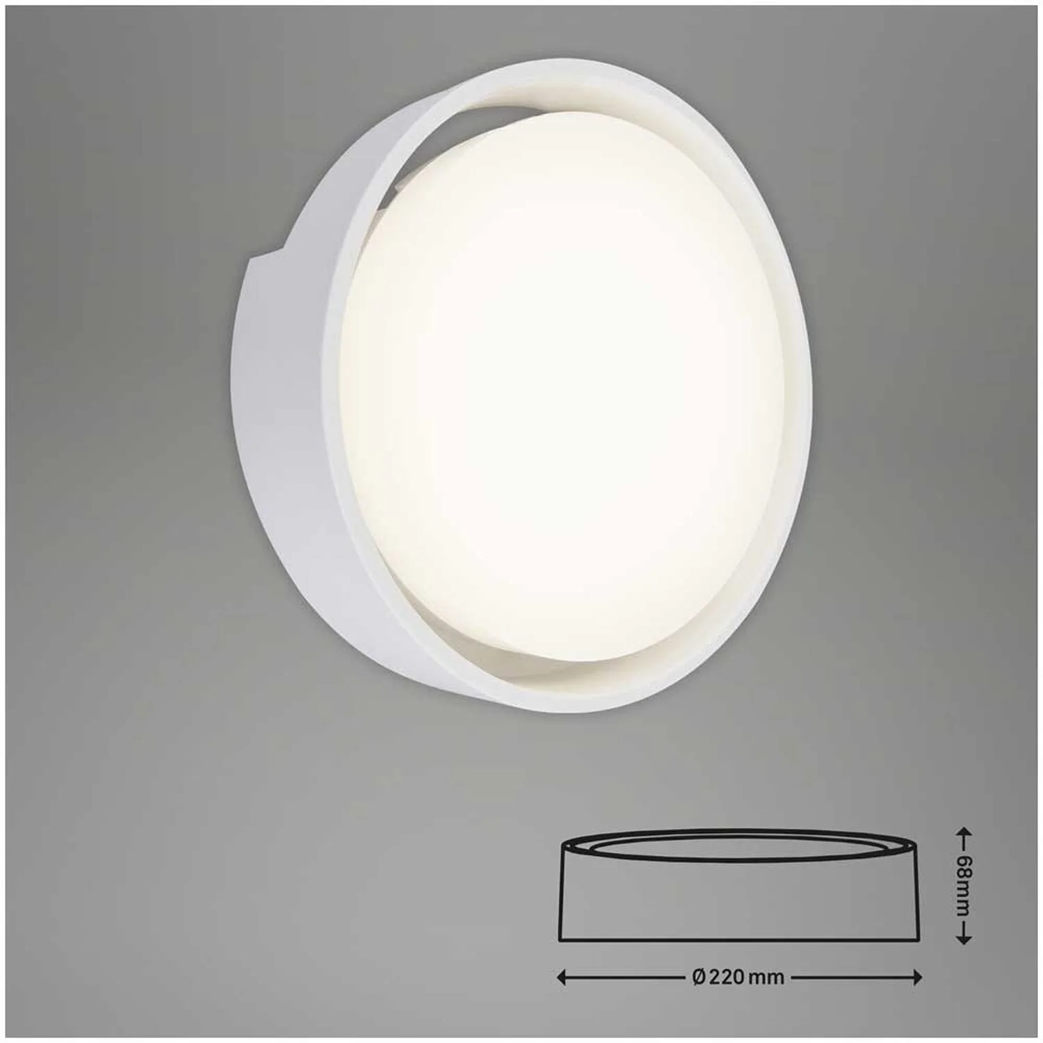 Die runde Brilo Aussenleuchte Genua in Weiss wirkt durch ihr schlichtes Design sehr elegant und passt an jede Hauswand. Die Leuchte enthält eine LED-Platine mit 18 W und 1’500 lm. Sie strahlt ein neutralweisses Licht aus und hat mit 25’000 h eine hohe Lebensdauer. Durch die Schutzart IP44 kann sie problemlos im Freien montiert werden und ist gut vor Regen geschützt. Die Leuchte hat einen Durchmesser von 220 mm und eine Höhe von 68 mm.