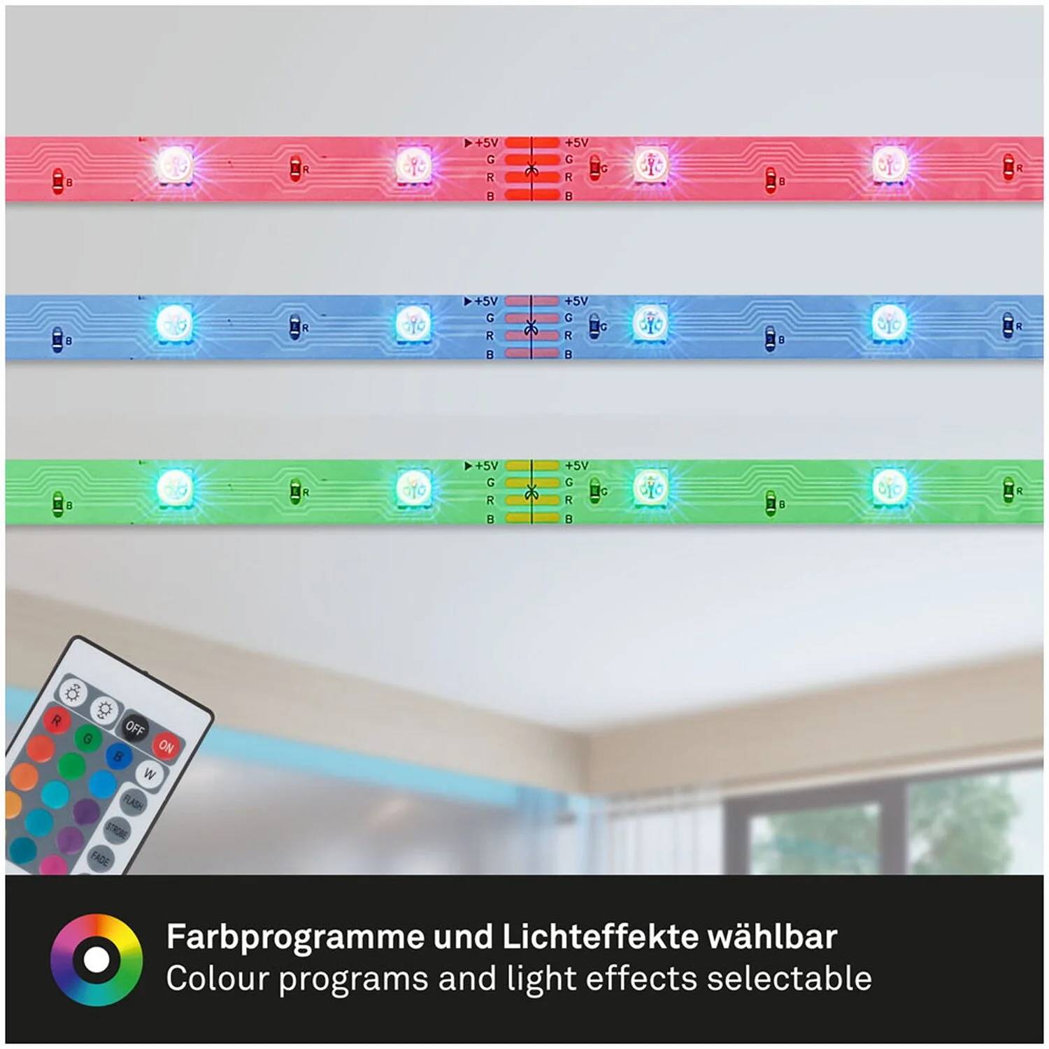 Das Brilo LED-Flexband USB mit 150 RGB-LEDs wird inklusive einer Fernbedienung geliefert. Auf insgesamt 5 m finden sich verschiedene RGB-Lichtfunktionen wieder. Das Band ist für die Verwendung in Innenräumen gedacht und ist selbstklebend. Darüber hinaus verfügt das LED-Band über einen USB-Anschluss und Kabel.