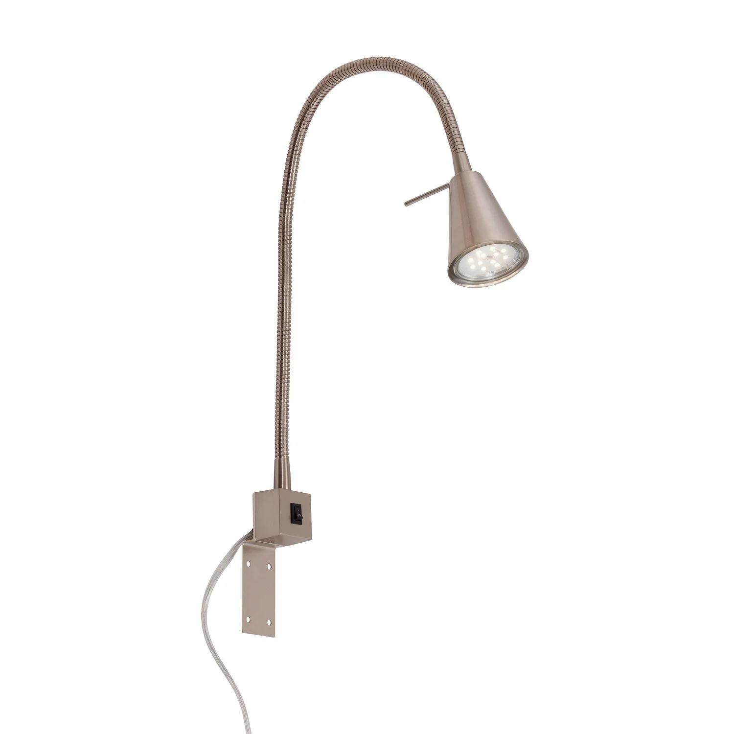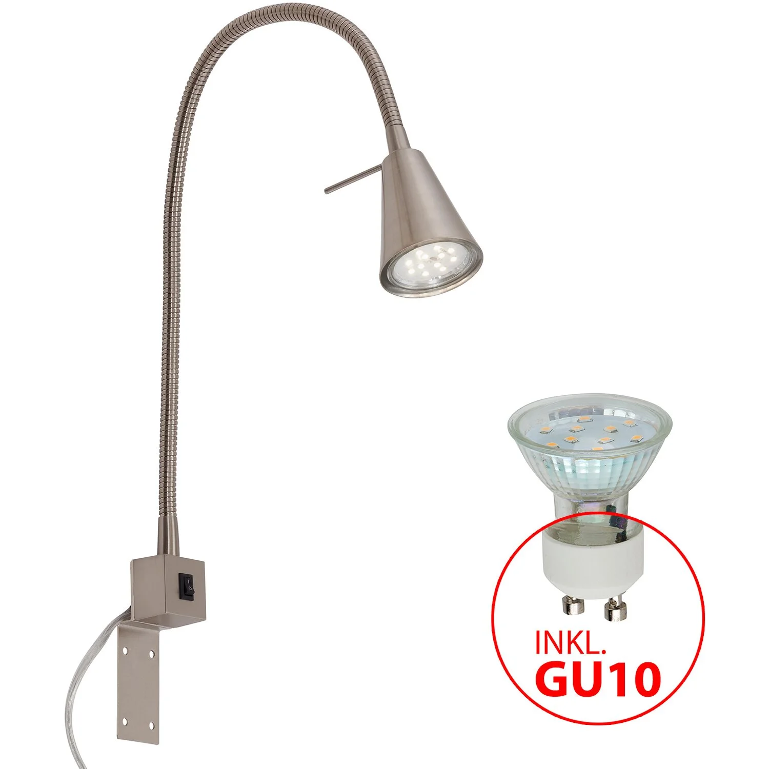 Die aus Metall gefertigte Bettleuchte in matt-nickel und kann super dazu verwendet werden, eine gemütliche Atmosphäre im Schlafzimmer zu erzeugen. Die GU10 Fassung ermöglicht es, dass Leuchtmittel mit ca. 4 Watt ausgewechselt werden können. Der Spotkopf kann in jede Richtung ausgerichtet werden. Ausserdem lässt sich der Leuchtarm so einstellen, dass das Licht an die gewünschte Stelle gelangt. Durch einen Kabelschalter ist es möglich, die Leuchte ein- und auszuschalten.