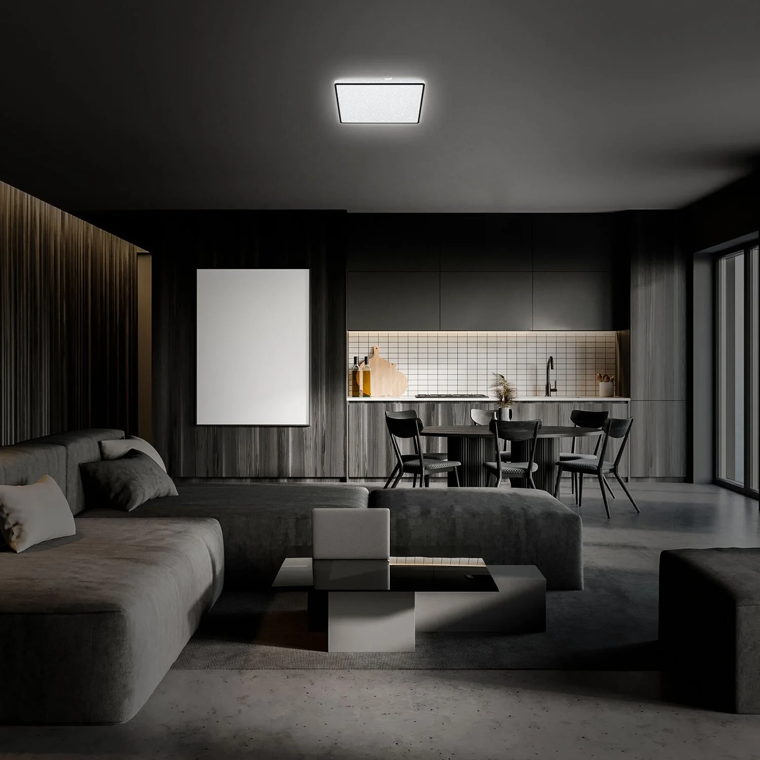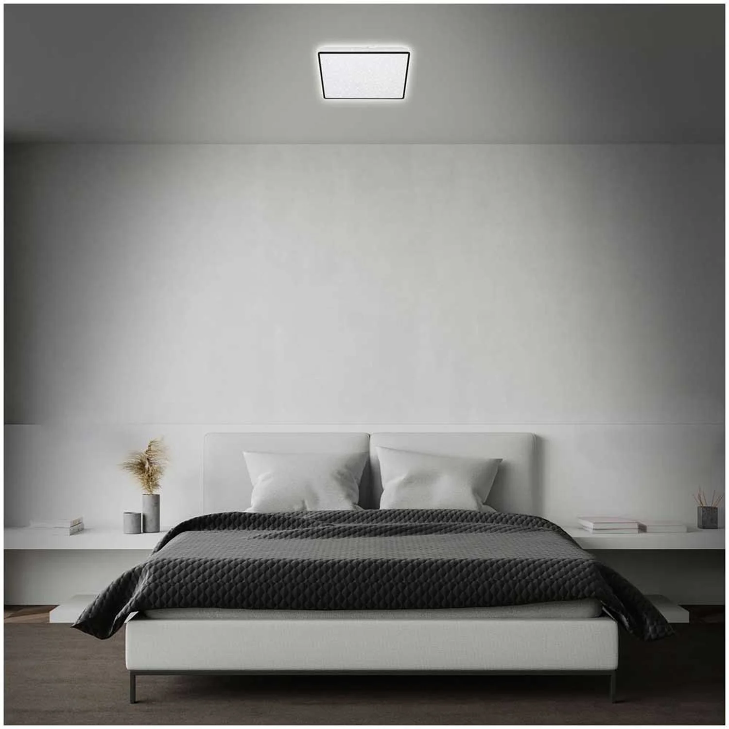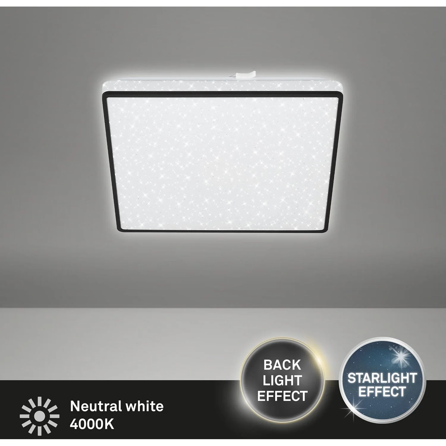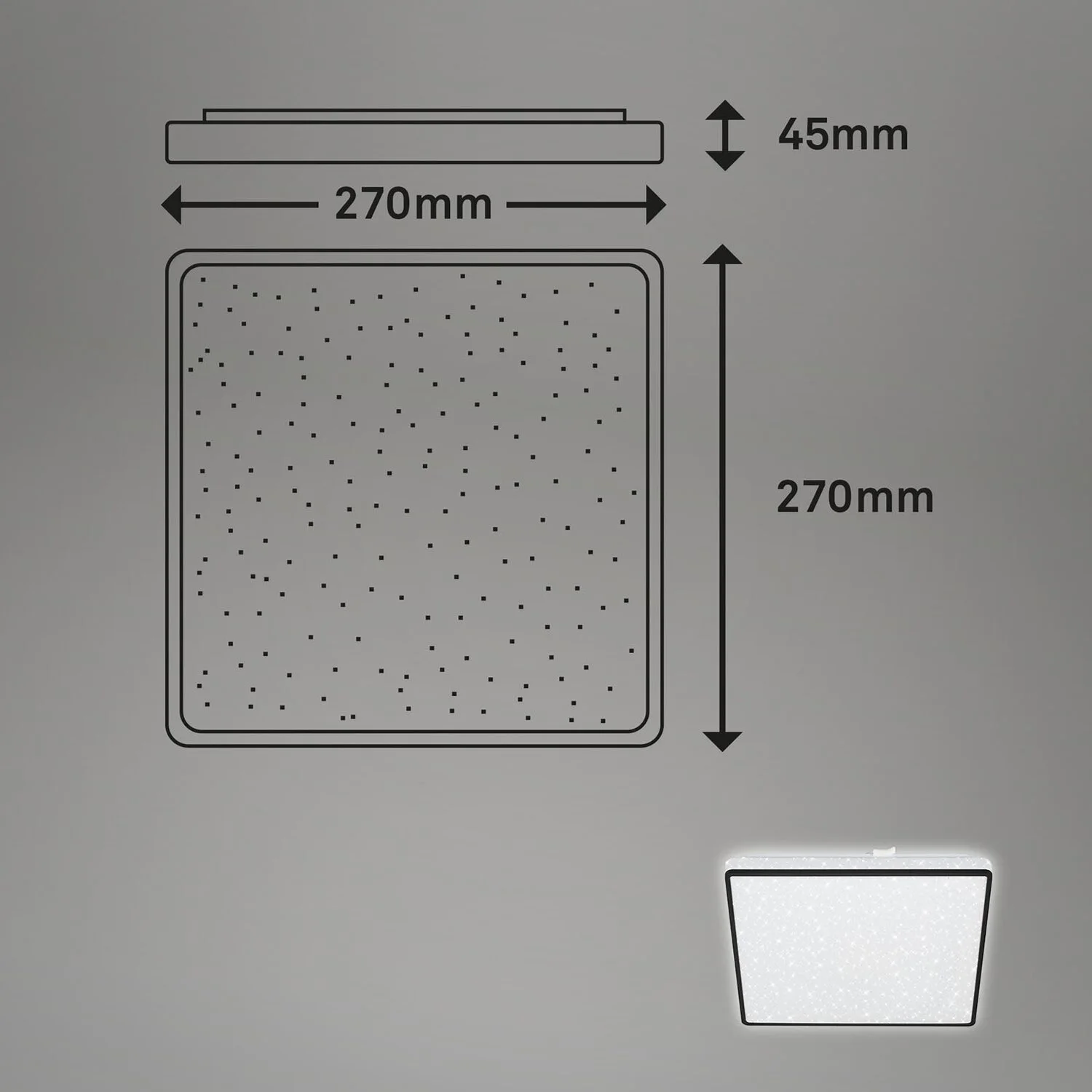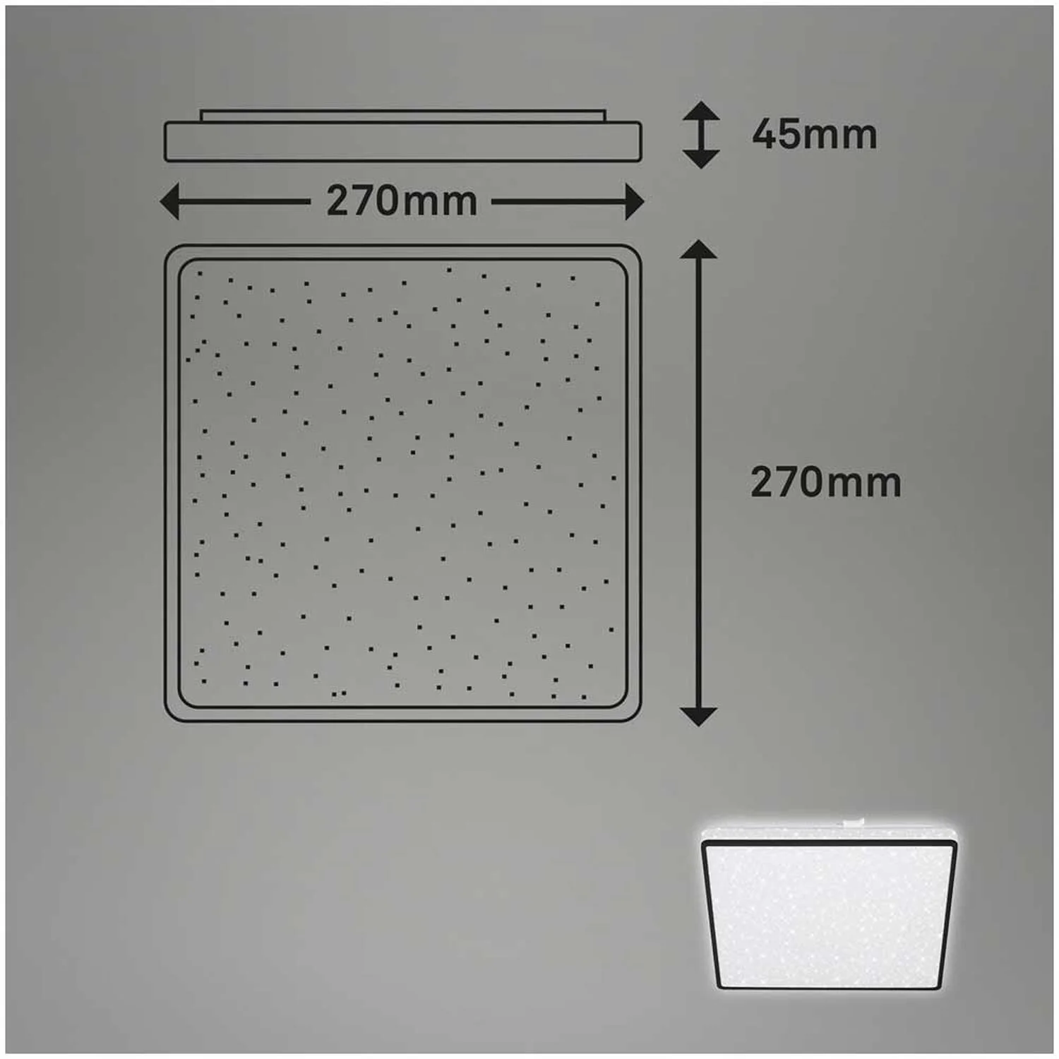 Die quadratische LED-Deckenleuchte Lino von Brilo verzaubert jeden Wohnraum mit ihrem Sterneneffekt und ihrem schwarzen Rahmen. Die eingebaute LED-Platine hat eine Leistung von 15 W und 1’800 lm. Die Lichttemperatur beträgt 4’000 K. Ausserdem verfügt die Leuchte über einen dekorativen Backlight-Effekt und eine lange Lebenszeit mit 2’000 h. Die Masse der Leuchte betragen (HxBxT) 45 x 270 x 270 mm.