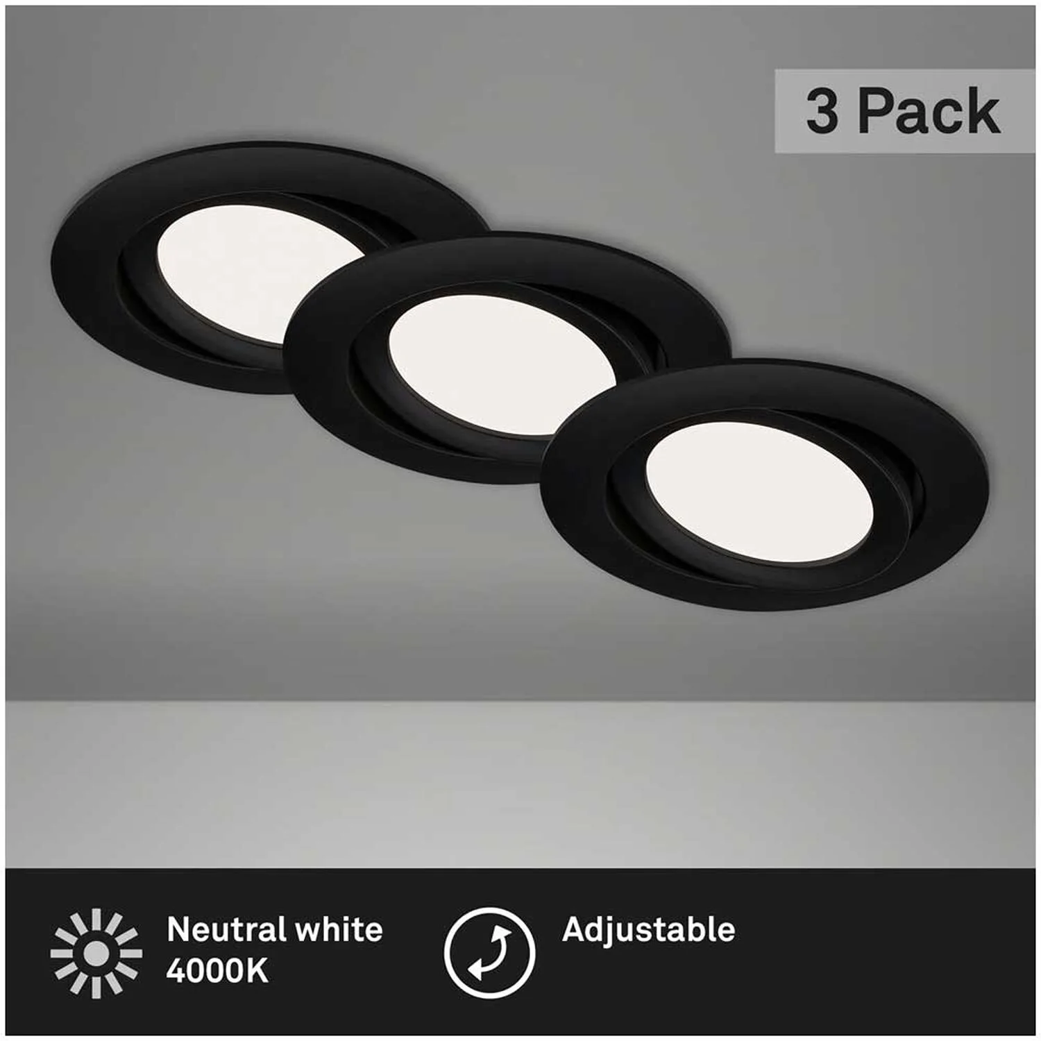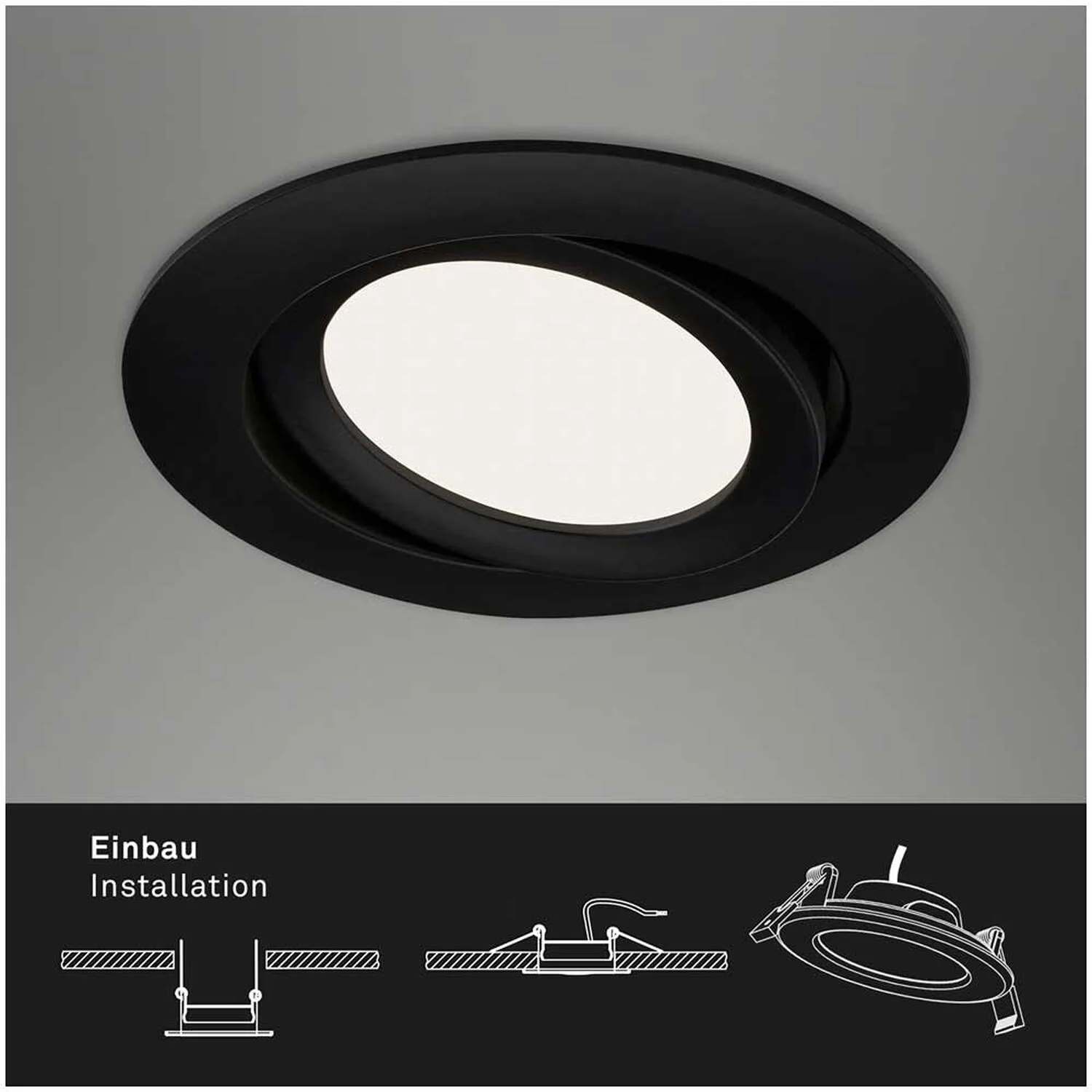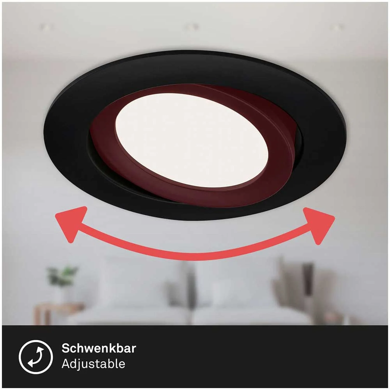 Leuchten Sie Ihren Wohnraum optimal aus. Mit der matten schwarzen LED-Einbauleuchte Flat In von Brilo sorgen Sie nicht nur für ein angenehm neutralweisses Licht (4’000 K), sondern Sie können diese durch die schwenkbaren LED-Module in die von Ihnen gewünschte Richtung schwenken. Die Leuchte hat eine Wattage von 7 W und eine Lichtstärke von 600 lm. Mit einer langen Lebensdauer von 25’000 h und der Schutzart IP23 ist sie nur für den Innenbereich geeignet. Die Leuchte kommt im praktischen Dreierset und hat einen Einbaudurchmesser von 86 mm sowie eine Einbauhöhe von 30 mm.