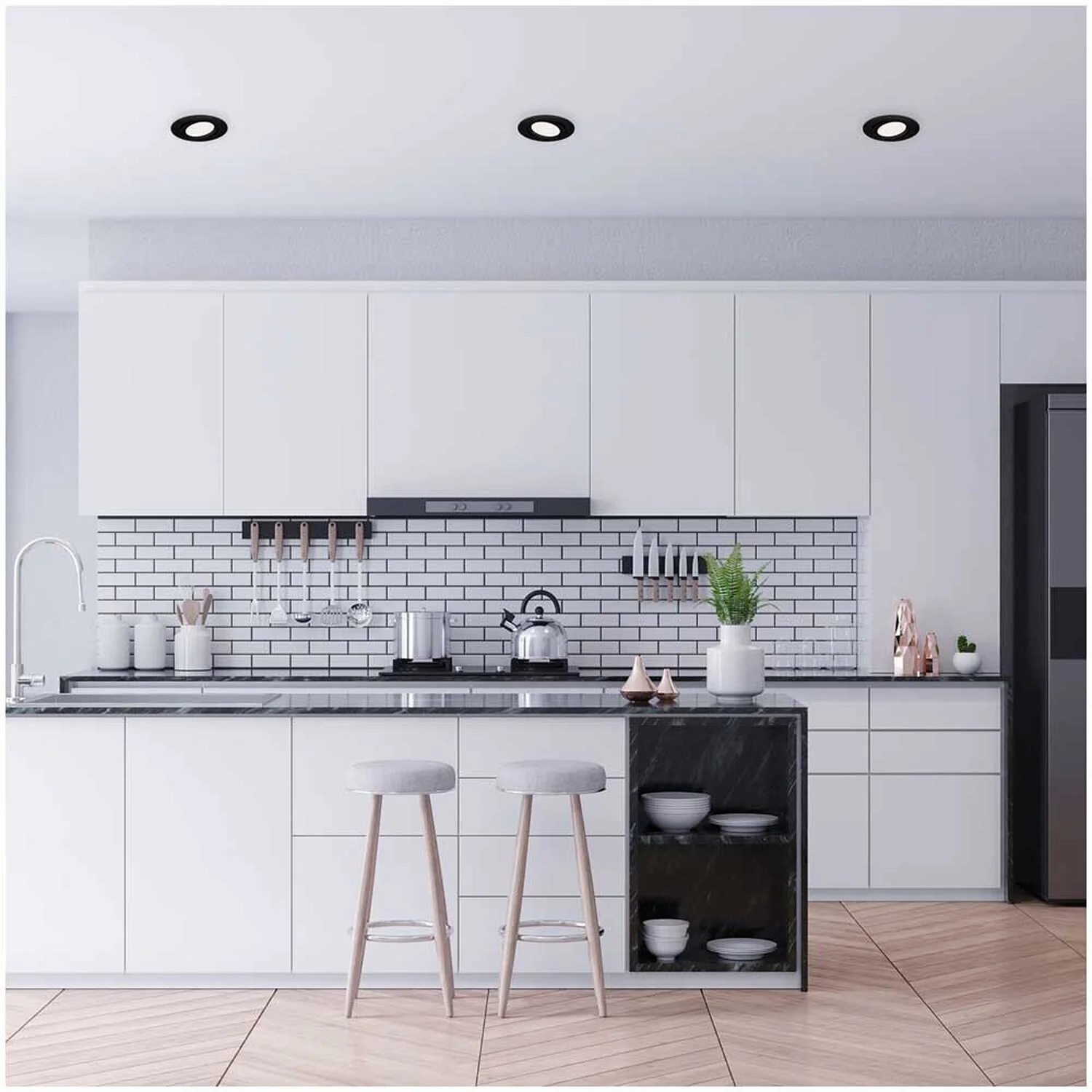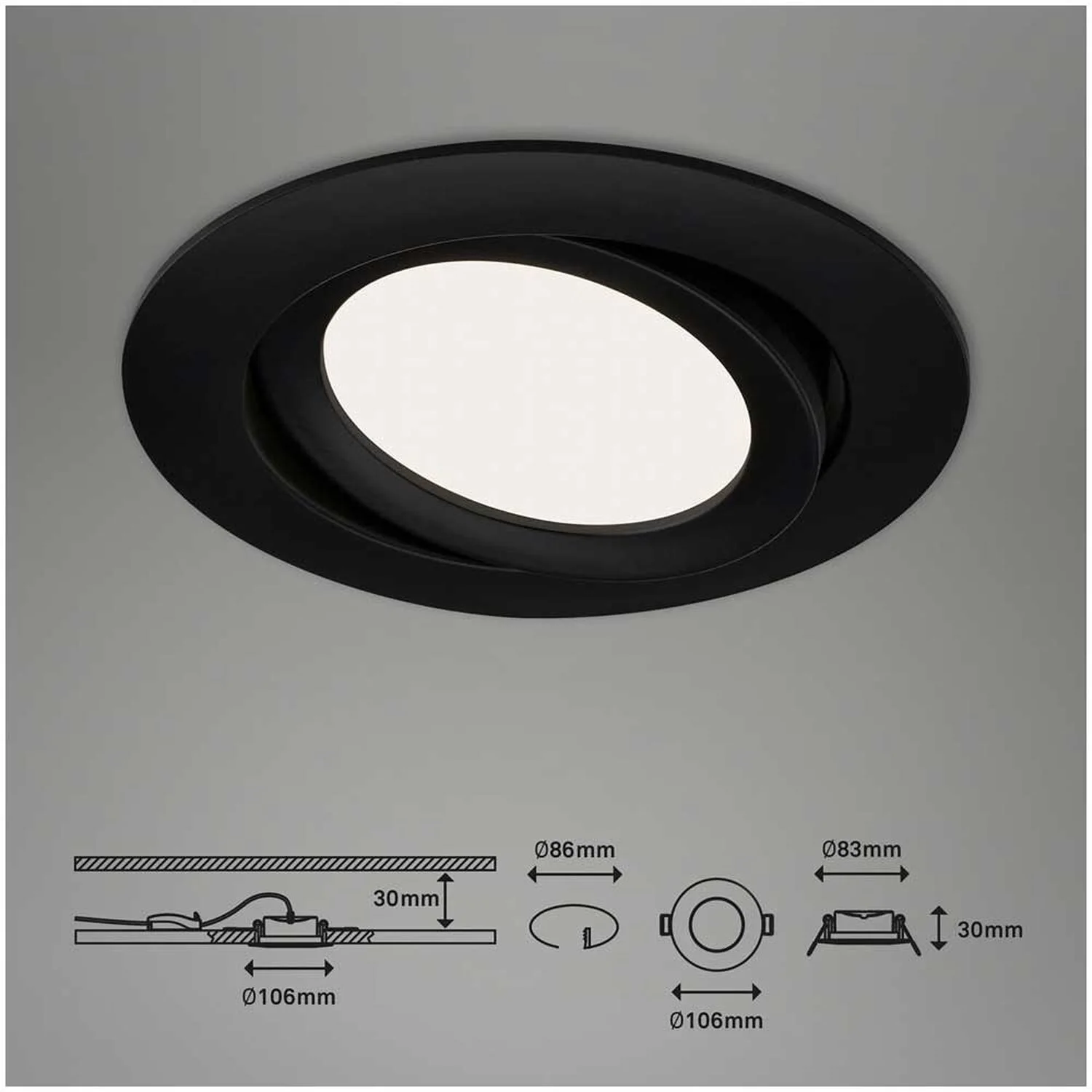 Leuchten Sie Ihren Wohnraum optimal aus. Mit der matten schwarzen LED-Einbauleuchte Flat In von Brilo sorgen Sie nicht nur für ein angenehm neutralweisses Licht (4’000 K), sondern Sie können diese durch die schwenkbaren LED-Module in die von Ihnen gewünschte Richtung schwenken. Die Leuchte hat eine Wattage von 7 W und eine Lichtstärke von 600 lm. Mit einer langen Lebensdauer von 25’000 h und der Schutzart IP23 ist sie nur für den Innenbereich geeignet. Die Leuchte hat einen Einbaudurchmesser von 86 mm und die Einbauhöhe beträgt 30 mm.