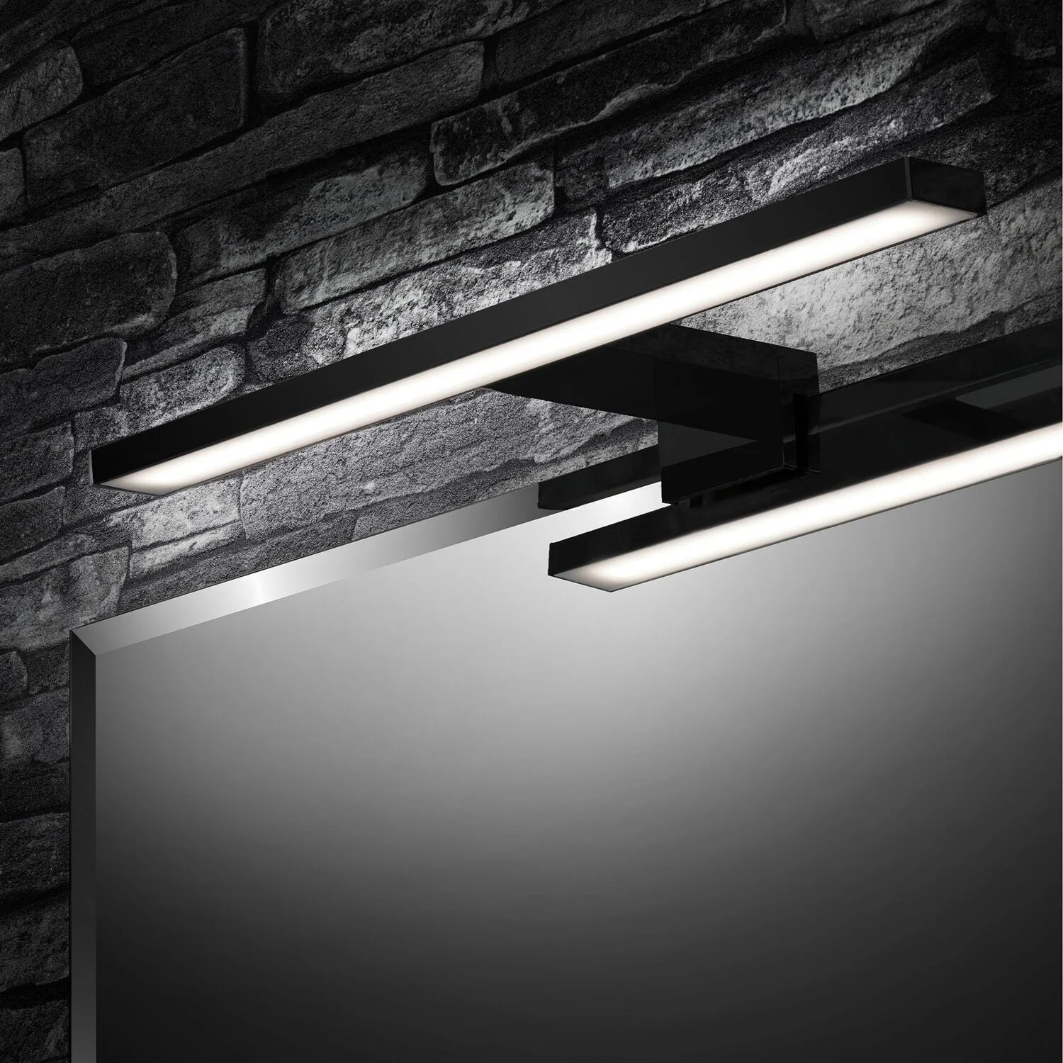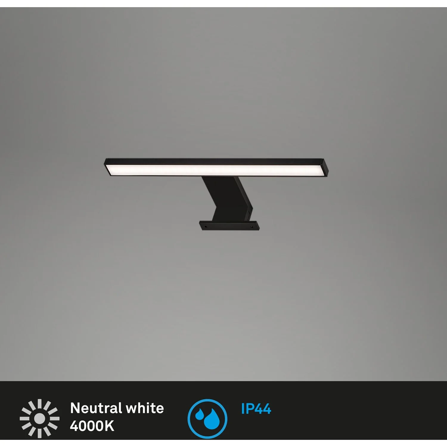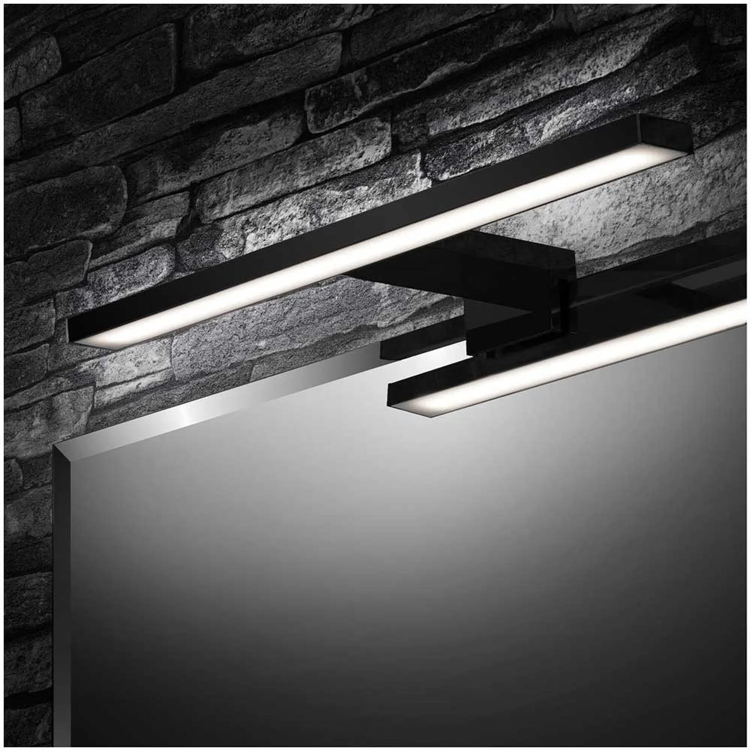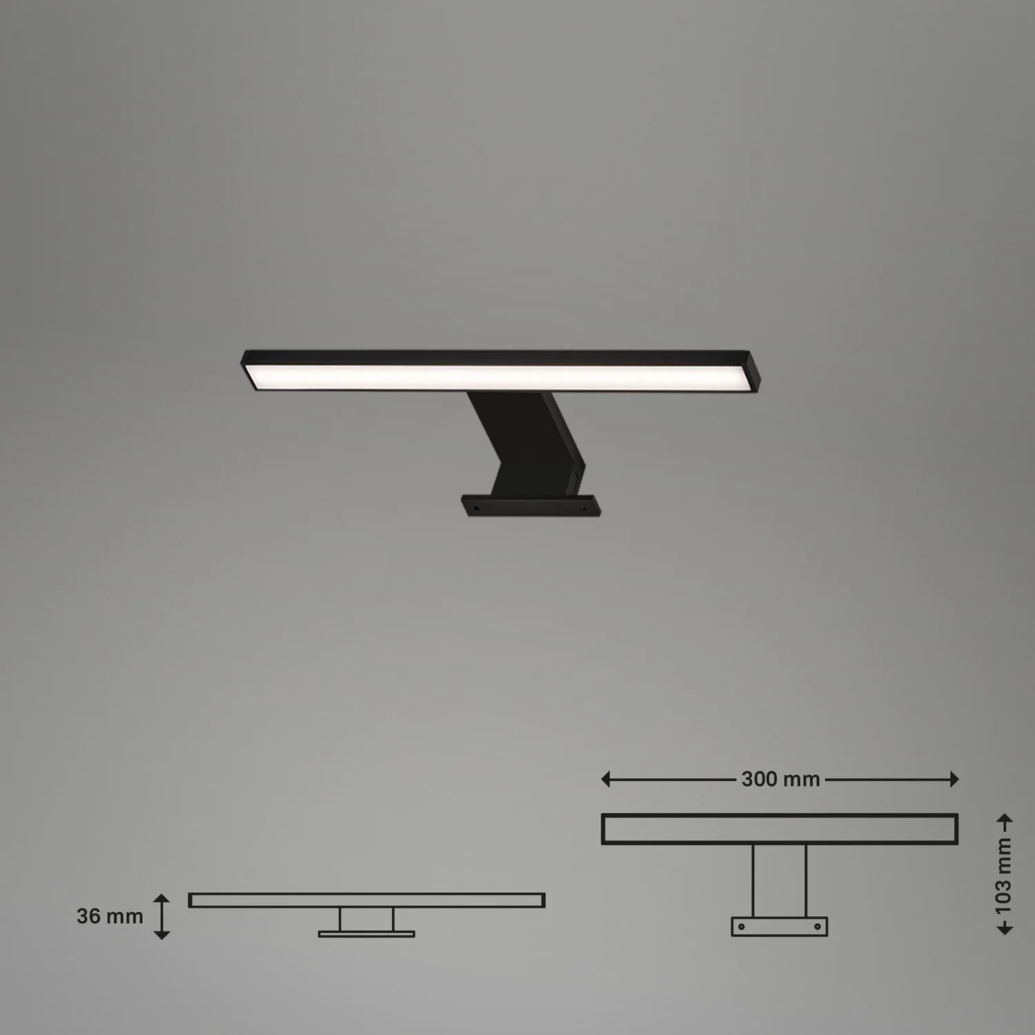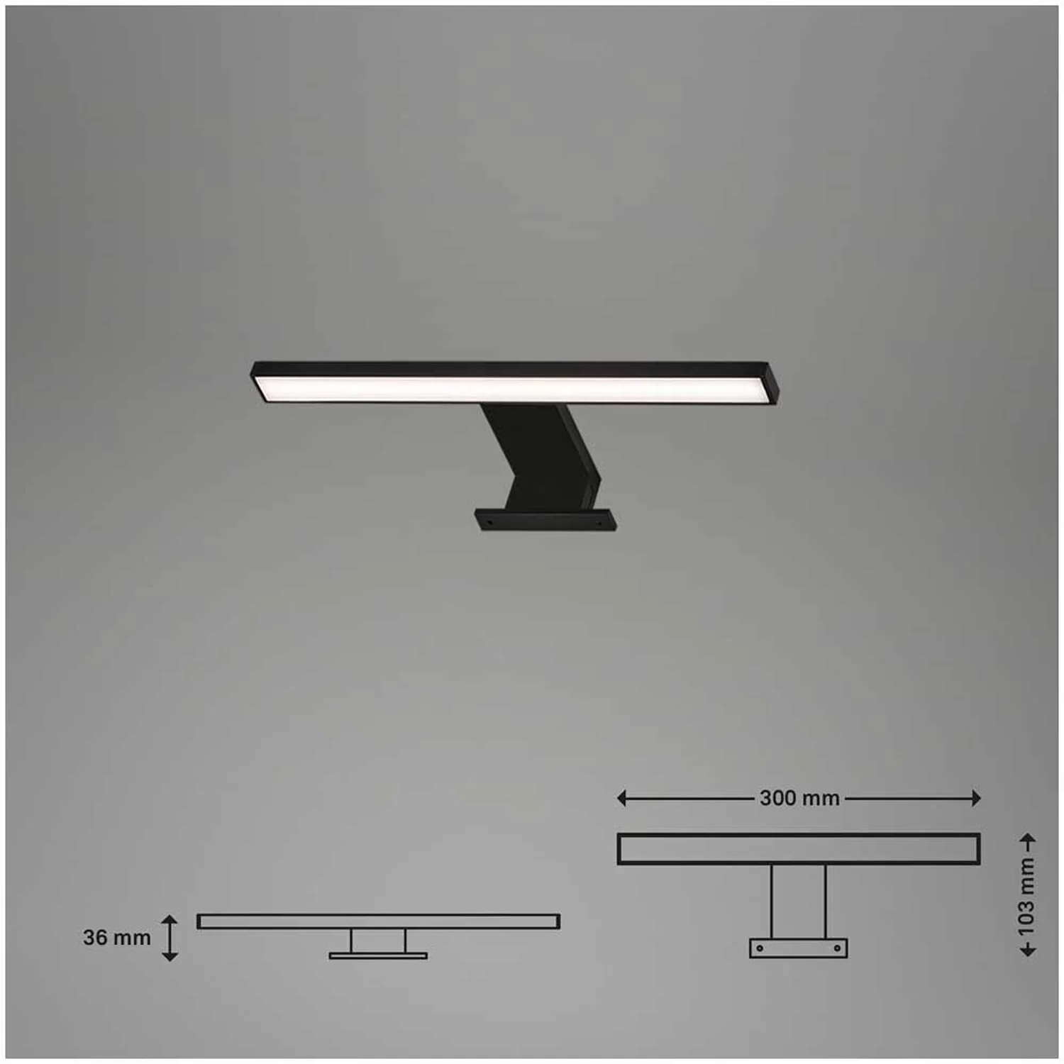 Die schwarze Spiegelleuchte Dun aus unserer Brilo Badserie besticht durch ihr modernes und schmales Design. Die eingebaute LED-Platine hat eine Leistung von 5 W und 500 lm und strahlt in einem angenehmen neutralweissen Licht (4’000 K). Die Leuchte ist durch die Schutzart IP44 spritzwassergeschützt und hat eine lange Lebensdauer von 25’000 h. Ausserdem wird sie für eine einfache Montage inklusive Aufbau- und Spiegelklemme geliefert. Die Masse der Leuchte betragen (HxBxT) 36 x 103 x 300 mm.