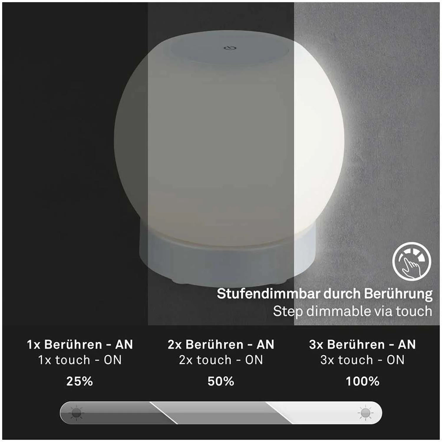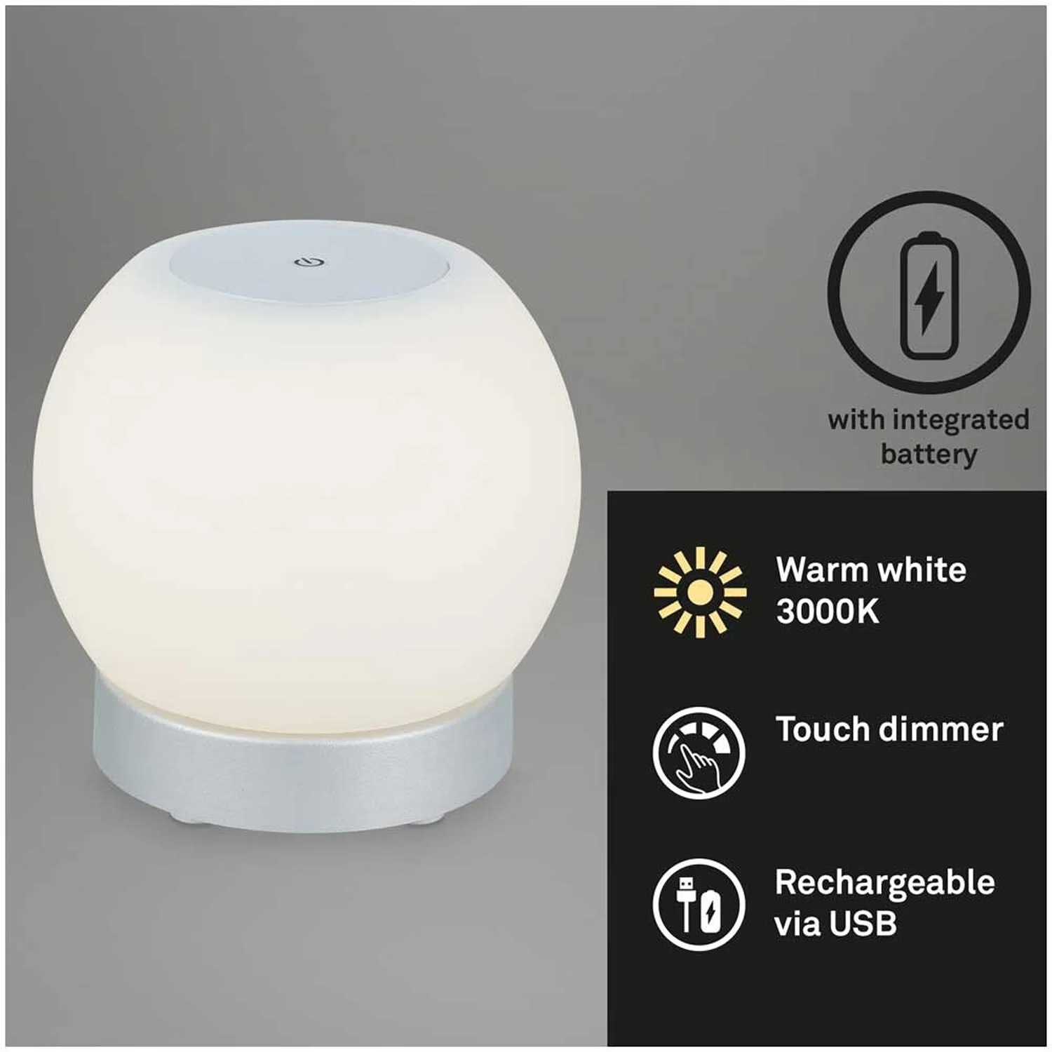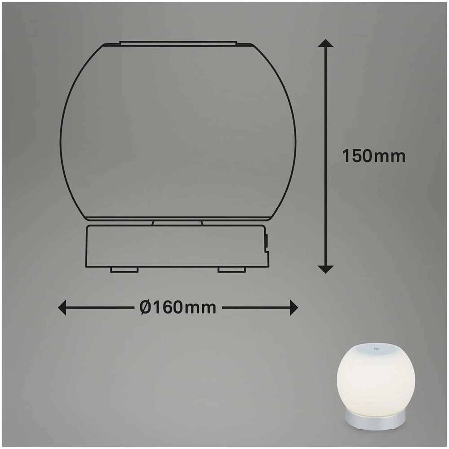 Die Akku-Tischleuchte Poka hat einen weissen Glasschirm, der wunderbar mit seinem chrom-matten Standsockel harmoniert. Durch den Akkubetrieb kann sie flexibel und vielseitig eingesetzt werden. Ob im Wohnzimmer, auf der Fensterbank, als Tischdeko, auf der Terasse oder sogar beim Camping, sie ist ein echter Wegbegleiter. Ihr eingebautes LED-Modul erstrahlt mit 3 W und 330 lm. Via Touchschalter ist die Leuchte in drei Stufen dimmbar und kann darüber auch ein- und ausgeschaltet werden. Ihr warmweisses Licht (3’000 K) bietet eine schöne gemütliche Lichtatmosphäre. Aufladbar ist die Leuchte über USB und wird inklusive USB-Kabel (2 m) geliefert. Die Leuchte hat einen Durchmesser von 160 mm und eine Höhe von 150 mm.