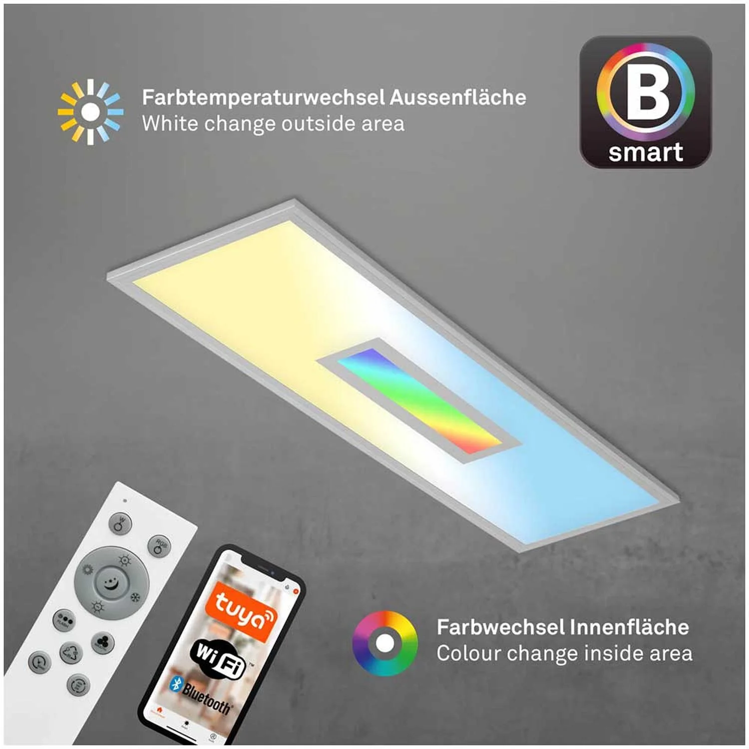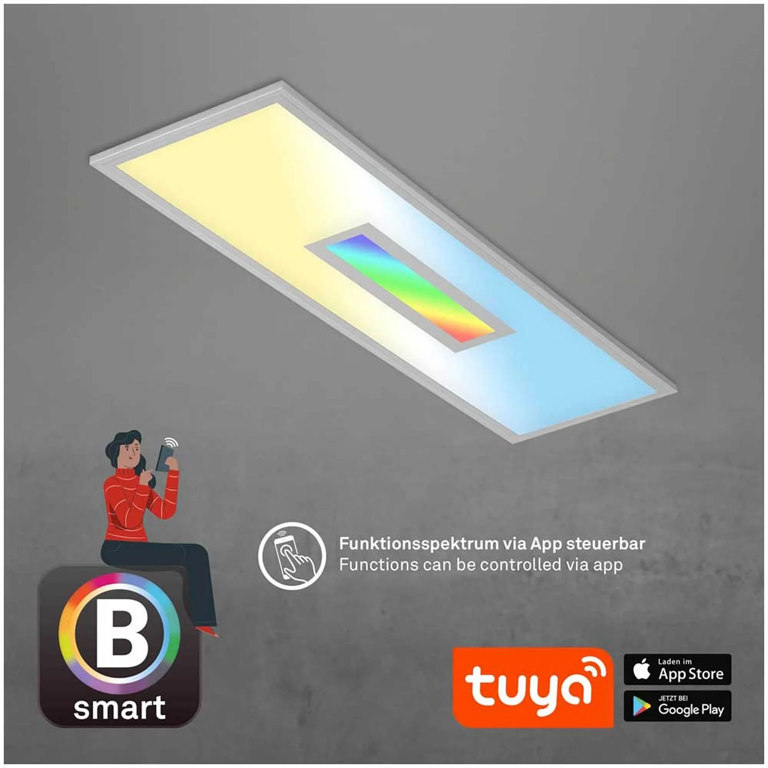 Diese smarte Deckenleuchte der Serie Centro S mit silbernen Rahmen ist vielseitig einsetzbar z. B. als Wohnzimmerlampe oder Schlafzimmerleuchte. Per mitgelieferter Fernbedienung ist die Leuchte bequem vom Sofa aus anzusteuern. Besonders die Sprachsteuerung über Ihren Sprachassistenten, sowie die smarte Steuerung per App über Ihr Smartphone macht diese Leuchte besonders. Die Leuchte hat eine verstellbare Lichttemperatur zwischen 2’700 und 6’500 K. Die ausgewählten Farbtemperaturen werden durch die Memoryfunktion automatisch abgespeichert. Das Highlight der Leuchte ist der separat steuerbare Innenbereich der Leuchte, welcher in bunten RGB-Farben leuchten kann. Die Wohnzimmerleuchte hat die Schutzart IP20. Mit den Produktabmessungen (HxBxT) 60 x 1’000 x 250 mm ist sie zudem extrem flach.
