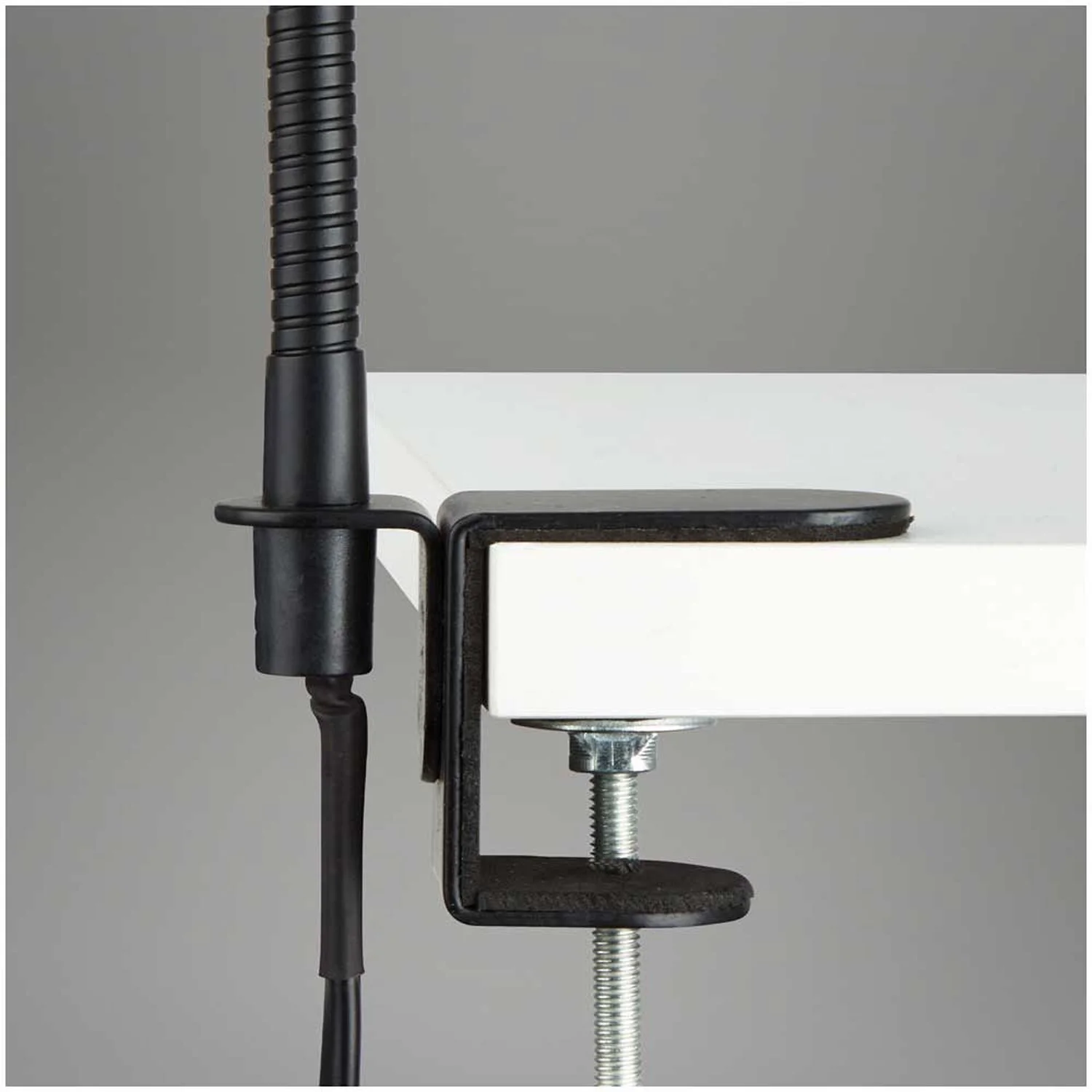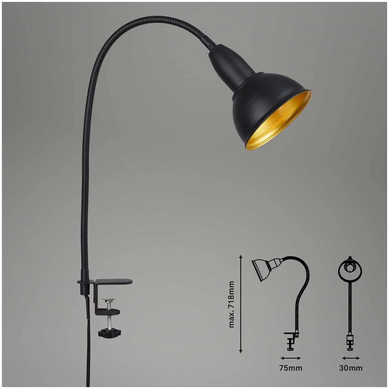 Die schwarz-goldene Klemmleuchte Hygge aus der Serie Comfort Light ist eine klassische Retro-Klemmleuchte. Sie kann zum Beispiel direkt am Nachttisch oder Schreibtisch montiert und somit als Leselicht genutzt werden. Die Leuchte lässt sich an ihrem Kabelschalter bequem ein- und ausschalten. Durch einen inkludierten Flexarm und eine Schlauchlänge von 50 cm ist die Lichtposition individuell einstellbar. Die Leuchte wird ohne Leuchtmittel geliefert.