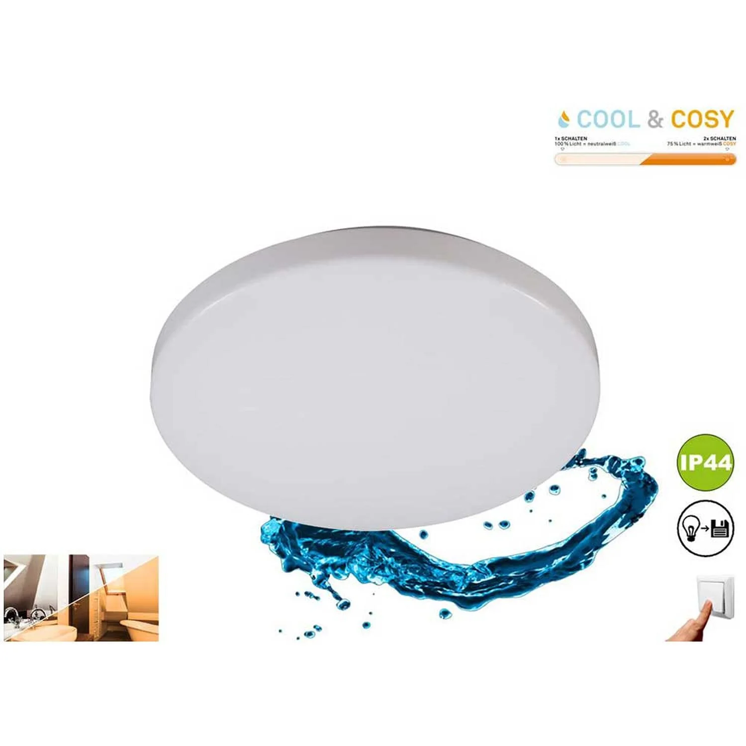 Cool and Cosy – die moderne LED Badleuchte wird trotz ihres schlichten Designs auch in Ihrem Badezimmer zu einem echten Hingucker. Dank der Lichttemperatursteuerung und der Dimmfunktion (4’000 Kelvin – Neutralweiss – 100 %, 2’700 Kelvin – Warmweiss – 75 %) zaubert die LED Deckenlampe ein perfektes Ambiente – einfach zum Wohlfühlen. Mithilfe der Memoryfunktion kehren Sie blitzschnell zu der von Ihnen zuletzt gespeicherten Einstellung zurück. Bei sparsamen 12 Watt Leistungsaufnahme liefert die LED Badlampe einen Lichtstrom von 1’200 lm. Die festverbaute LED-Platine überzeugt mit einer durchschnittlichen Lebensdauer von ca. 20’000 Stunden. Durch die Schutzart IP44 ist die Badleuchte vor Feuchtigkeit und Wasser geschützt.