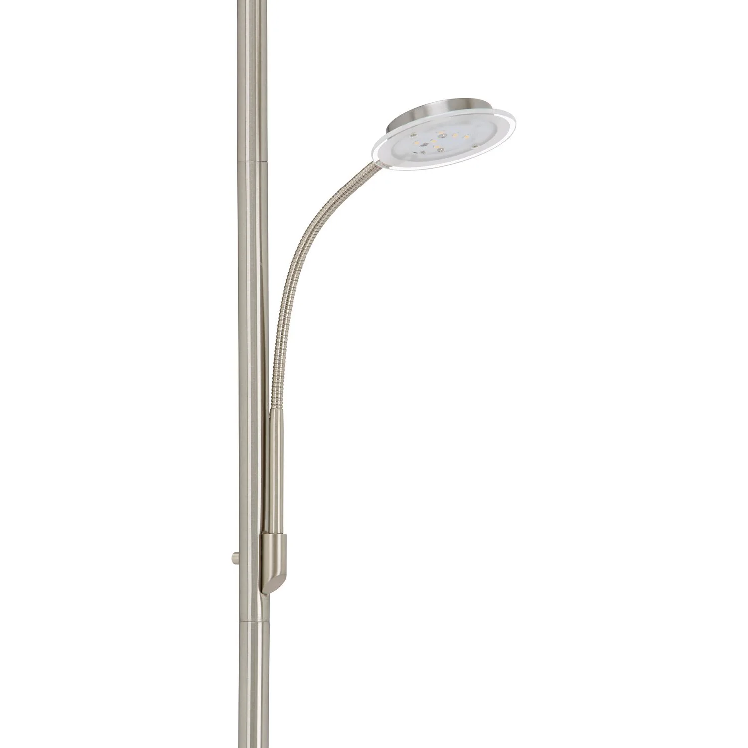 Der Briloner LED-Deckenfluter Floor Rund überzeugt durch modernes Design und hohe Funktionalität. Er ist aus Metall in matter Nickel-Optik sowie Kunststoff gefertigt und verfügt über einen zusätzlichen Lesearm. Besonders vorteilhaft ist der 3-geteilte runde Fluterkopf. Jedes Element lässt sich individuell schwenken. Je nach Ausrichtung können Sie immer wieder neue leuchtende Akzente in Ihren Wohnräumen setzen, denn im Vergleich zu den üblichen Deckenflutern, die das Licht nur starr nach oben abgeben, erreichen Sie mit dem eleganten Briloner LED-Deckenfluter ein Höchstmass an flexibler Innenraumbeleuchtung. Er leuchtet Ihr Wohnzimmer mit kraftvollen 2’000 lm aus. Zudem ist er über einen Touchdimmer stufenlos dimmbar. Die flexible Leseleuchte verfügt über einen Touchschalter zum Ein- bzw. Ausschalten.