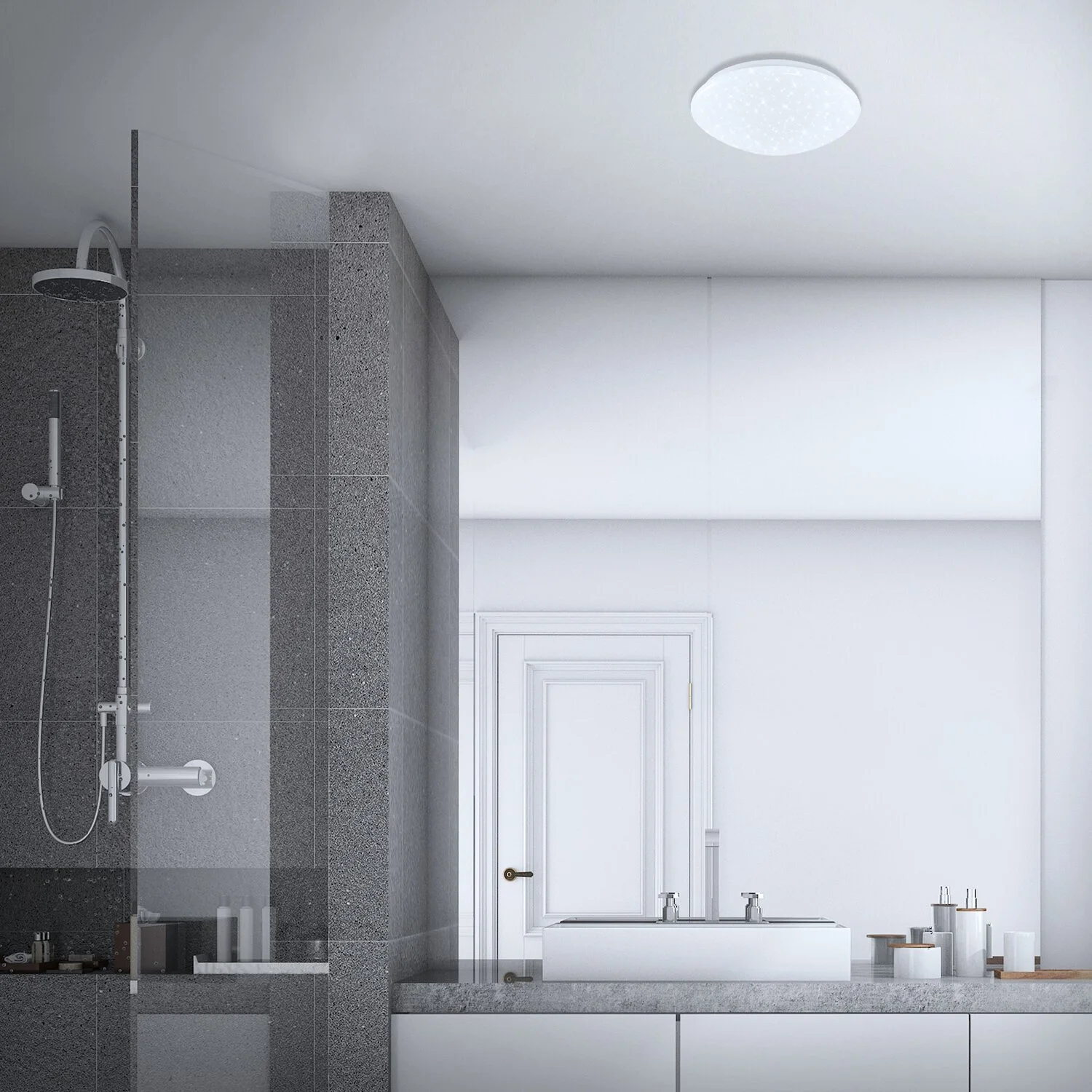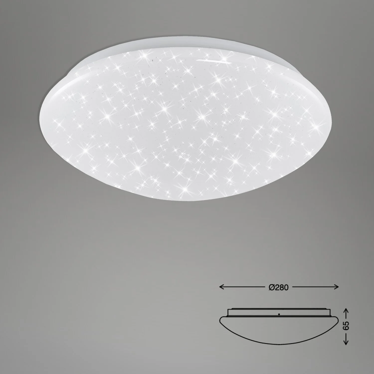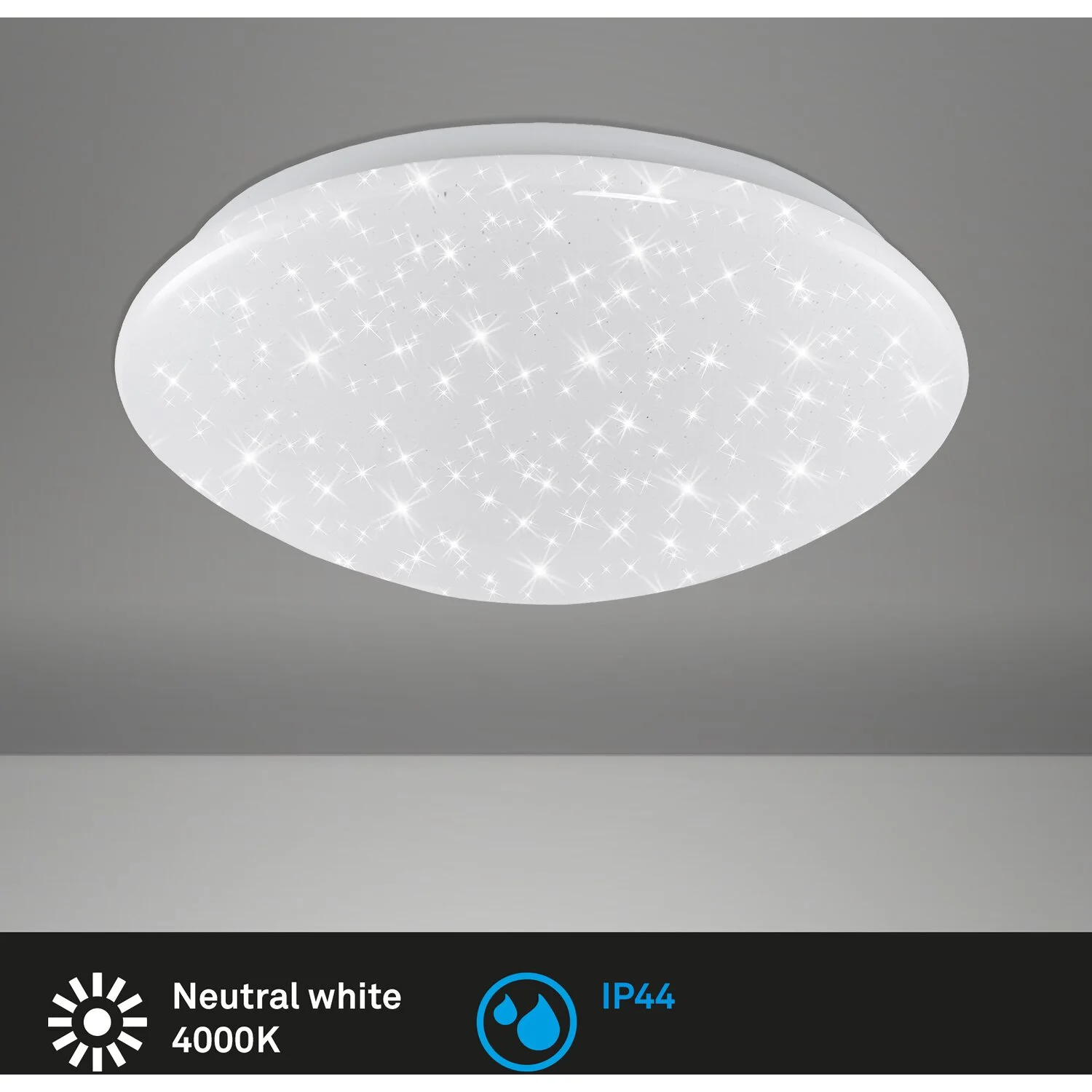 Die Briloner LED-Deckenlampe Brilo Bath Weiss fügt sich mit ihrem modernen, aber trotzdem schlichten Design ideal in jedes Zimmer ein – egal ob Kinder-, Schlaf- oder Wohnzimmer. Mit 1’200 lm und 4’000 K sorgt sie für ein ausreichend helles Licht im ganzen Raum. Durch den Sternenhimmel, der beim Einschalten der Lampe erscheint, wird eine gemütliche Atmosphäre geschaffen. Das Leuchtmittel ist festverbaut und überzeugt mit einer hohen Lebensdauer von bis zu 25’000 Std.