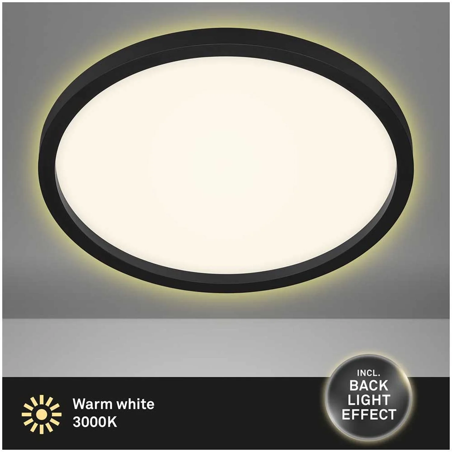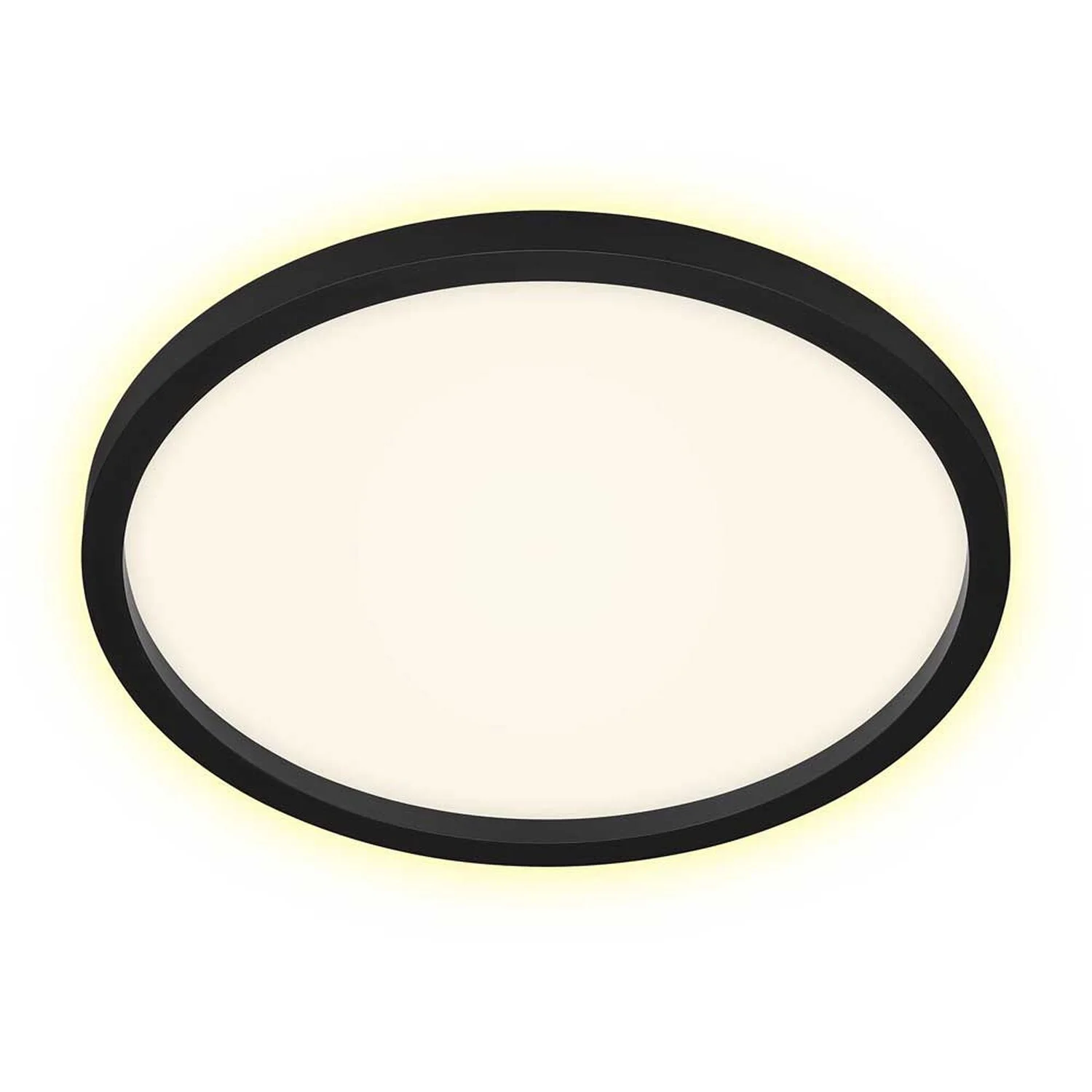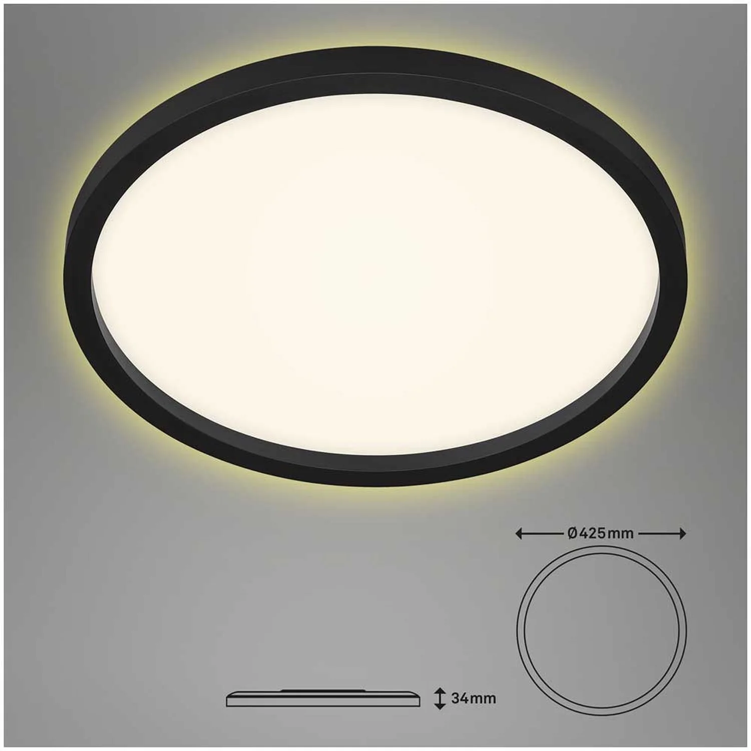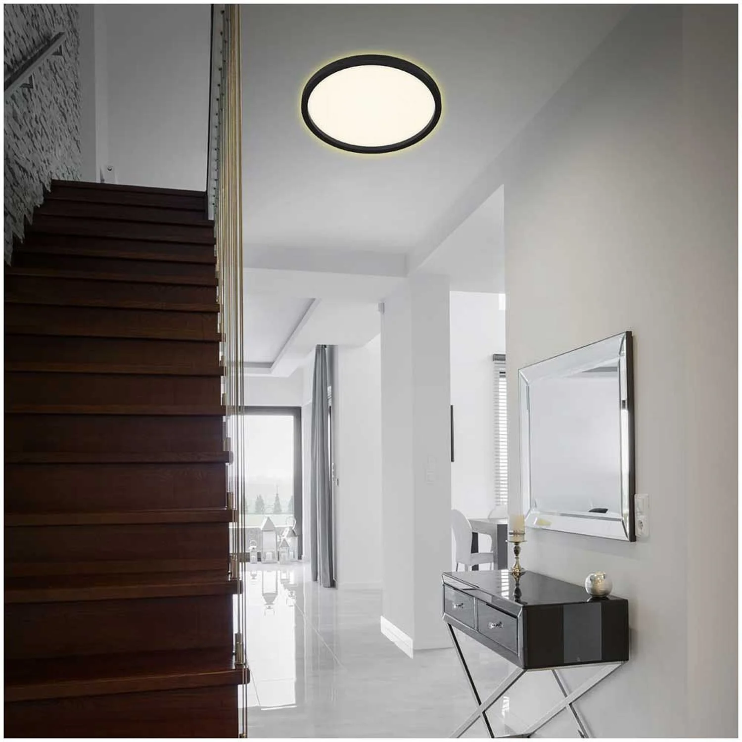 Die Deckenleuchte Cadre in Schwarz ist trotz ihres schlichten Designs durch den sogenannten Backlight-Effekt ein echter Hingucker. Dadurch erstrahlt nicht nur die Leuchtfläche in einem angenehmen Warmweiss, sondern auch die Decke, an der die Leuchte montiert wird. Die Leuchte hat einen Durchmesser von 425 mm und eine Höhe von 34 mm.