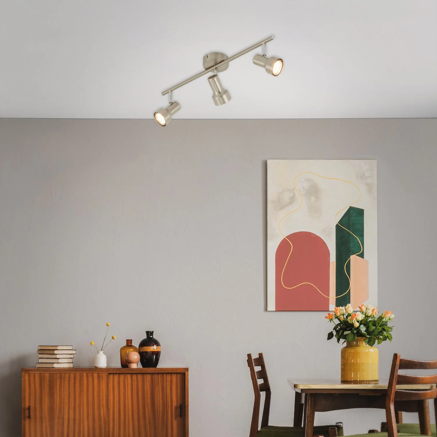 Ein echter Hingucker in jeder modernen Wohnung ist der 3-flammige Deckenstrahler. Er kann je nach Belieben gedreht und geschwenkt werden. Die GU10 Leuchtmittel können ausgetauscht werden, aber muss mindestens 5 Watt erhalten.