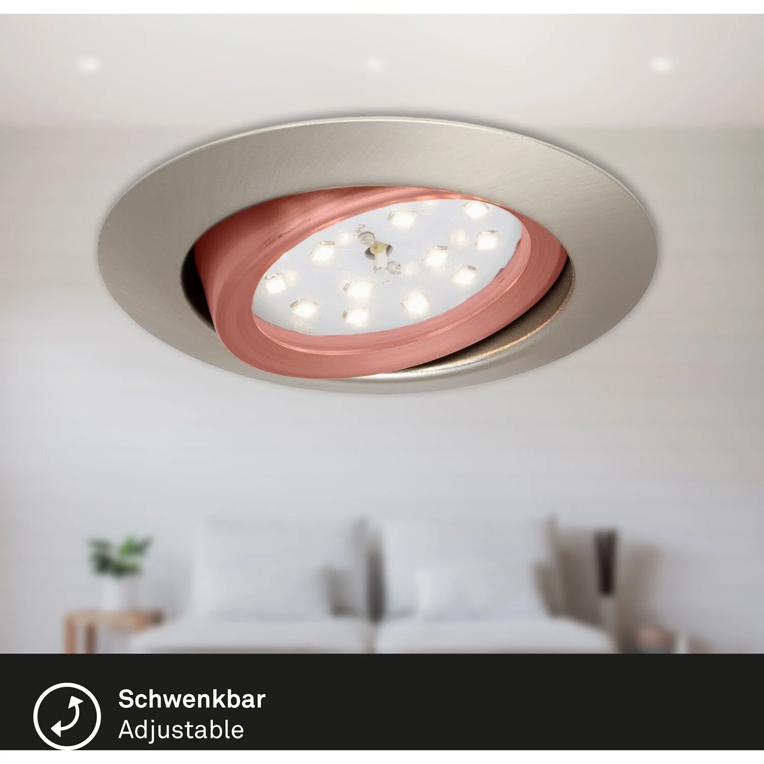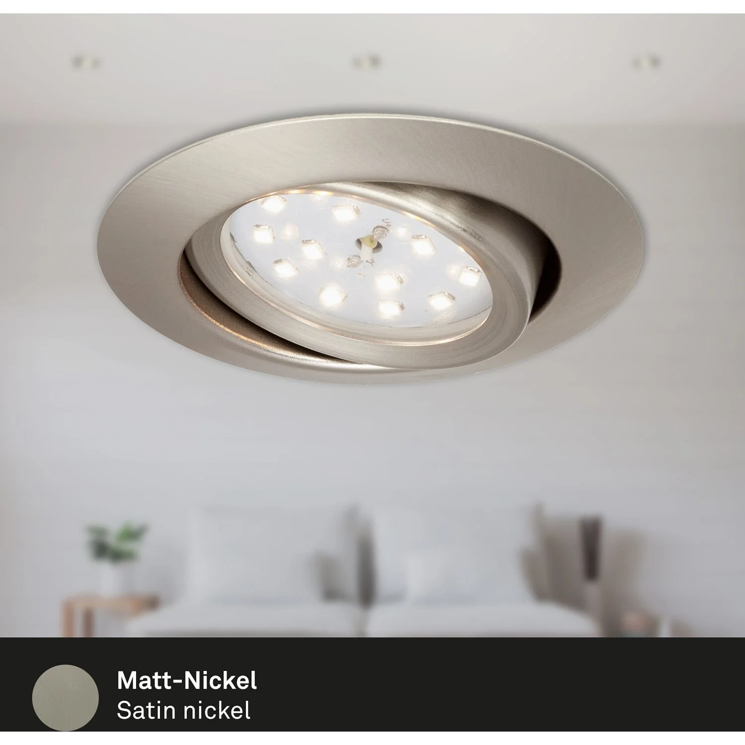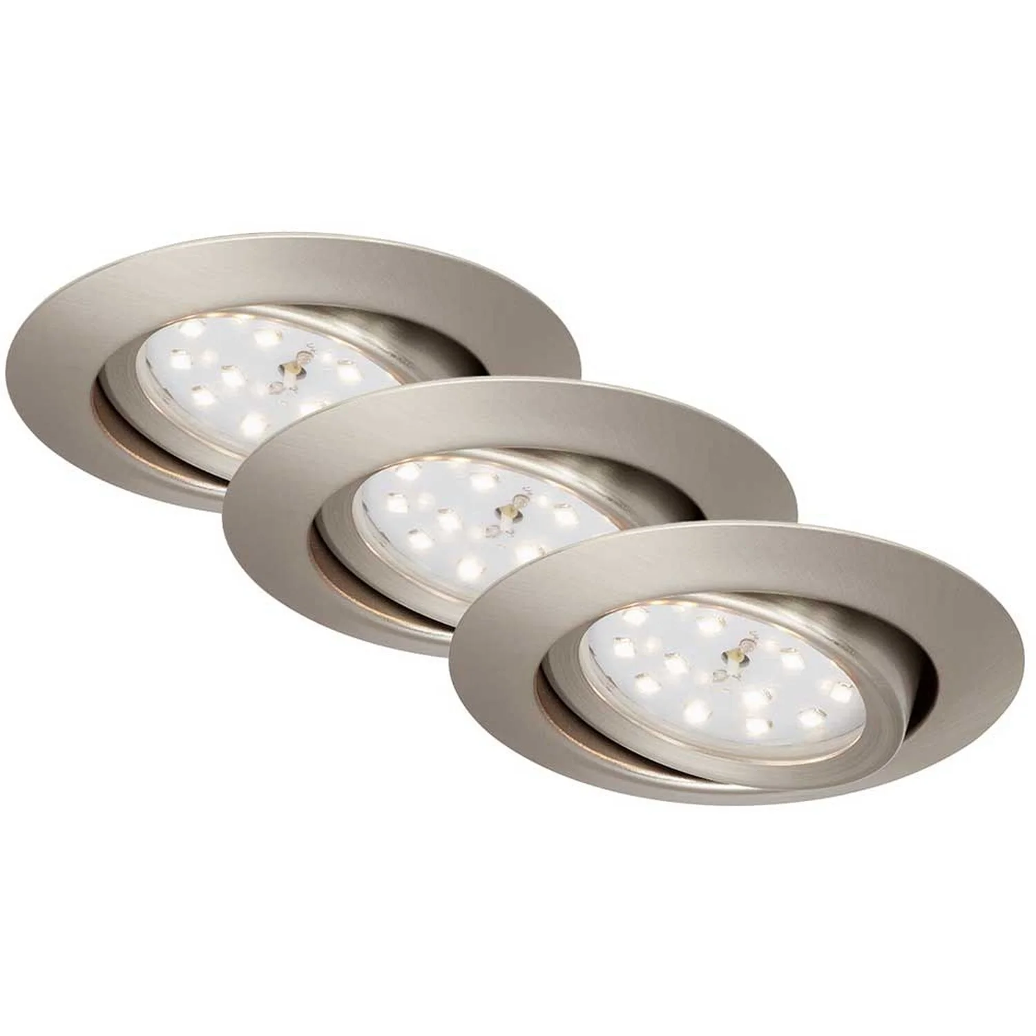 Dieses zeitlose LED-Einbauleuchten 3er Set ist gefertigt aus Metall in matt Nickel und lässt sich mühelos in verschiedene Räume einfügen. Die Strahler leuchten in einer angenehmen warmweissen Lichtfarbe (3’000 K). Aufgrund der Schwenkfunktion lassen sich die Leuchten optimal nach Ihren Lichtbedürfnissen ausrichten. Die energiesparenden Leuchtmittel 3 x LED je 3 W und 300 lm sind im Lieferumfang enthalten und überzeugen mit einer hohen Lebensdauer von bis zu 20’000 Stunden.