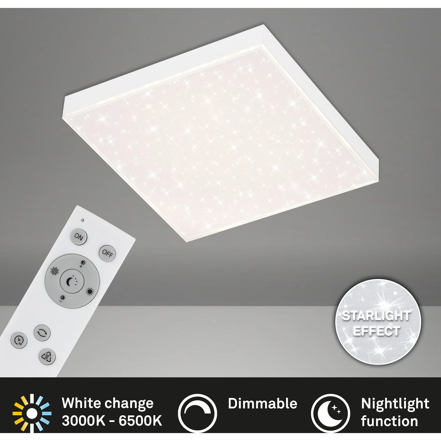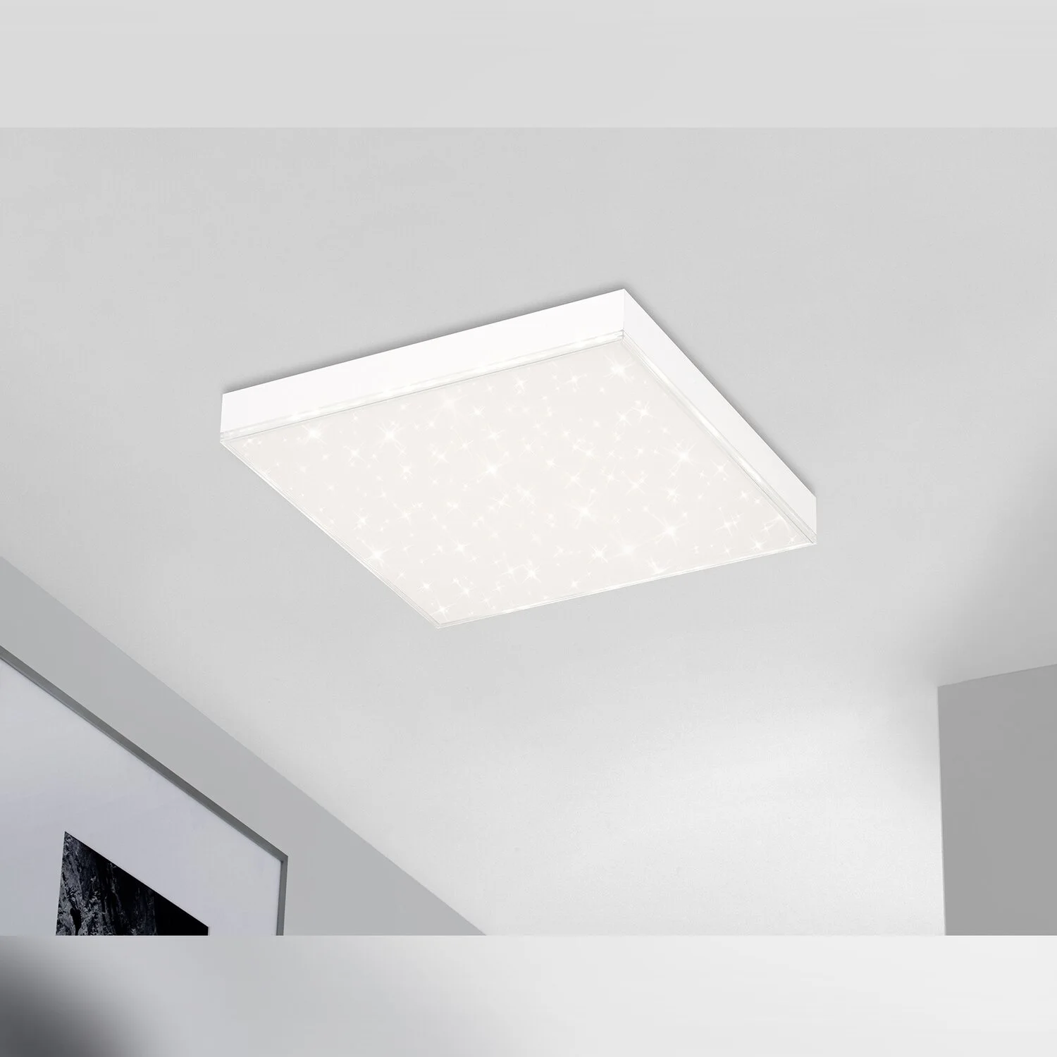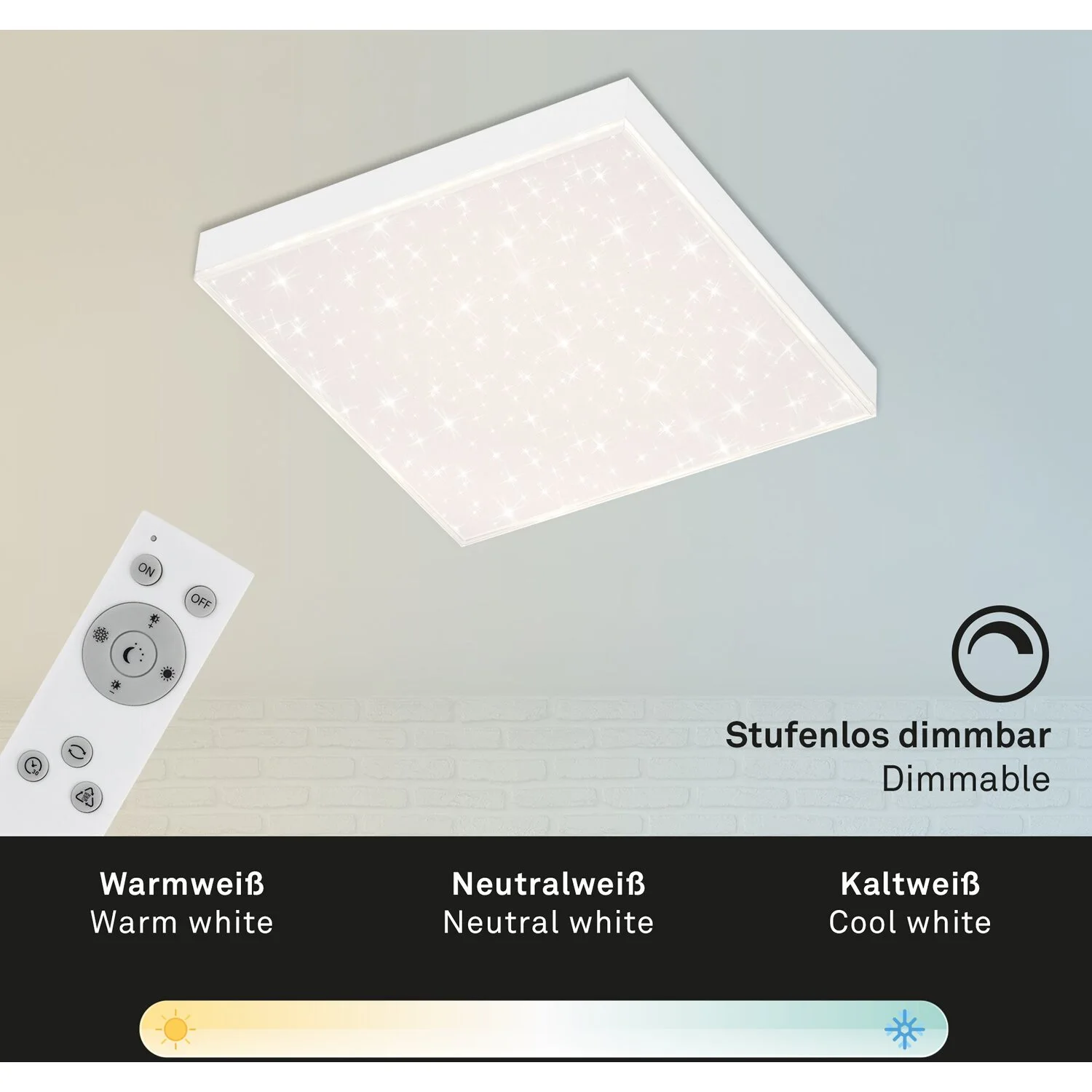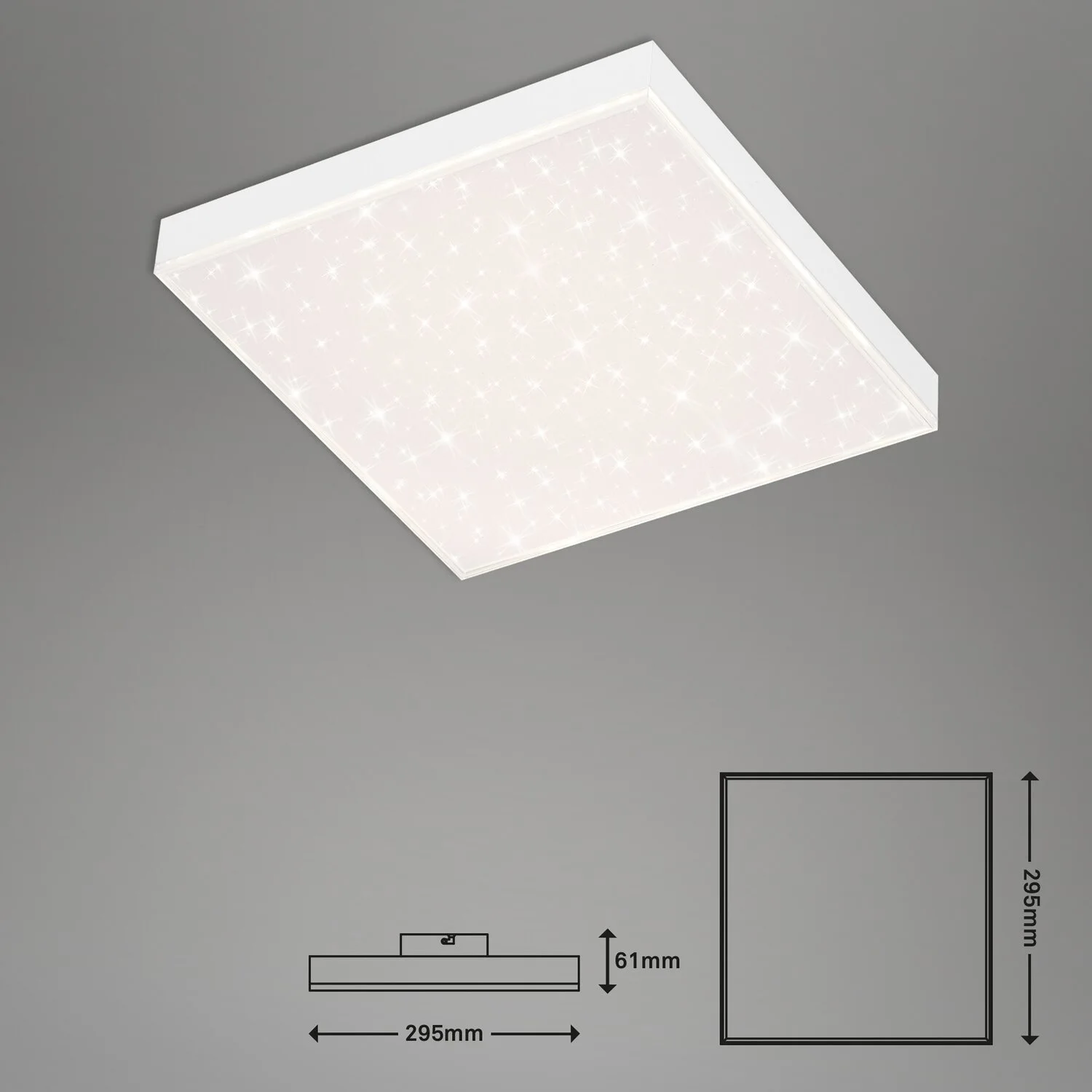 Das LED-Panel Frameless CCT mit Sternenhimmeldekor zeichnet sich durch sein schlichtes und dennoch einzigartiges Design aus. Die Leuchte hat keinen Rahmen, wodurch die gesamte Fläche als Lichtquelle genutzt wird. Dabei erstrahlt sie durch ihr Sternendekor in einem ganz besonderen Lichteffekt. Die eingebaute LED-Platine verfügt über eine Leistung von 15 W und einen Lichtstrom von 1’600 lm. Das Panel kann ausserdem per Fernbedienung gesteuert werden: Sie können die Leuchte sowohl stufenlos dimmen, als auch die Farbtemperatur individuell einstellen (3’000 – 6’500 K). Dadurch kann das Licht perfekt auf die momentane Stimmung und gewünschte Atmosphäre angepasst werden.