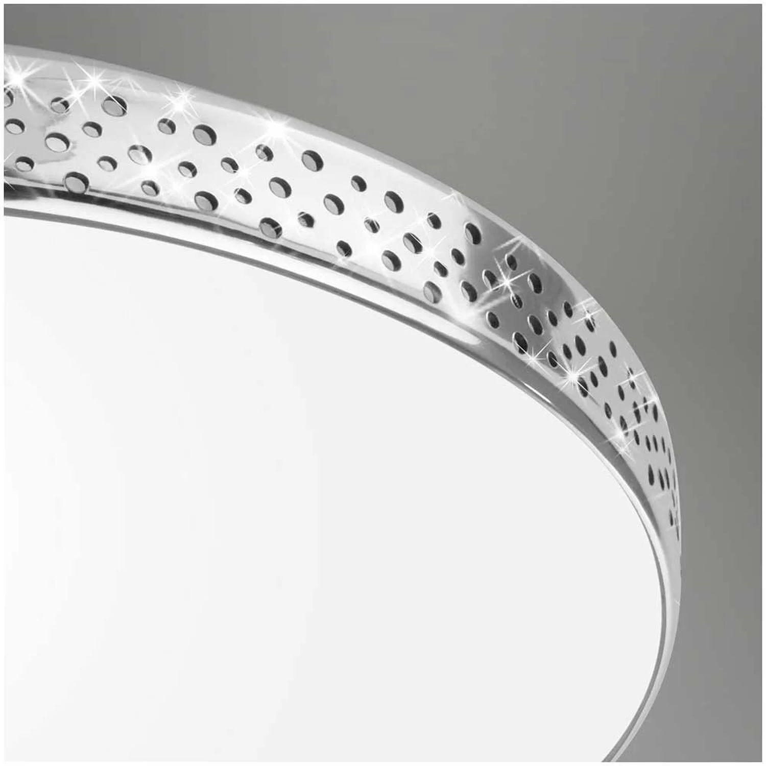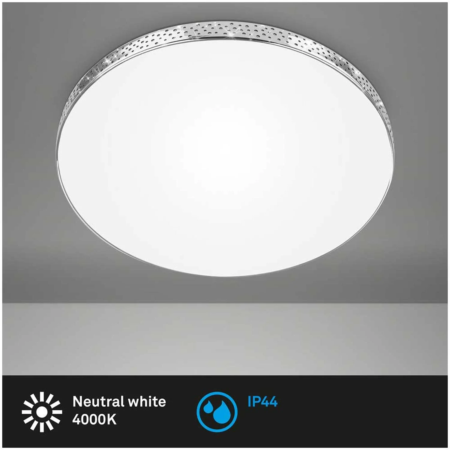 Die Badleuchte der Serie Malbona, gefertigt aus weissem Kunststoff und Metall, bietet Ihnen durch ihr neutralweisses Licht (4’000 K) eine optimale Ausleuchtung in Ihrem Badezimmer. Ein besonderes Highlight der Leuchte ist der Glitzereffekt durch die Laserlochoptik im Rahmen. Die LED-Platine der Leuchte hat 18 W und eine Lichtleistung von 1’850 lm. Durch den Schutzfaktor IP44 kann die Wand- und Deckenleuchte problemlos in der Nähe von Waschbecken oder Dusche angebracht werden, da sie spritzwassergeschützt ist. Die Leuchte hat einen Durchmesser von 355 mm und eine Höhe von 65 mm.