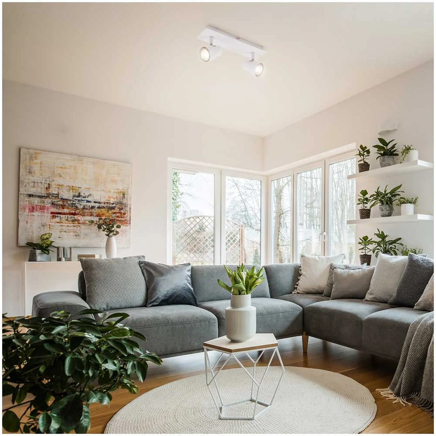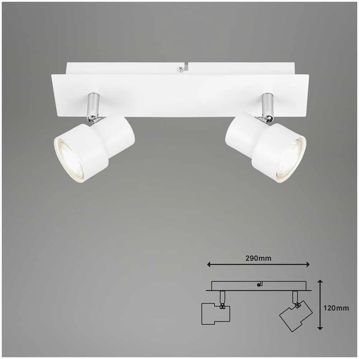 Die moderne zweiflammige Spotleuchte der Serie Rock von Briloner in der Farbe Weiss kommt inklusive zwei GU10-Leuchtmitteln mit jeweils 5 W und einer Lichtleistung von 460 lm. Das Licht ist mit 3’000 K angenehm warm und sorgt für eine gemütliche Atmosphäre. Die Köpfe der Leuchte sind dreh- und schwenkbar und können somit nach Belieben ausgerichtet werden. Die Leuchte besitzt ausserdem eine lange Lebensdauer von 25’000 h. Die Masse der Deckenleuchte betragen (HxBxT) 120 x 80 x 290 mm.