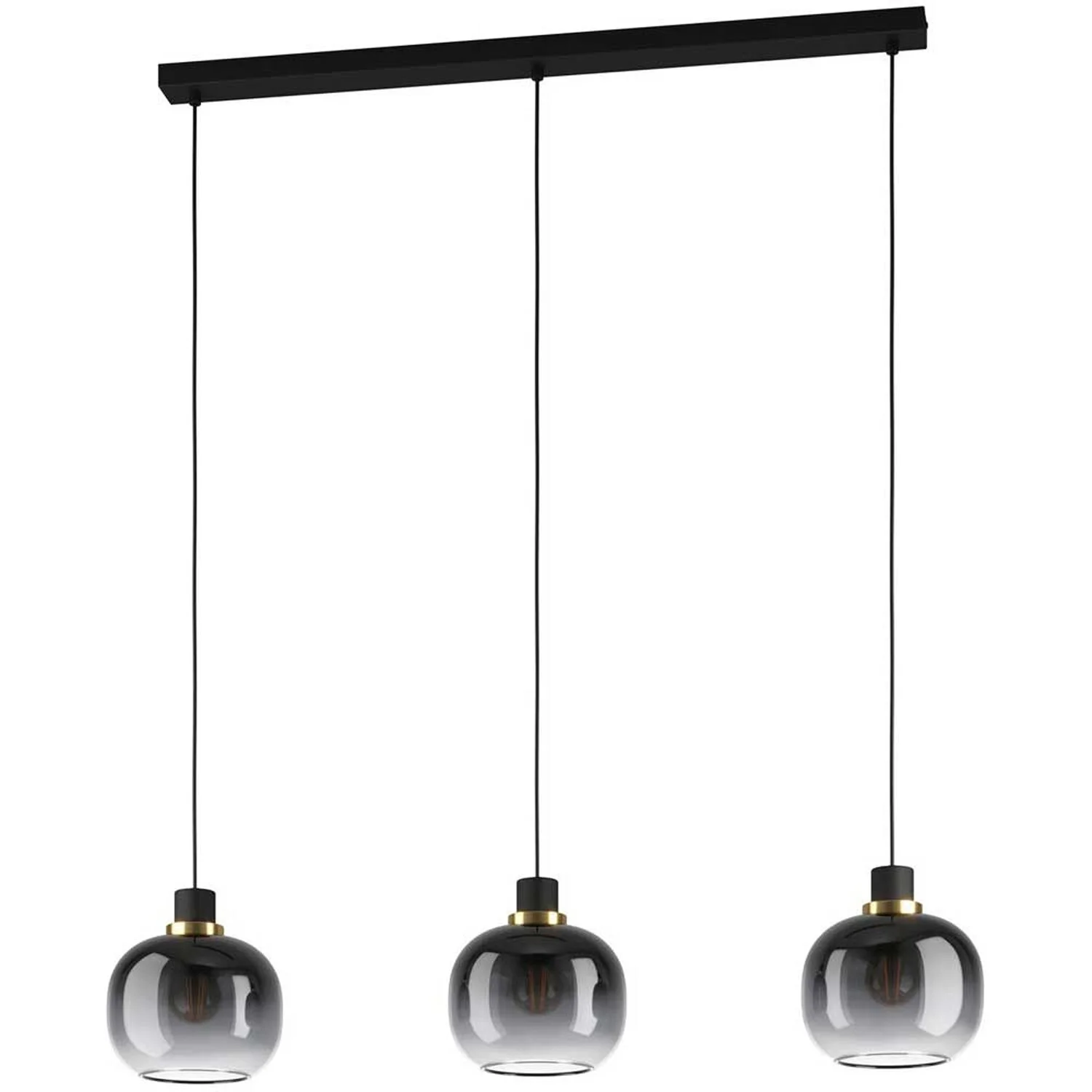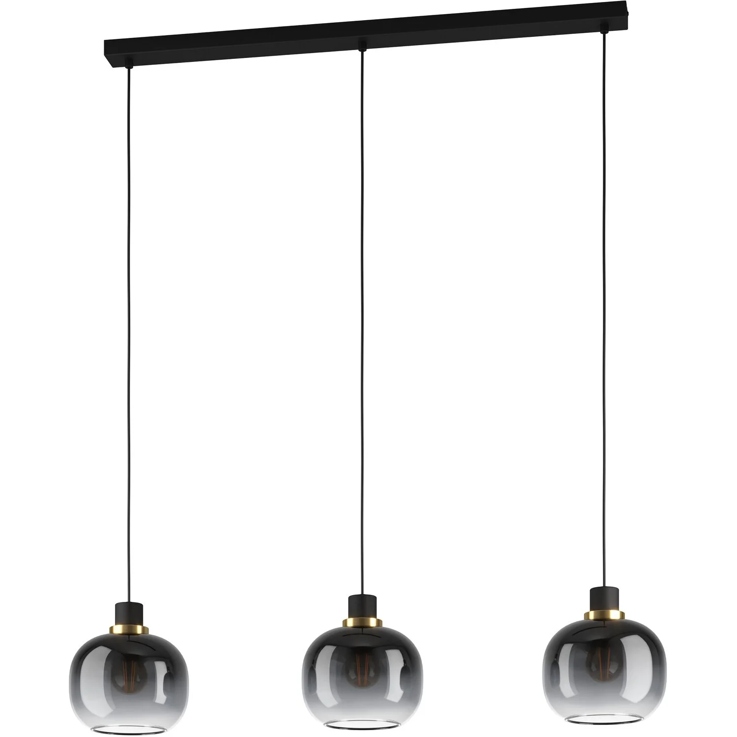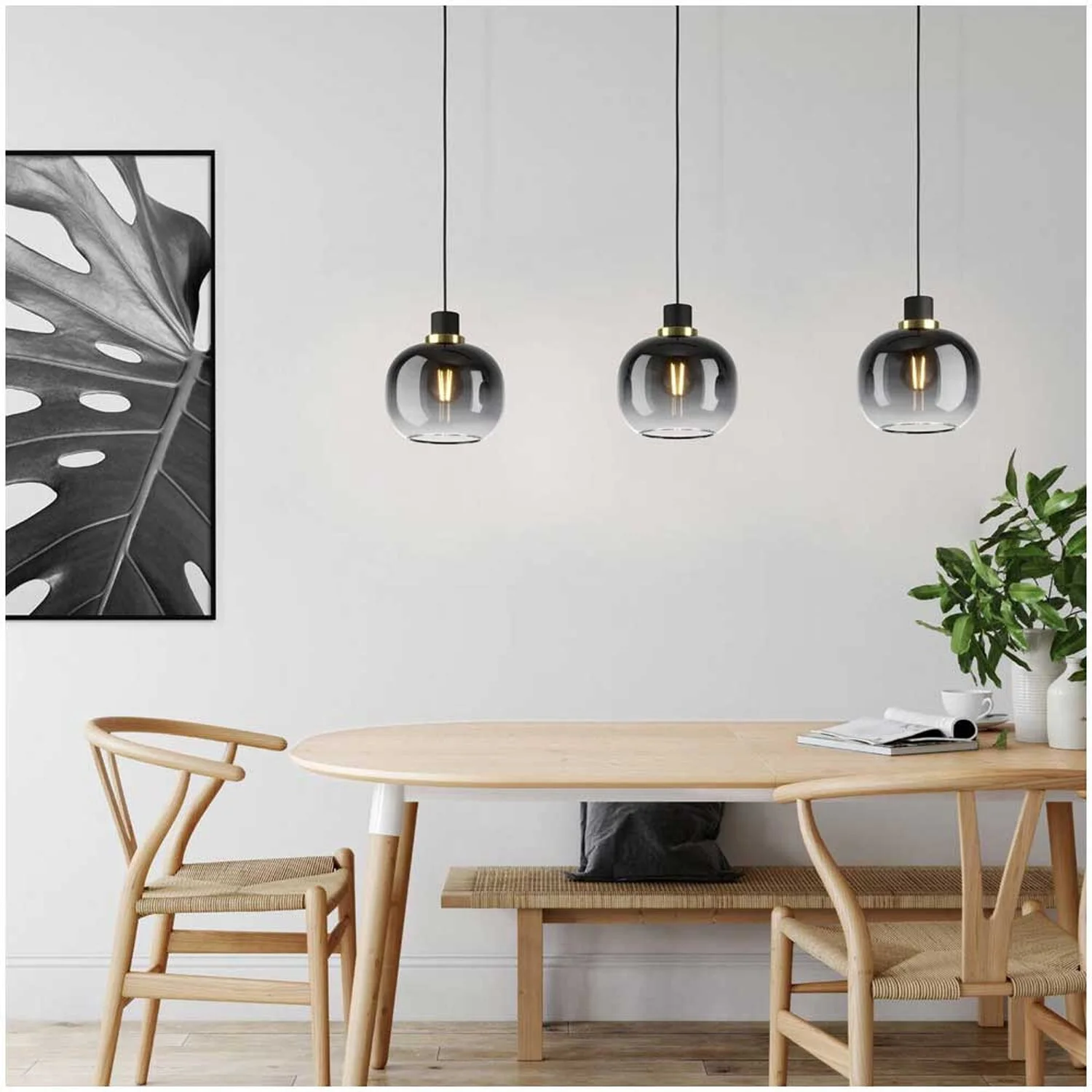 Die Pendelleuchte Ouilella besteht aus drei kugelförmigen klaren Glas-Lampenschirmen mit einem spannenden Farbverlauf in Schwarz-Grau. Die Lampenschirme wurden jeweils mit einem schwarzen Metall-Aufsatz kombiniert und durch ein dekoratives Messing-Element ergänzt. Die Hängeleuchte in den angesagten Farbtönen bietet eine angenehme Beleuchtung für Ihre Räume – egal, ob im Wohn- oder Esszimmer, beispielsweise über einem länglichen Esstisch. Die abgebildeten Filament-Leuchtmittel sind nicht im Lieferumfang enthalten. Geeignet ist die Leuchte für jedes Leuchtmittel mit E27-Sockel.