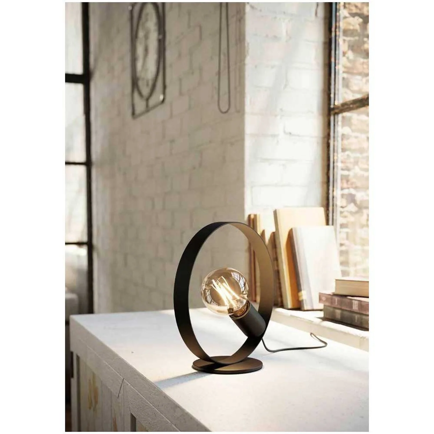 Die Tischleuchte Frijolas besteht aus einem schwarzen Metall-Ring, der mit einem sichtbaren Leuchtmittel kombiniert wird. Ihr besonderes Erscheinungsbild erhält die Leuchte durch die schräg angebrachte Leuchtmittelfassung, die dem Design ihren Schliff verleiht. Die Tischleuchte rundet insbesondere Einrichtungen im minimalistischen Stil ab und lässt sich über einen Schalter am Kabel bequem ein- und ausschalten. Sie bietet durch ihr geradliniges Design eine moderne Beleuchtung für jeden Raum.
