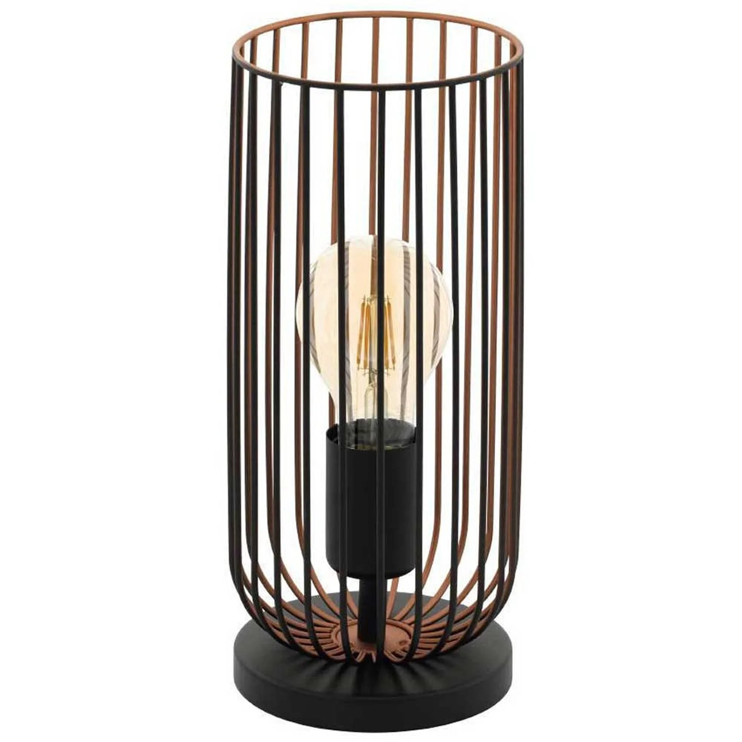 Die Tischleuchte der Serie Roccamena besteht aus schwarzem und kupferfarbenem Stahl. Sie wird mittels Kabelschalter bedient, verfügt über eine Schutzisolierung und benötigt zum Strahlen ein E27-Leuchtmittel.