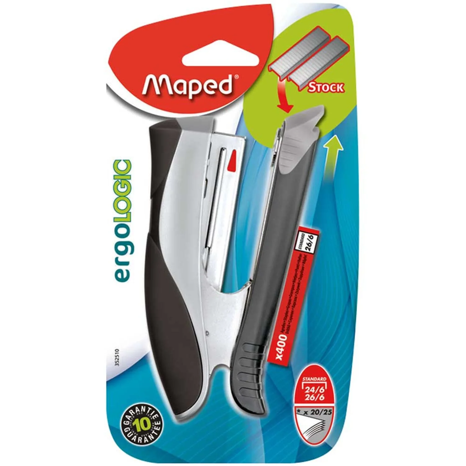 Dieses ergonomische Heftgerät ermöglicht ein schmerzfreies Heften durch seine weiche Oberfläche auf der Auflagefläche. Der praktische Hefter ist mit einem versenkbaren Klammerheber und einer Reserve für zwei Heftstäbe ausgestattet. Der Hefter Ergologic ist für Heftklammern Nr. 10 geeigent und ermöglicht das Heften von bis zu 15 Blatt. Eine Box mit 400 Klammern ist im Set enthalten.