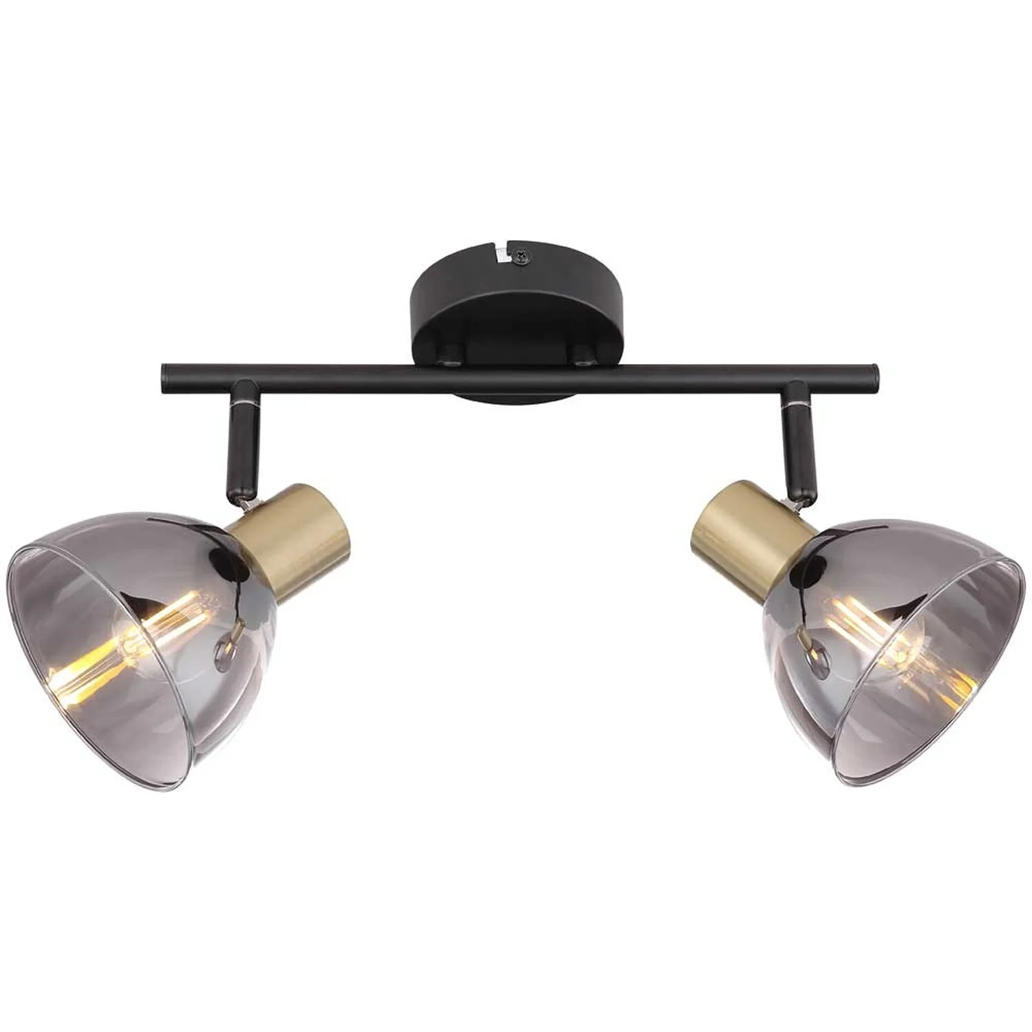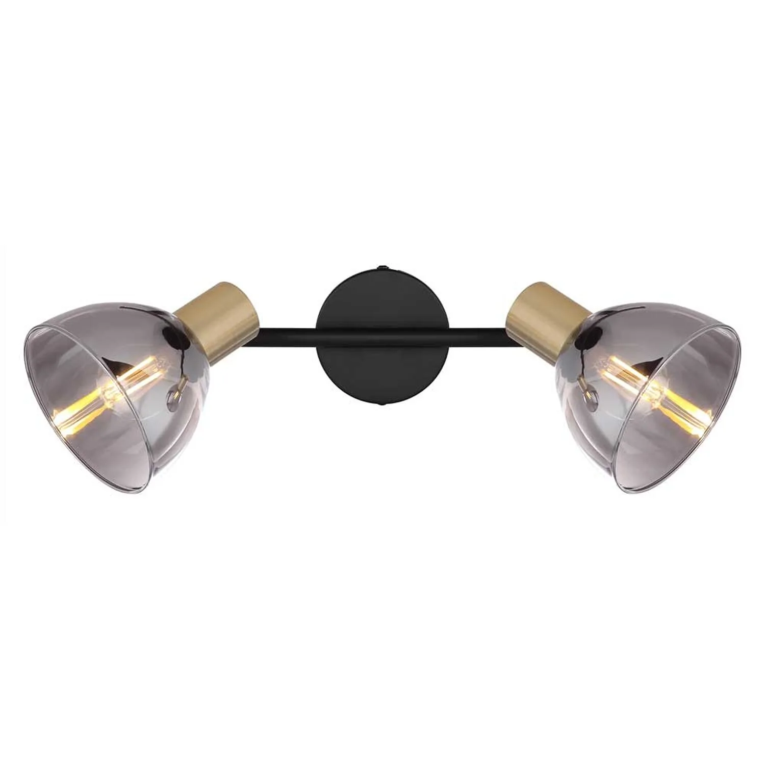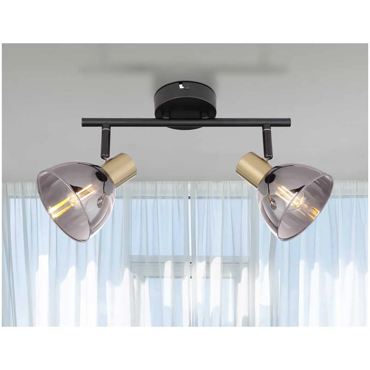 Der Globo 2er-Strahler setzt gezielte Lichtakzente im Wohn- und Schlafraum und überzeugt durch sein elegantes, modernes Design. Hergestellt ist der Wandstrahler aus schwarzem Metall mit einem Lampenkopf aus rauchfarbigem Glas und Mantel in messing-matter Optik. Zur Beleuchtung benötigt er ein Leuchtmittel E14 mit maximal 25 W und 230 V. Für einen geringen Energieverbrauch und hohe Lebensdauer empfiehlt sich die Verwendung eines LED-Leuchtmittels, das separat bestellbar ist. Für ein einfaches Ein- und Ausschalten ist der Strahler mit einem praktischen Wippschalter ausgestattet.