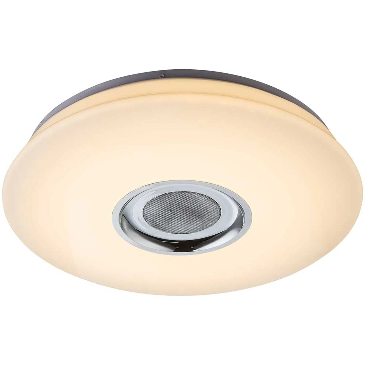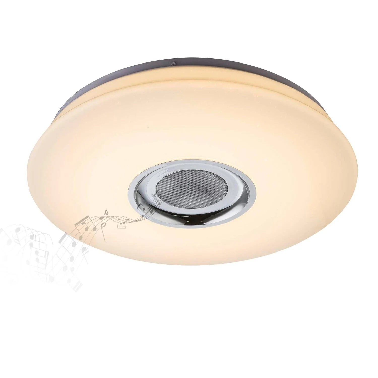 Die Globo LED-Deckenleuchte Nicole Ø 40 cm überzeugt mit ihrer Funktionalität. Hergestellt aus weissem und opalem Kunststoff mit Sparkle-Optik verfügt diese Deckenleuchte über einen 5-Watt Lautsprecher. Die Verbindung per Bluetooth ermöglicht Ihnen Ihre Wunschmusik über diese Deckenlampe abzuspielen. Mit der mitgelieferten Fernbedienung können Sie die Lichtfarbe des dimmbaren und maximal 1440 Lumen starken Lichts in 3 Stufen umschalten (Warmweiss 3’000 K – NeutralWeiss 4’000 K – Kaltweiss 6’000 K). Je nach Bedarf und Stimmung können Sie das Licht auch in Rot, Grün oder Blau umschalten. Die Leuchte punktet zudem mit einer hohen Lebensdauer von 20000 Stunden. Die Fernbedienung ist im Lieferumfang enthalten. Setzen Sie mit dieser LED-Deckenleuchte in Ihrem Schlaf- oder Wohnzimmer wundervolle Licht-Akzente.