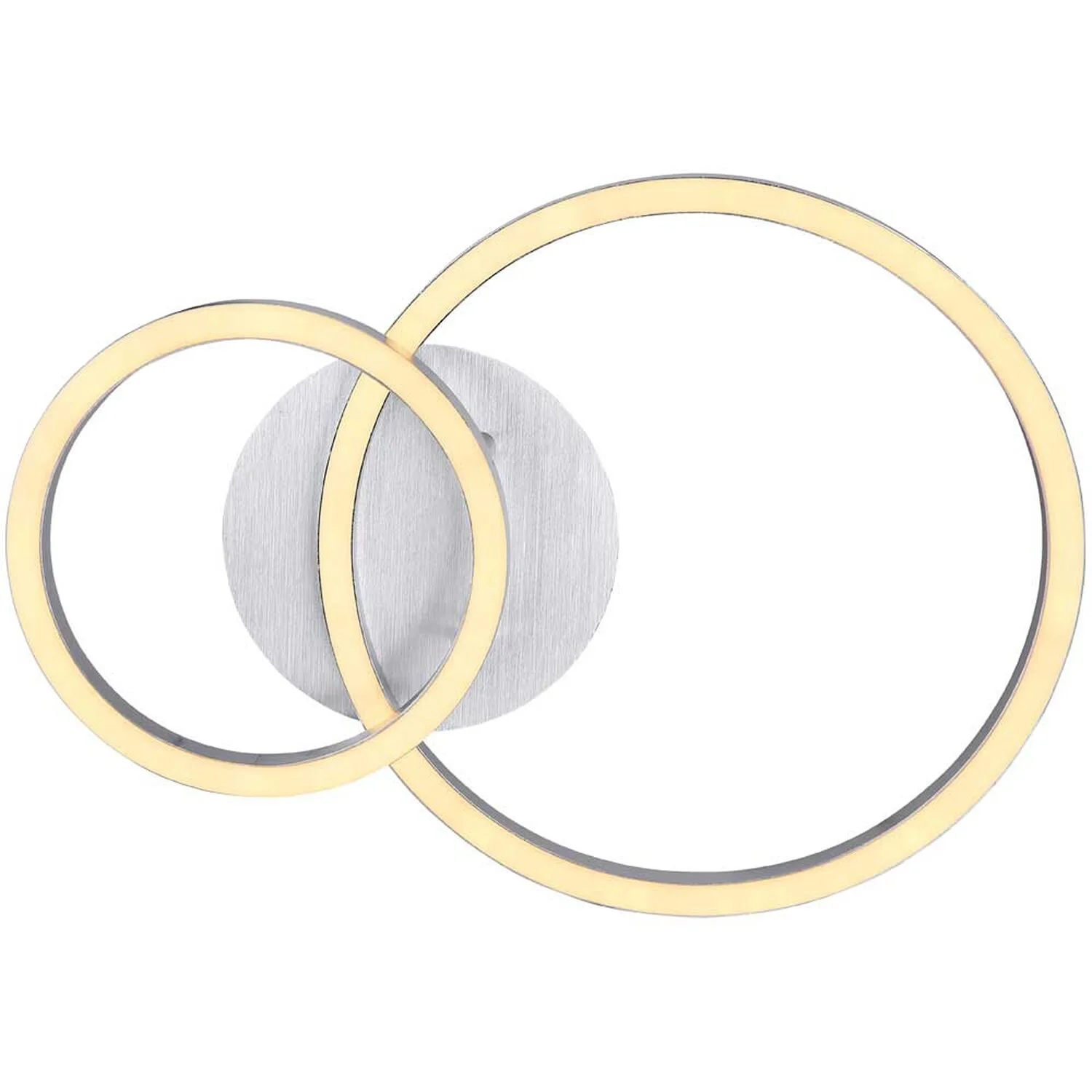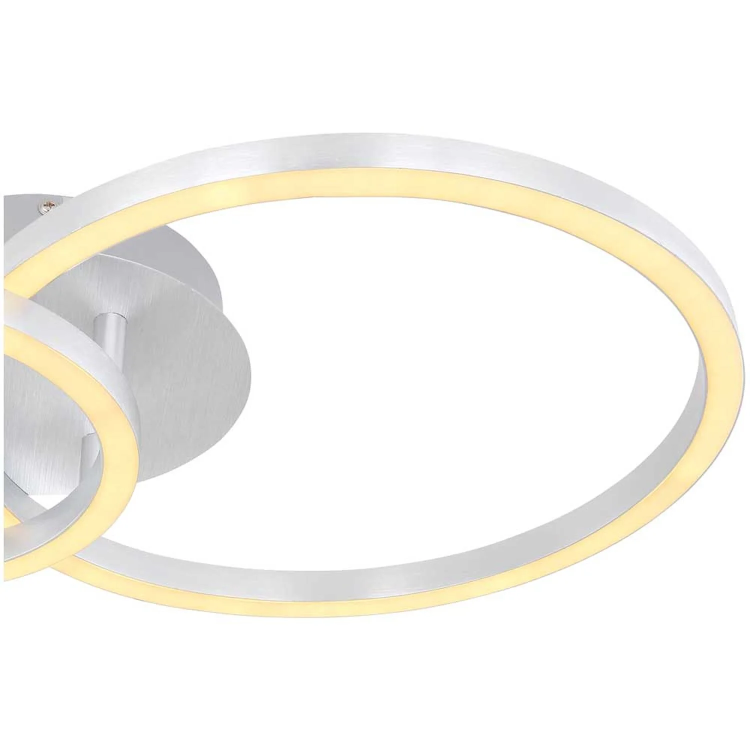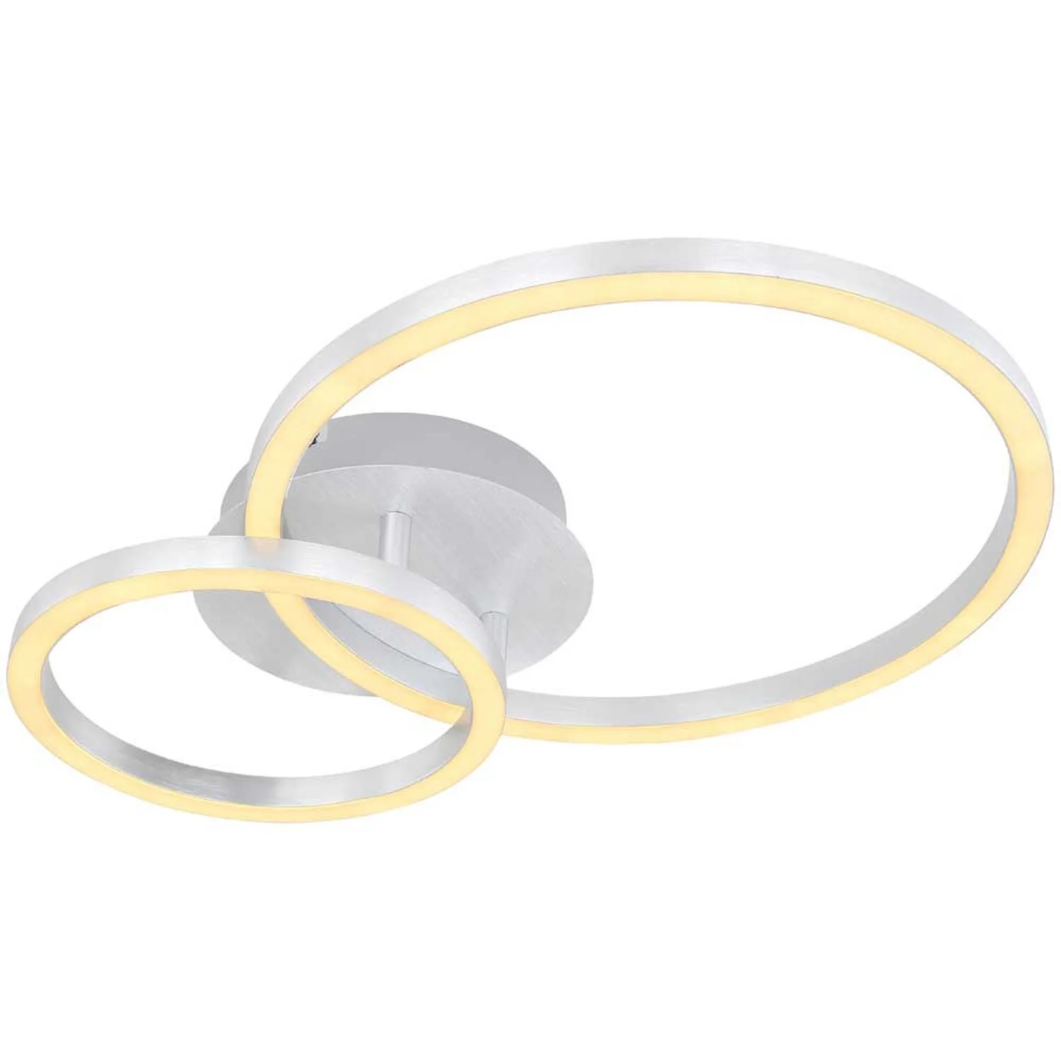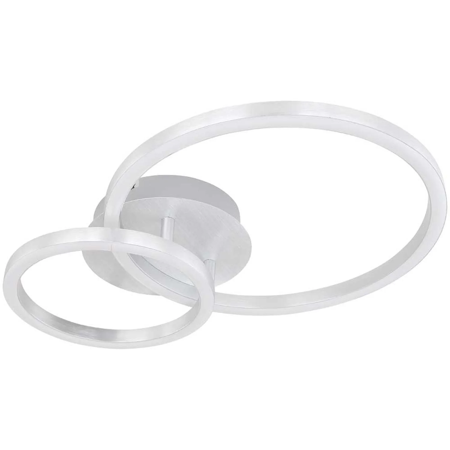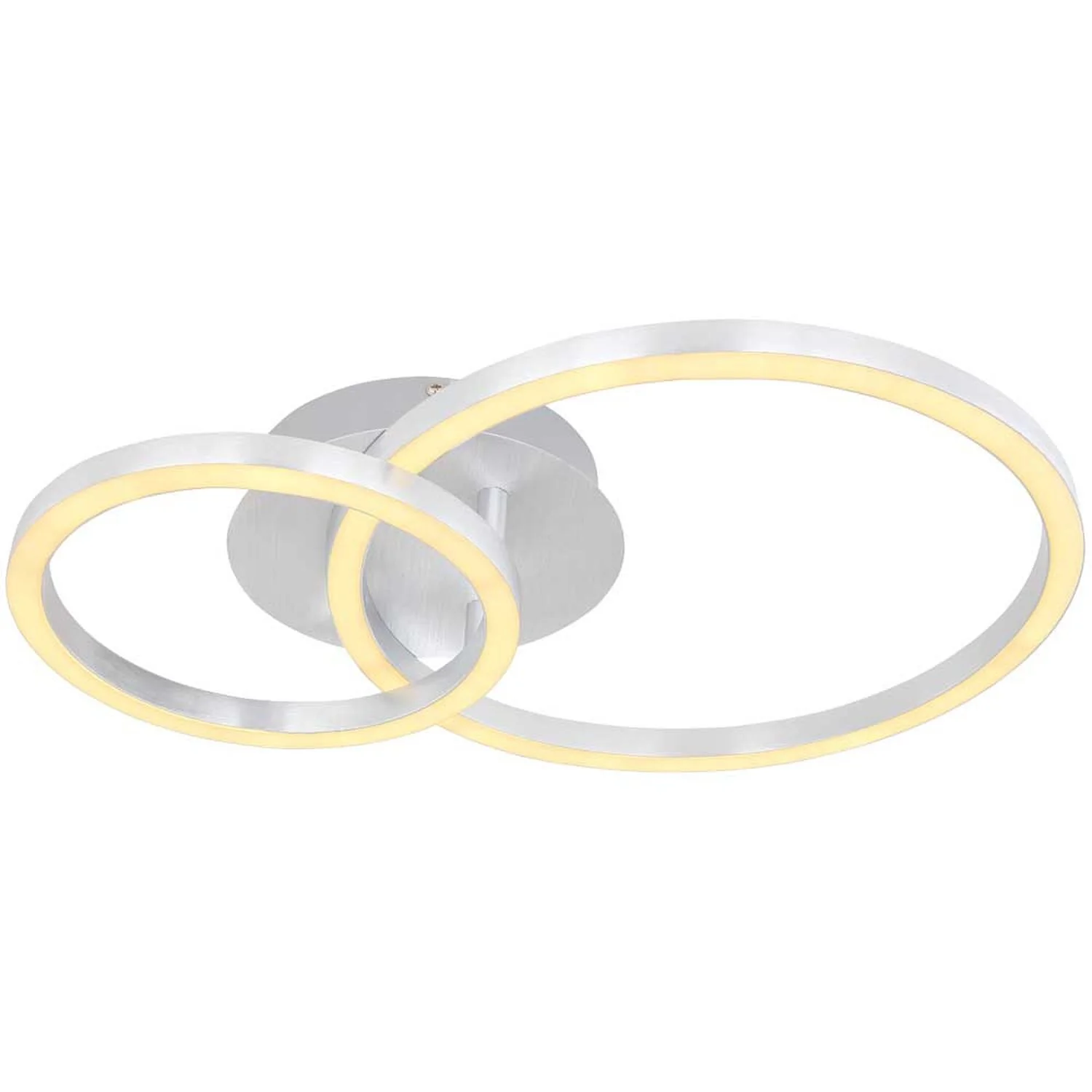 Die Globo LED-Deckenleuchte der Serie Reggy bereichert das Zuhause im stilvollen Design und schafft ein elegantes Ambiente in den Innenräumen. Sie begeistert durch die Kombination aus gebürstetem Aluminium und opalenem Acryl und ist mit zwei unterschiedlich grossen Ringen versehen, die sich formschön überschneiden. Die Leuchte hat eine Grösse von (HxBxT) 7,5 x 30 x 42 cm. Zur Beleuchtung verfügt sie über energiesparende und langlebige LED-Leuchtmittel mit einer Leistung von 18 W und 230 V. Ihre Helligkeit beträgt 950 lm. Durch die warmweisse Lichtfarbe sorgt die Deckenlampe für eine gemütliche Lichtstimmung im Wohn- und Schlafbereich.