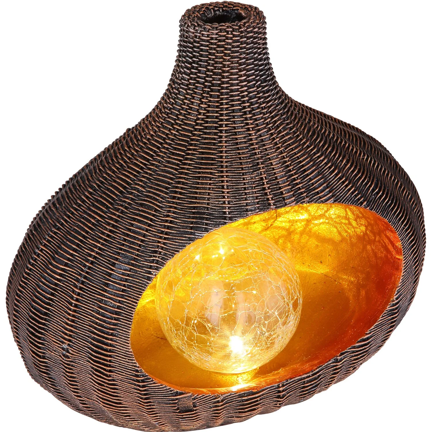 Diese formschöne LED-Solaraussenleuchte von Globo aus braunem Kunststoff ist eine wunderschöne Ergänzung für Ihren Garten, Ihre Terrasse oder Ihren Balkon. Das solarbetriebene LED-Leuchtmittel ist von einer gläsernen Kugel in schöner Crackle-Optik umschlossen. Ausserdem ist die Innenseite der 24,5 cm grossen Solaraussenleuchte golden getönt, was zusammen mit dem angenehm warmweissen Licht (3’000 K) des Leuchtmittels zu einer stimmungsvollen Atmosphäre beiträgt.