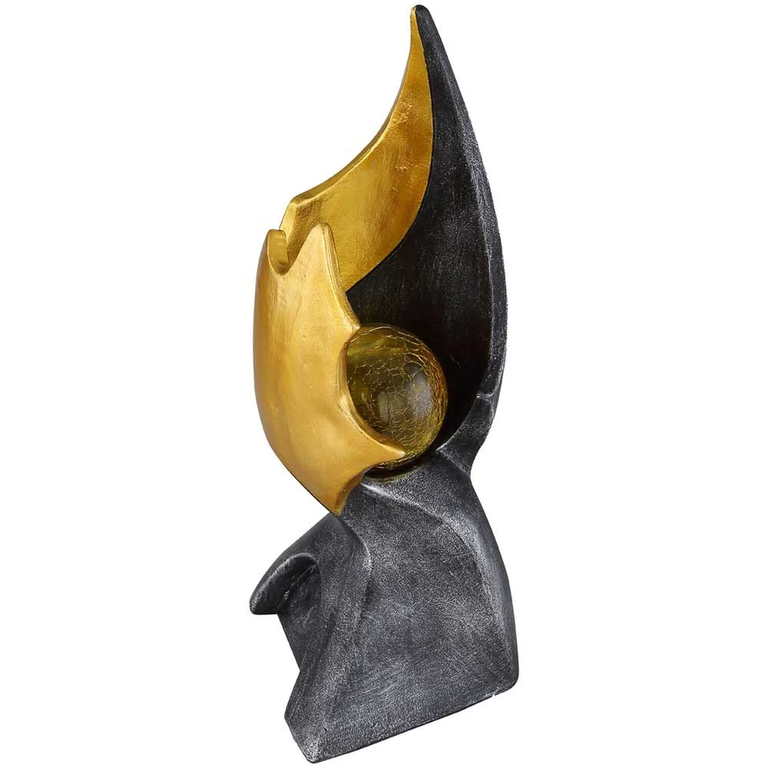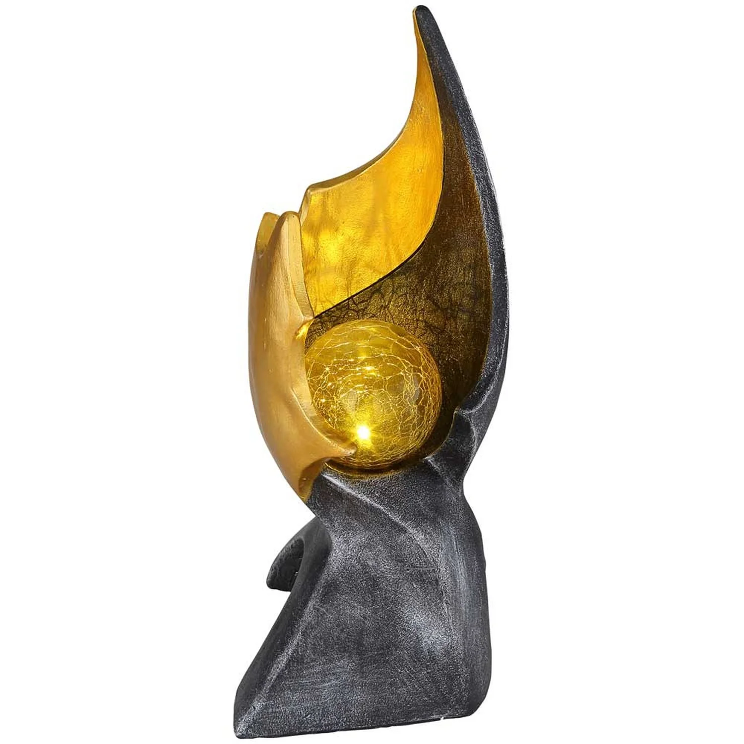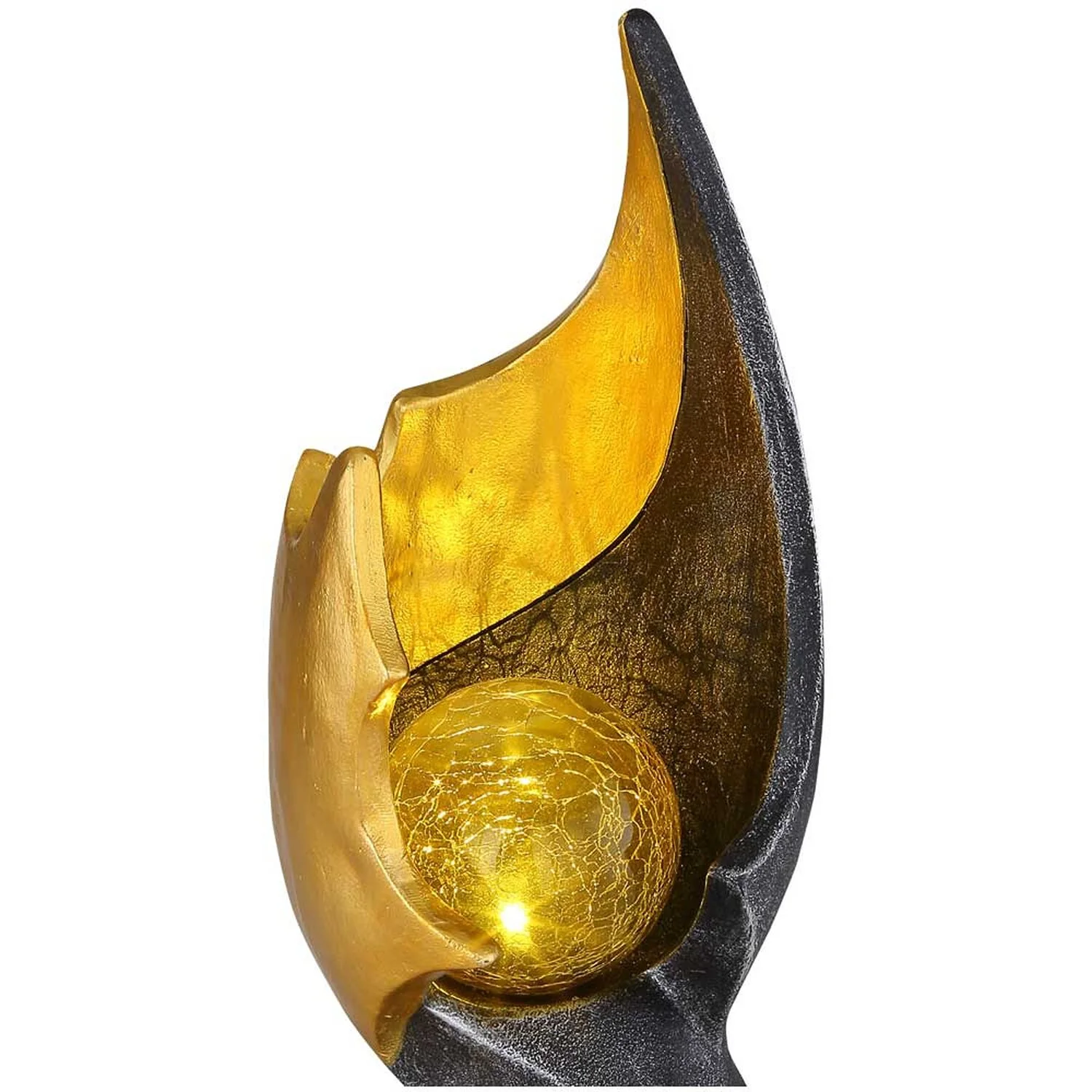 Diese formschöne, geschwungene Solarleuchte aus goldfarbenem und braunem Kunststoff ist ein echter Blickfang für Ihren Aussenbereich. Dank ihrer flachen Unterseite steht sie stabil auf Tischen und anderen ebenen Flächen. Das solarbetriebene LED-Leuchtmittel spendet angenehm warmweisses Licht (3’000 K) und ist von einer gläsernen Kugel in schöner Bruchglasoptik umgeben.