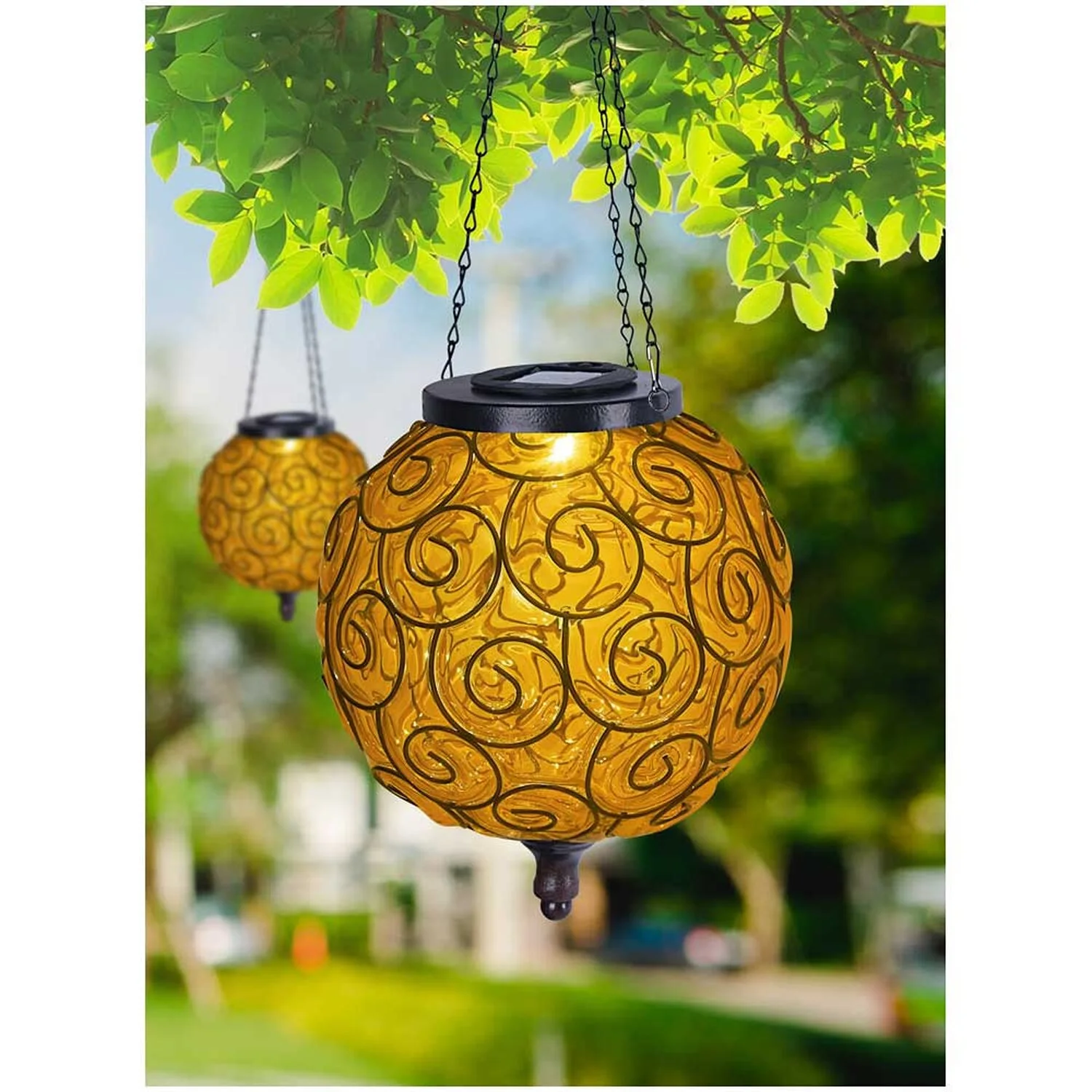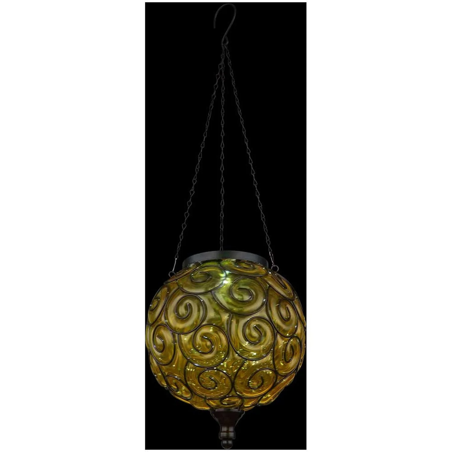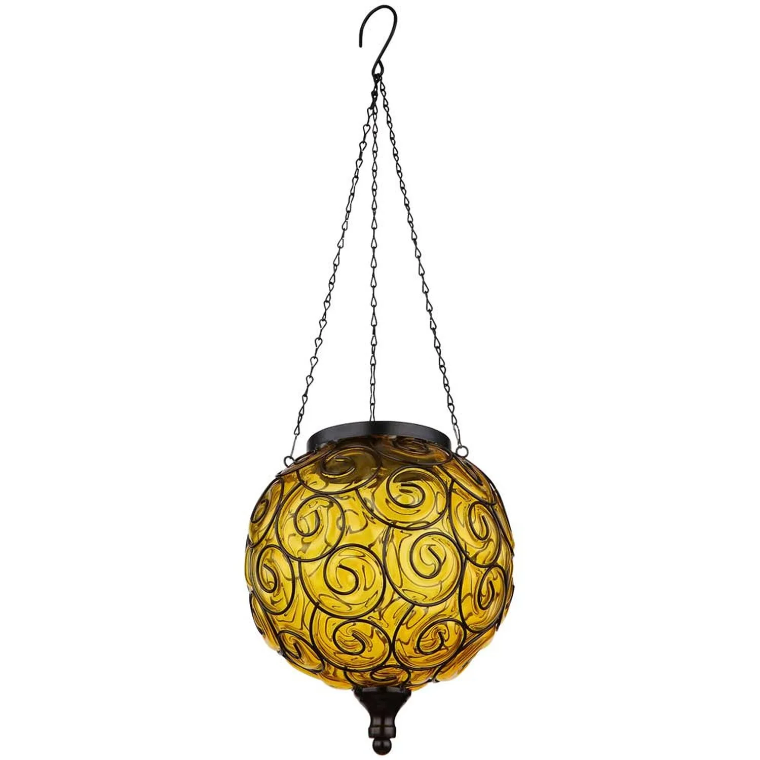 Diese dekorative Hängeleuchte von Globo begeistert durch ihr schönes Ornament-Design. Die bernsteinfarbene Kugel aus Glas hängt an drei Ketten von der Decke und strahlt ein kaltweisses Licht aus (6’000 K), welches für eine angenehme Atmosphäre sorgt. Dank IP44-Schutzgrad gegen Spritzwasser ist die Leuchte ideal für den Aussenbereich geeignet.