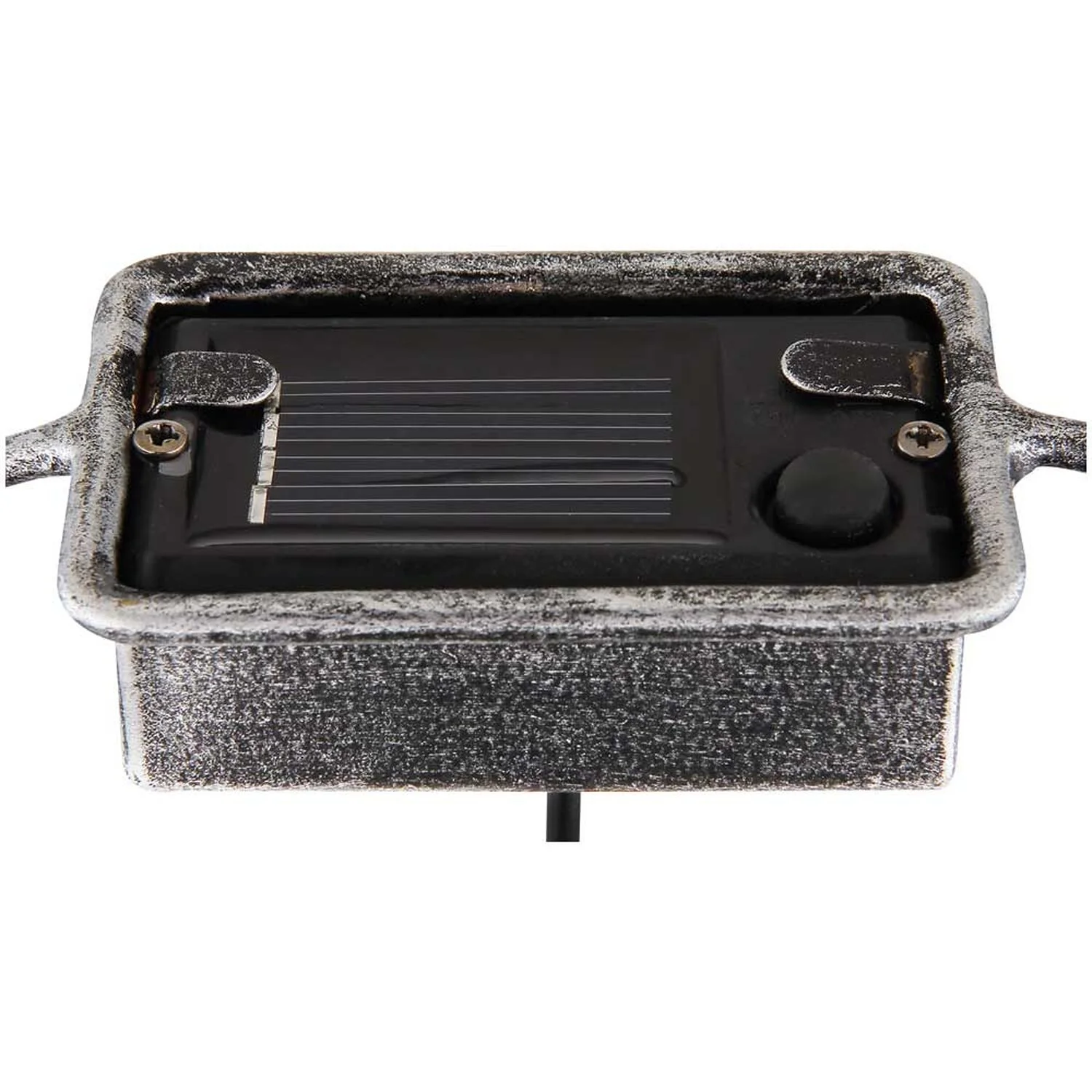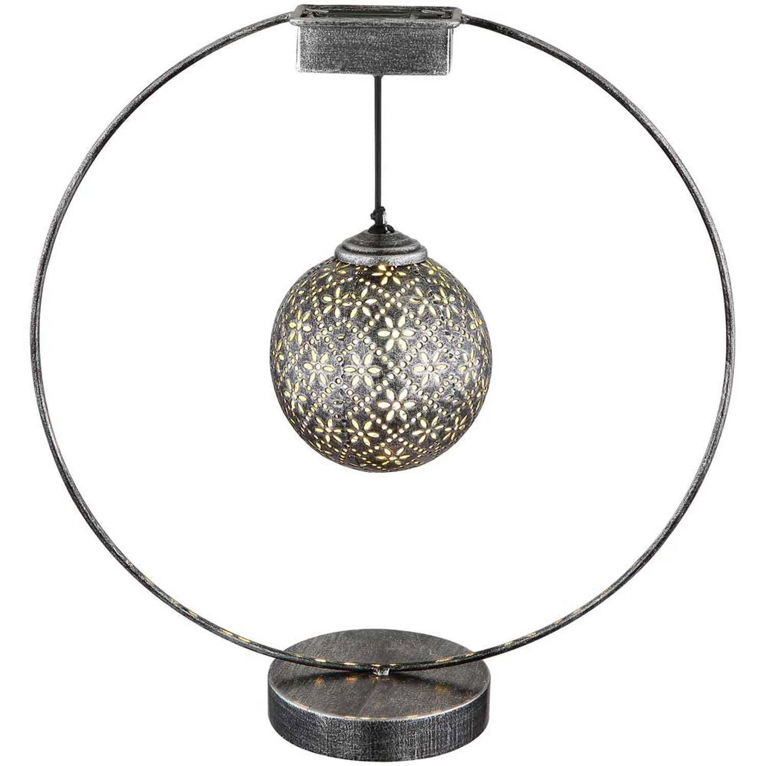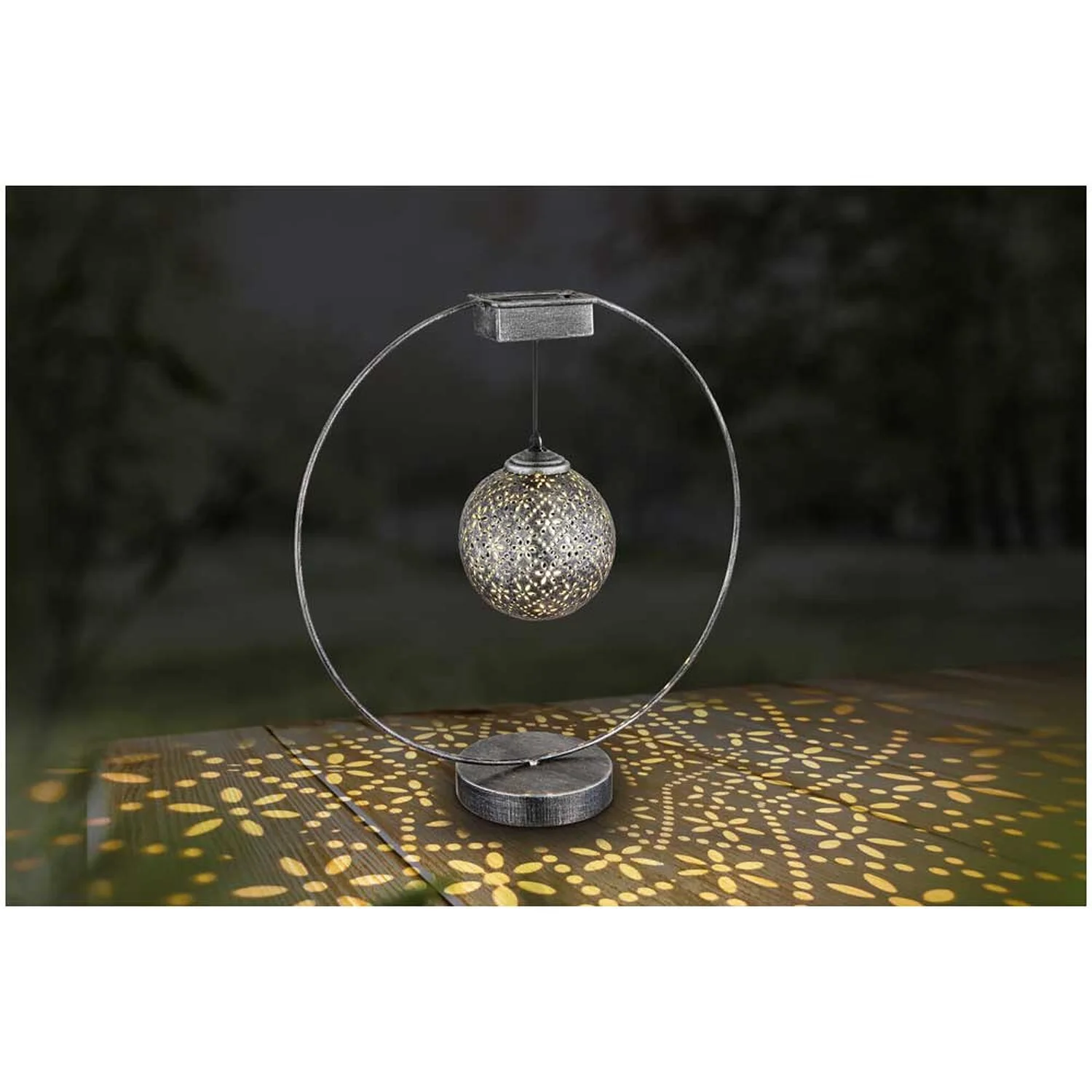 Diese Solarleuchte von Globo mit Standfuss begeistert durch ihr aussergewöhnliches Design. An einem Metallring in Antikfinish hängt eine Kugel mitfeinen Dekorstanzungen, durch die das warmweisse Licht (3’000 K) wunderschöne Muster erzeugt. Dank IP44-Schutzgrad gegen Spritzwasser ist die Leuchte ideal für den Aussenbereich geeignet.