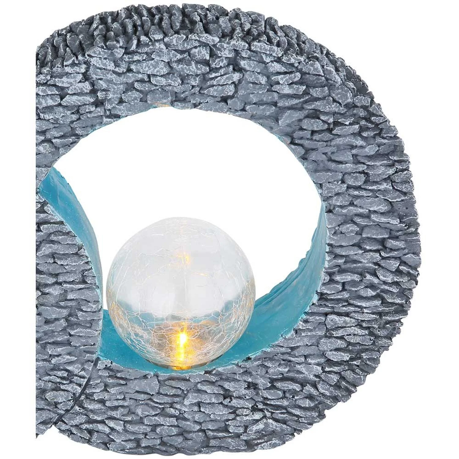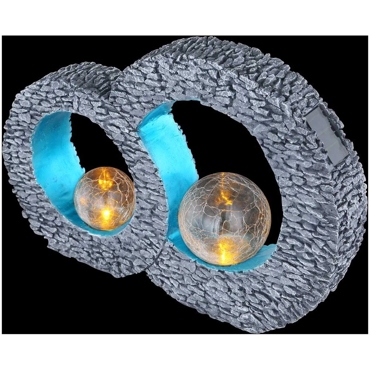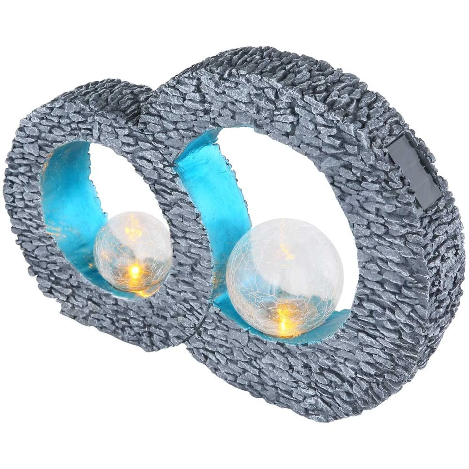 Diese kreisförmige Solarleuchte von Globo in Steinoptik ist eine wundervolle Ergänzung für Ihre Terrasse oder Ihren Garten. Durch die flache Unterseite eignet sie sich perfekt für Tische und jeden anderen festen Untergrund. In den blau getönten Kreisen befinden sich zwei Kugeln in schöner Bruchglasoptik. Die darin enthaltenen solarbetriebenen LED-Leuchtmittel erzeugen ein angenehmes, warmweisses Licht (3’000 K). . Dank Schutzgrad IP44 ist diese Leuchte bestens für den Aussenbereich geeignet.