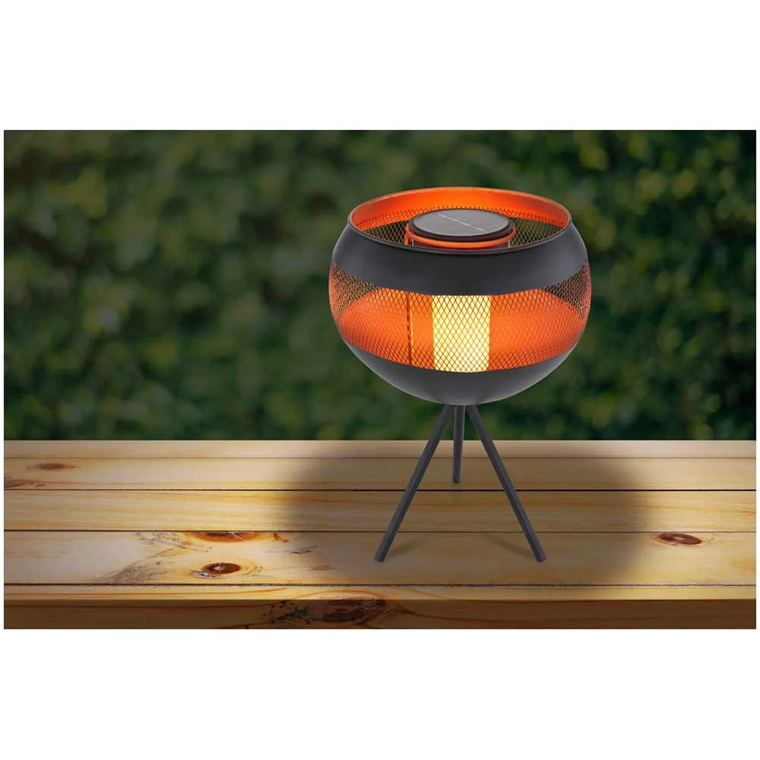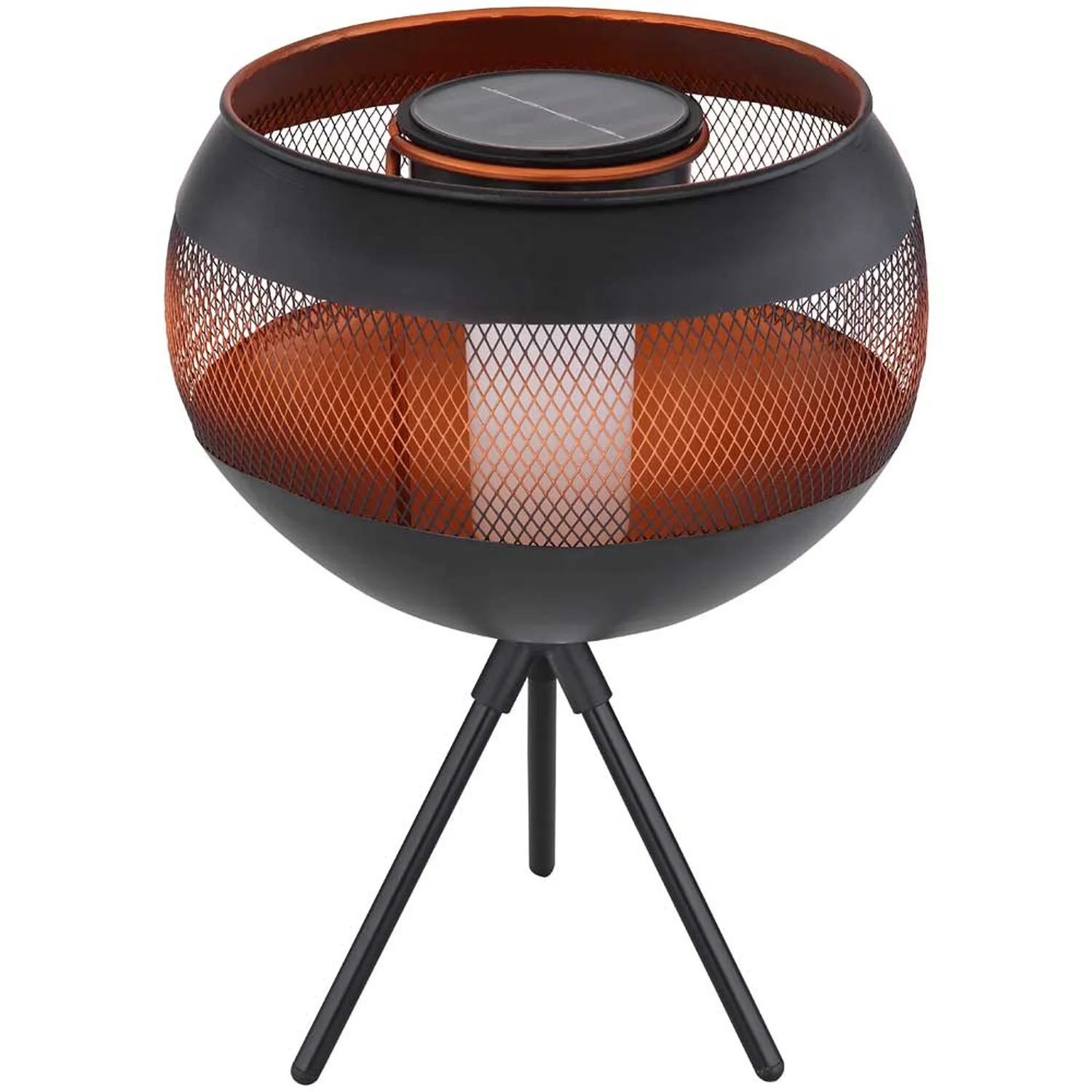 Die Solarleuchte von Globo aus mattschwarzem Metall erinnert an eine Feuerschale. Durch ihre rostfarbene Tönung im Inneren bringt sie das Solarmodul in dessen Mitte umso besser zur Geltung. Sie erzeugt ein flackerndes, warmes Licht (1’400 K). Verschönern Sie Ihren Garten, Ihre Terrasse oder Ihren Balkon mit dieser robusten, solarbetrieben Leuchte ganz ohne lästige Kabel. Sie wird einfach mittels Erdspiess in der Erde platziert oder auf ihren drei Beinen auf einen ebenen Untergrund gestellt. Dank der Schutzart IP44 ist sie spritzwassergeschützt und kann ganz nach Ihrer Wahl im Aussenbereich platziert werden.