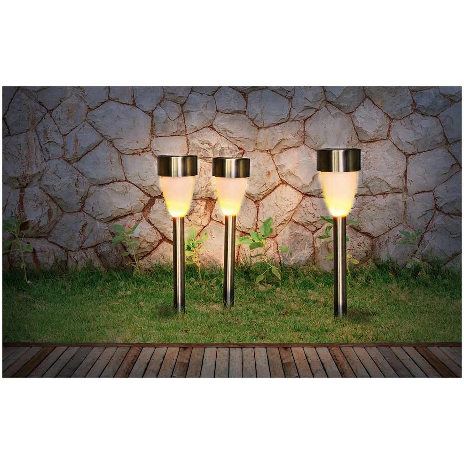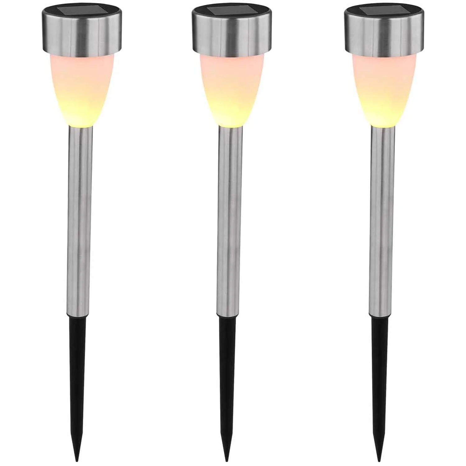Dieses Set aus drei Edelstahl-Solarleuchten von Globo lässt sich praktisch und einfach im Garten oder Vorgarten verteilen. Flackernde LEDs sorgen für eine romantische Atmosphäre. Jederzeit können Sie diese Solarleuchten mit ihrem nützlichen Erdspiess umplatzieren. Dank IP44-Schutzgrad gegen Spritzwasser ist die Leuchte ideal für den Aussenbereich geeignet.