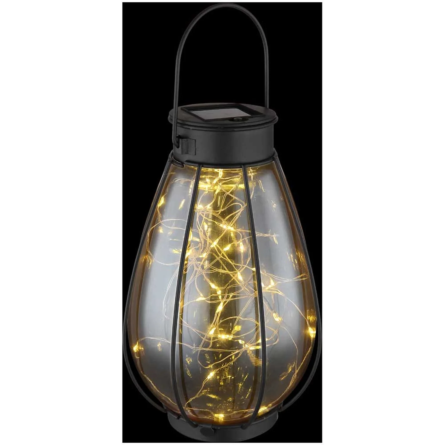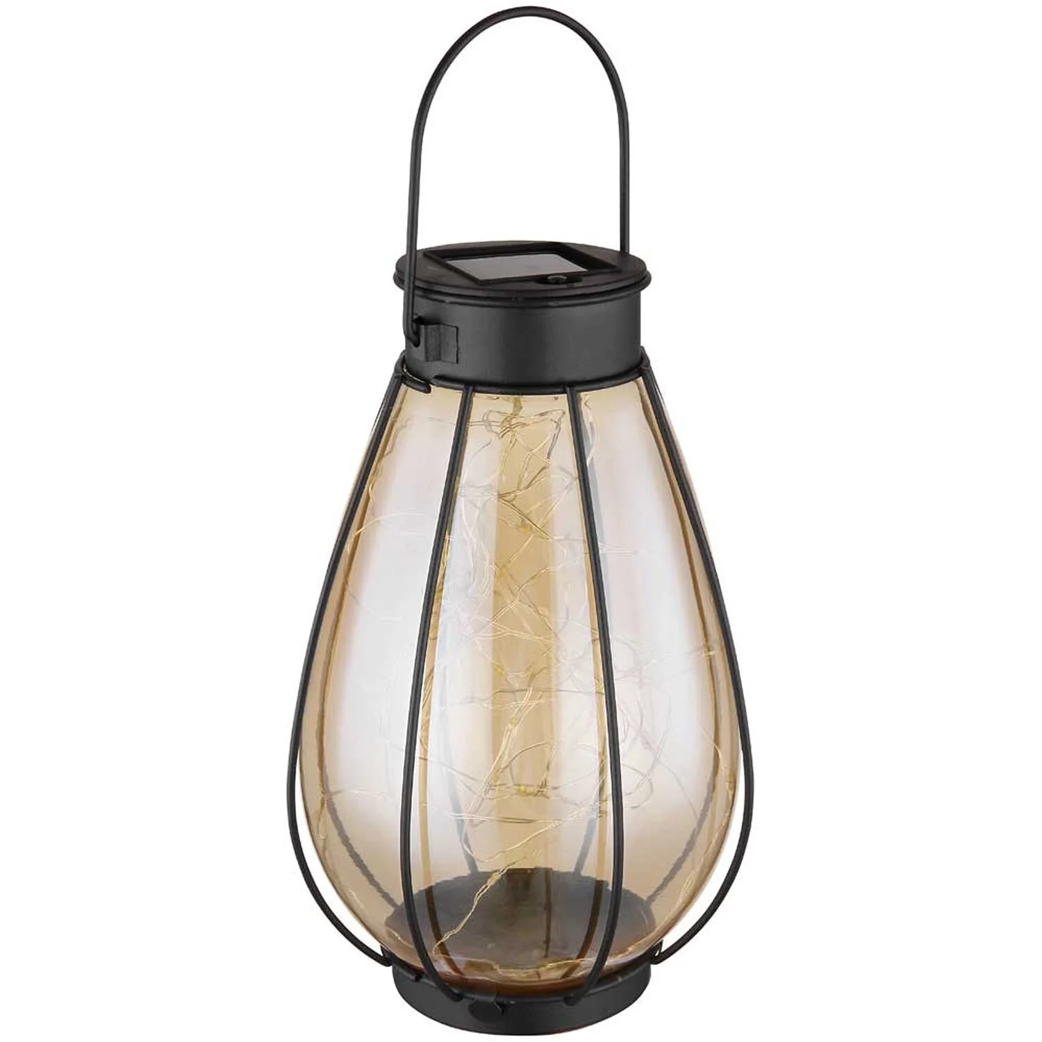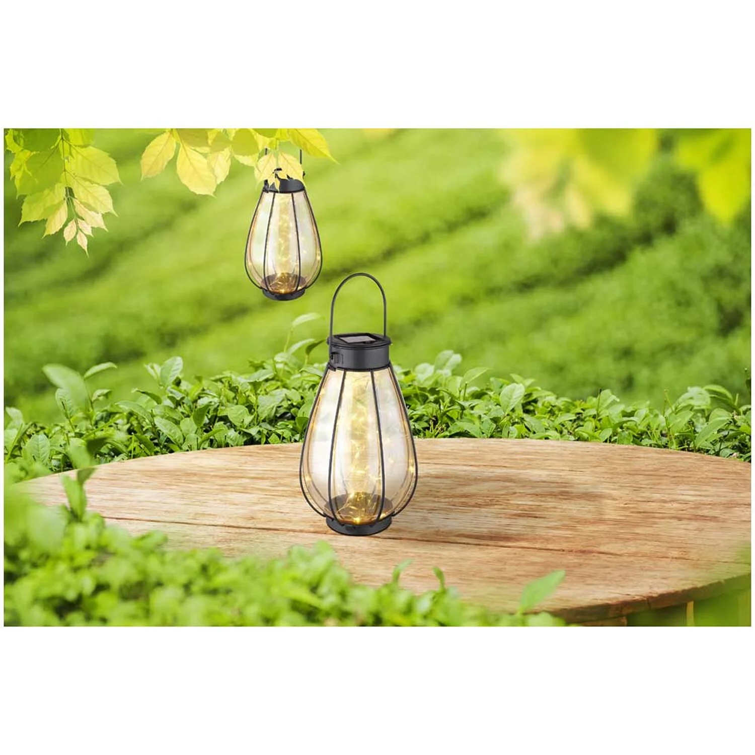 Diese Solarleuchte von Globo aus mattschwarzem Metall hat die Form einer Laterne. In ihrem Innern befindet sich eine LED-Lichterkette, die durch die getönten Glasscheiben ein angenehmes, warmweisses Licht (3’000 K) erzeugt. Die Leuchte kann dank Bürgel sowohl in hängender als auch in stehender Position bewundert werden. Dank IP44-Schutzgrad gegen Spritzwasser ist sie ideal für den Aussenbereich geeignet.