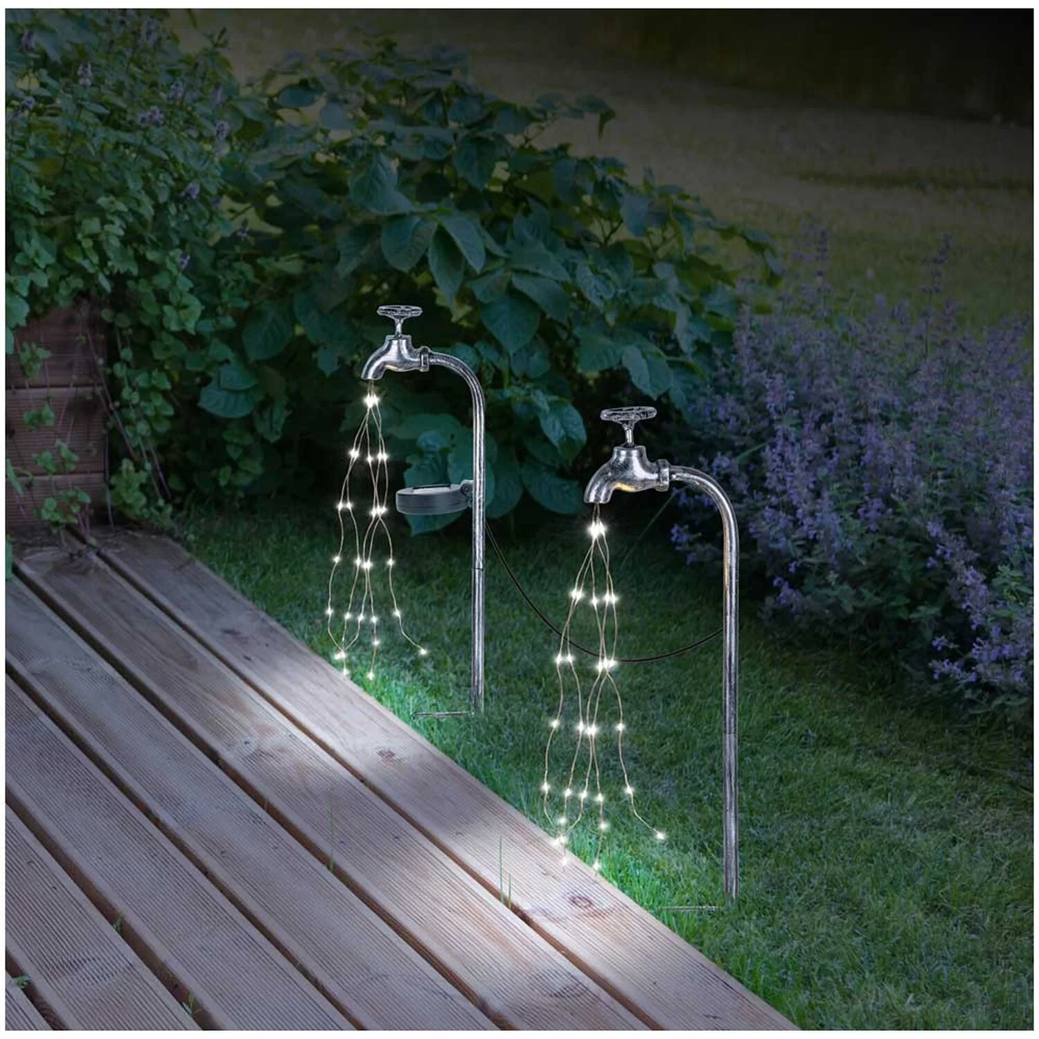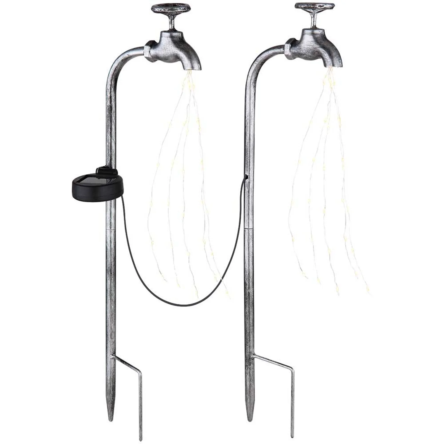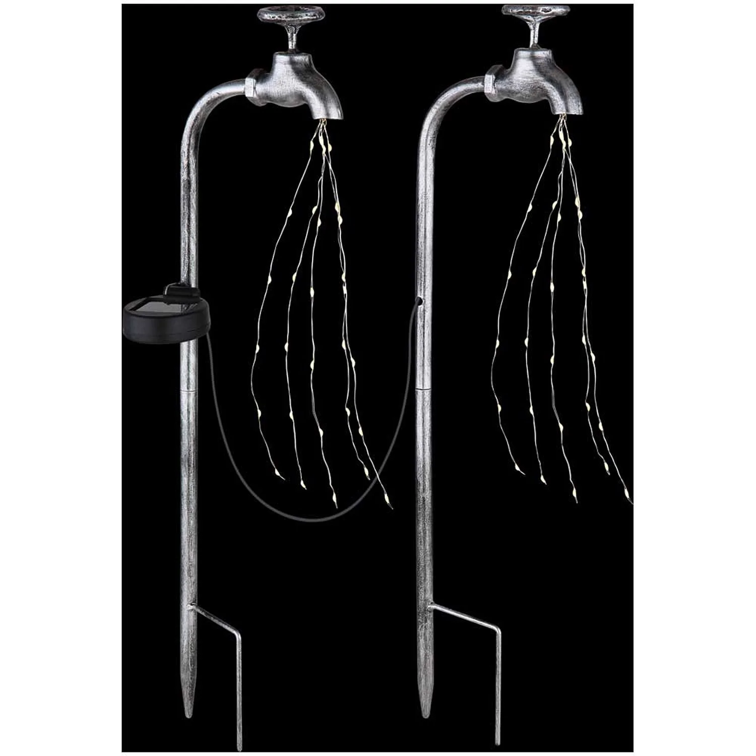 Diese Solarleuchte von Globo aus silberfarbenem Metall begeistert durch ihr ausgefallenes Design. An den Metallstangen mit 50 cm Abstand ist je ein Deko-Wasserhahn befestigt, aus dem ein Lichterkettenstrahl mit insgesamt 60 LED-Leuchtmitteln verläuft und der ein warmweisses Licht erzeugt (3’000 K). Das Modell lässt sich mittels zweier Erdspiesse aufstellen und verfügt über einen Schalter, um das Licht nach Belieben ein oder auszuschalten. Dank IP44-Schutzgrad gegen Spritzwasser ist die Leuchte ideal für den Aussenbereich geeignet.