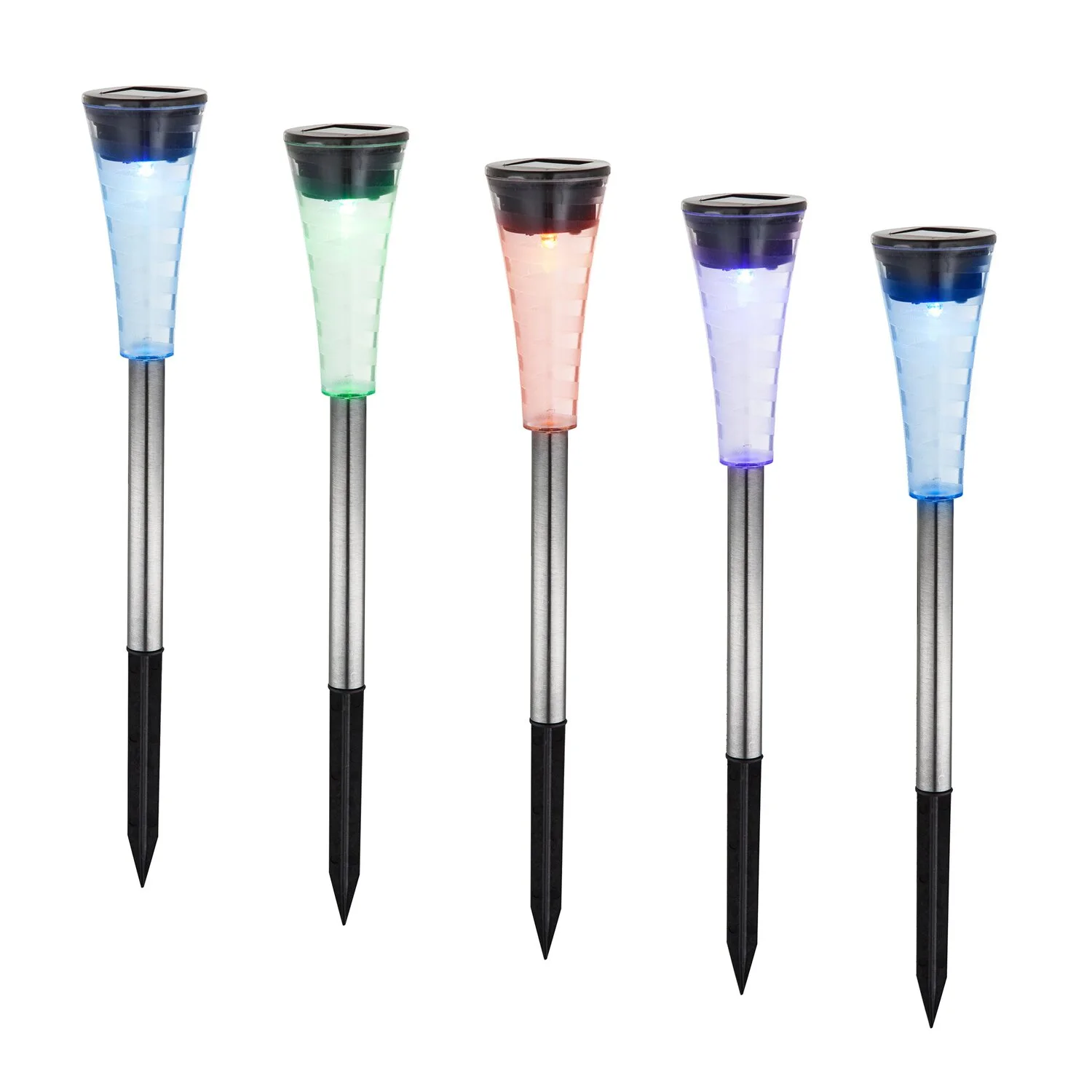 Diese LED-Solarleuchte im 5er-Set hat es in sich. Die Kombination aus Edelstahl, klaren und satinierten Kunststoff sowie der Möglichkeit die Lichtfarbe zu wechseln, bringt einen einzigartigen Look in Ihren Aussenbereich. Die angegebene IP44 Schutzart macht diese Solarlampe für den Aussenbereich absolut geeignet. Diese 27 cm grosse Solarlampe bietet bei vollständiger Aufladung ca. 8 Stunden lang buntes Licht.