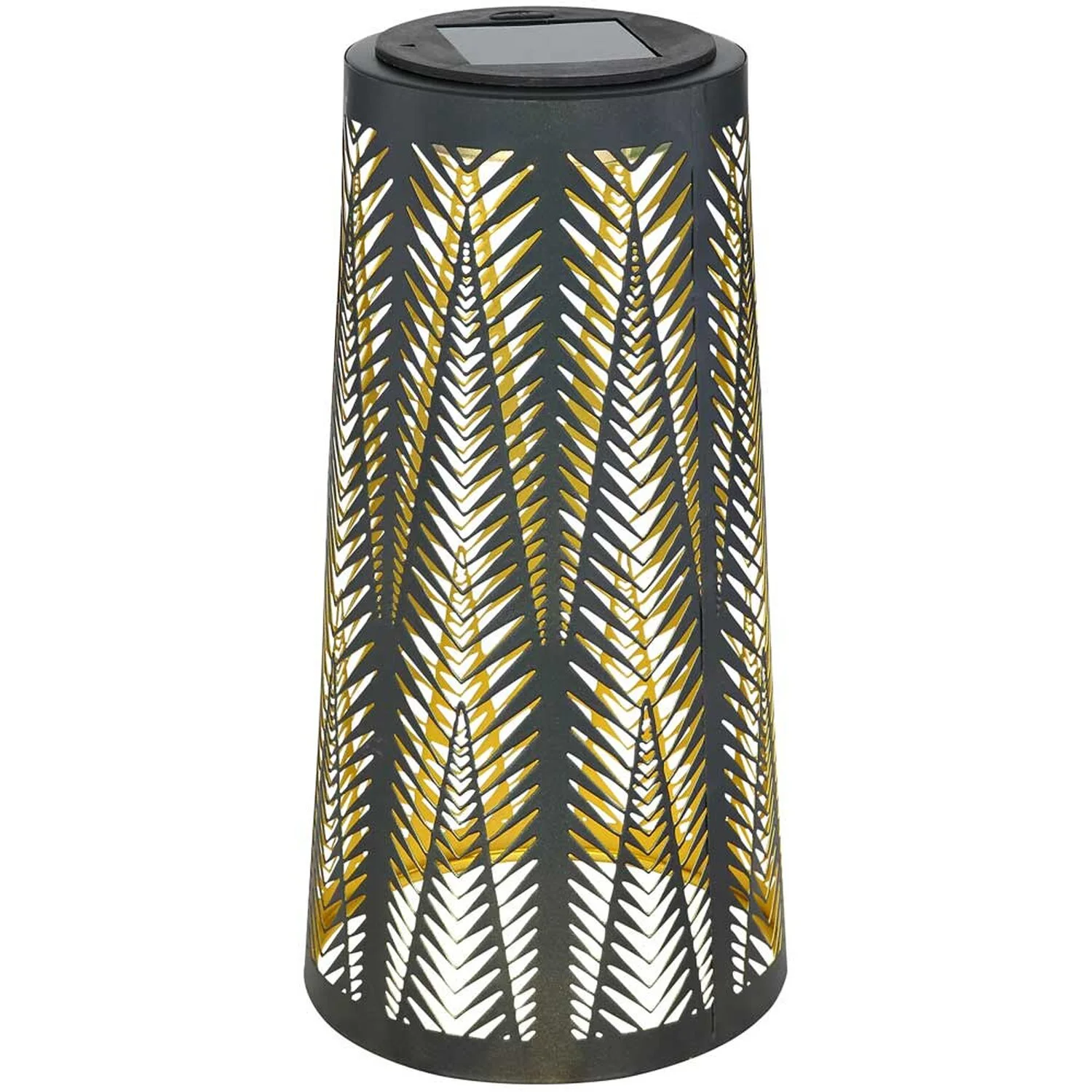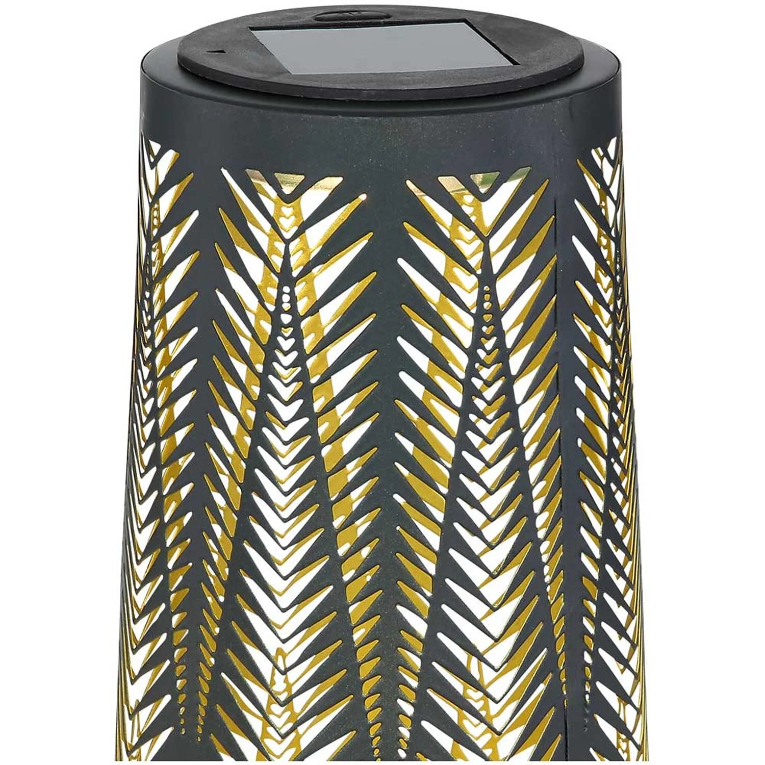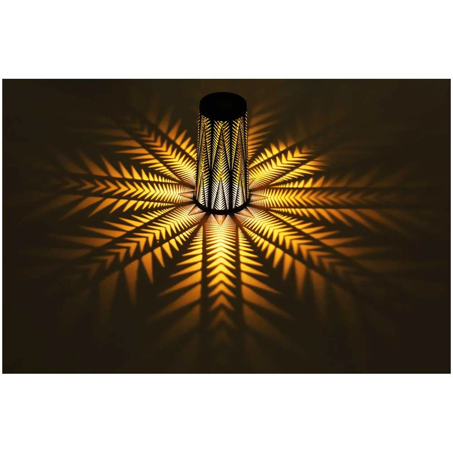 Hierbei handelt es sich um eine zylinderförmige Solarleuchte aus schwarzem, gestanzten Metall und goldfarbener Innenbeschichtung. Diese Solarleuchte begeistert durch ein Lichterspiel, das an Palmblätter erinnert und verwandelt Ihren Aussenbereich in eine tropische Wohlfühloase. Dank des integrierten LED-Leuchtmittels, das bei voll aufgeladenem Akku über eine Leuchtdauer von bis zu 8 h verfügt und ganz von Solarenergie betrieben wird, setzen Sie gekonnt dekorative Akzente in Ihrem Garten, auf dem Balkon oder auf Ihrer Terrasse. Ausserdem ist dieses Produkt mit Schutzart IP44 versehen und somit spritzwassergeschützt.