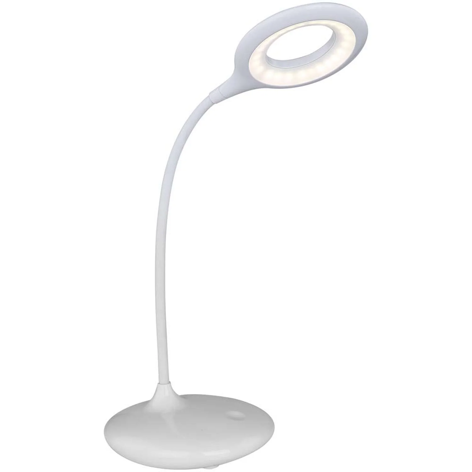 Die Weisse Globo Tischleuchte Pia bringt tolles Licht auf Ihren Schreibtisch. Diese 490 mm hohe Tischleuchte mit fest montiertem LED-Leuchtmittel (5W) liefert einen Lichtstrom von 260 lm. Die Lampe enthält einen eingebauten Akku, welcher über das mitgelieferte, externe Steckernetzteil mit passendem Verbindungkabel aufgeladen werden kann. Das Kaltweisse Licht (Farbtemperatur 4000 Kelvin) ist abgestimmt auf die Aktivität, die Sie am Schreibtisch entfalten wollen. Ein-, Ausschalten und Dimmen dieser Flexoleuchte erledigen Sie problemlos über den integrierten Touch-Dimmer.