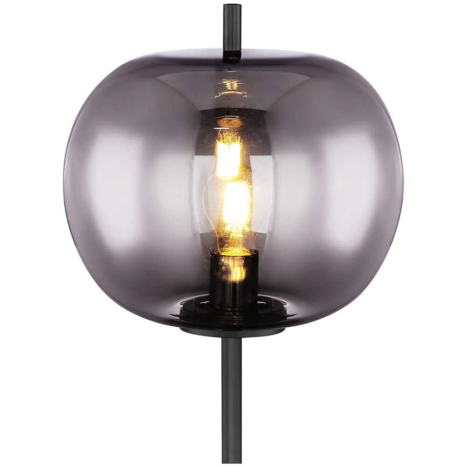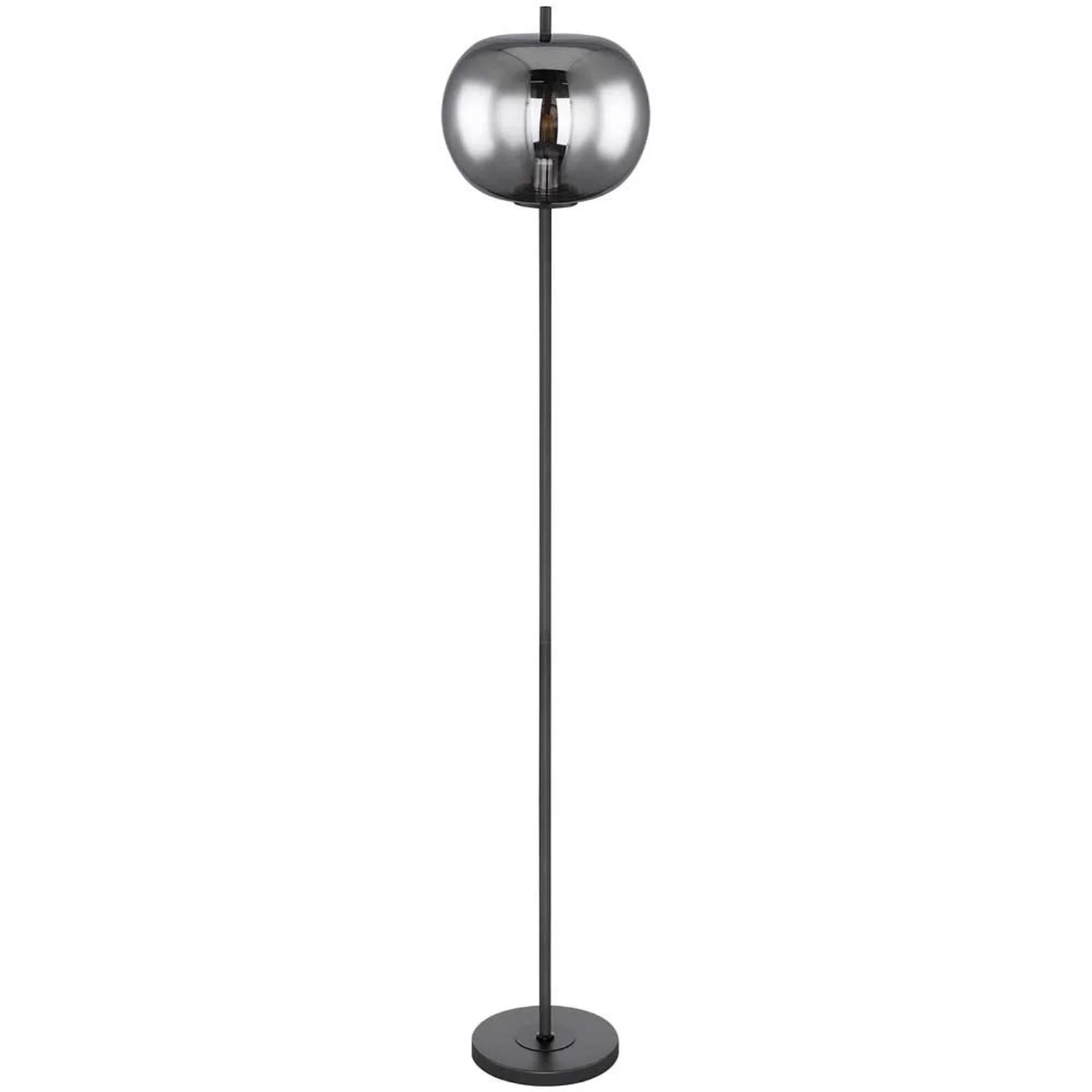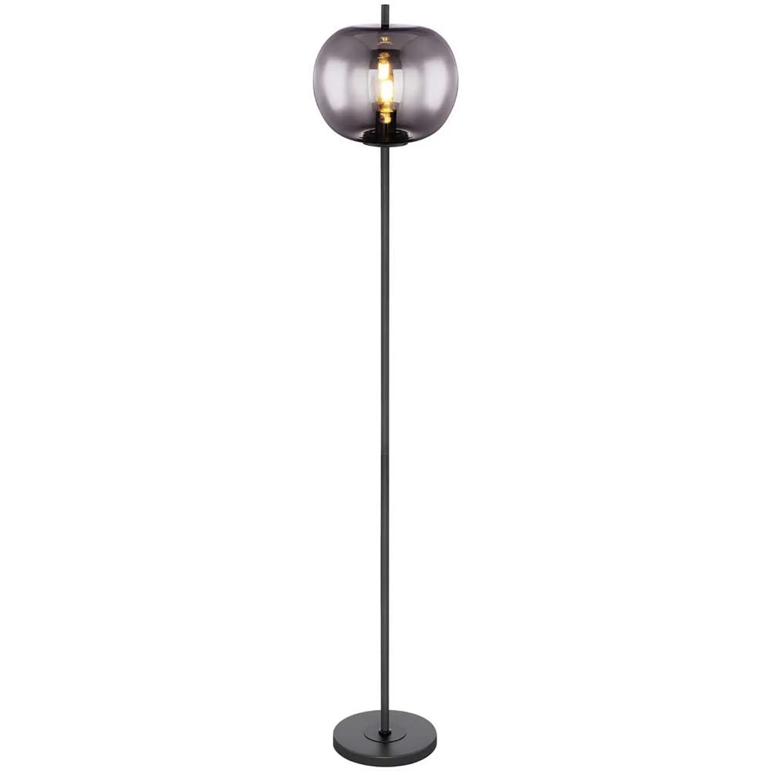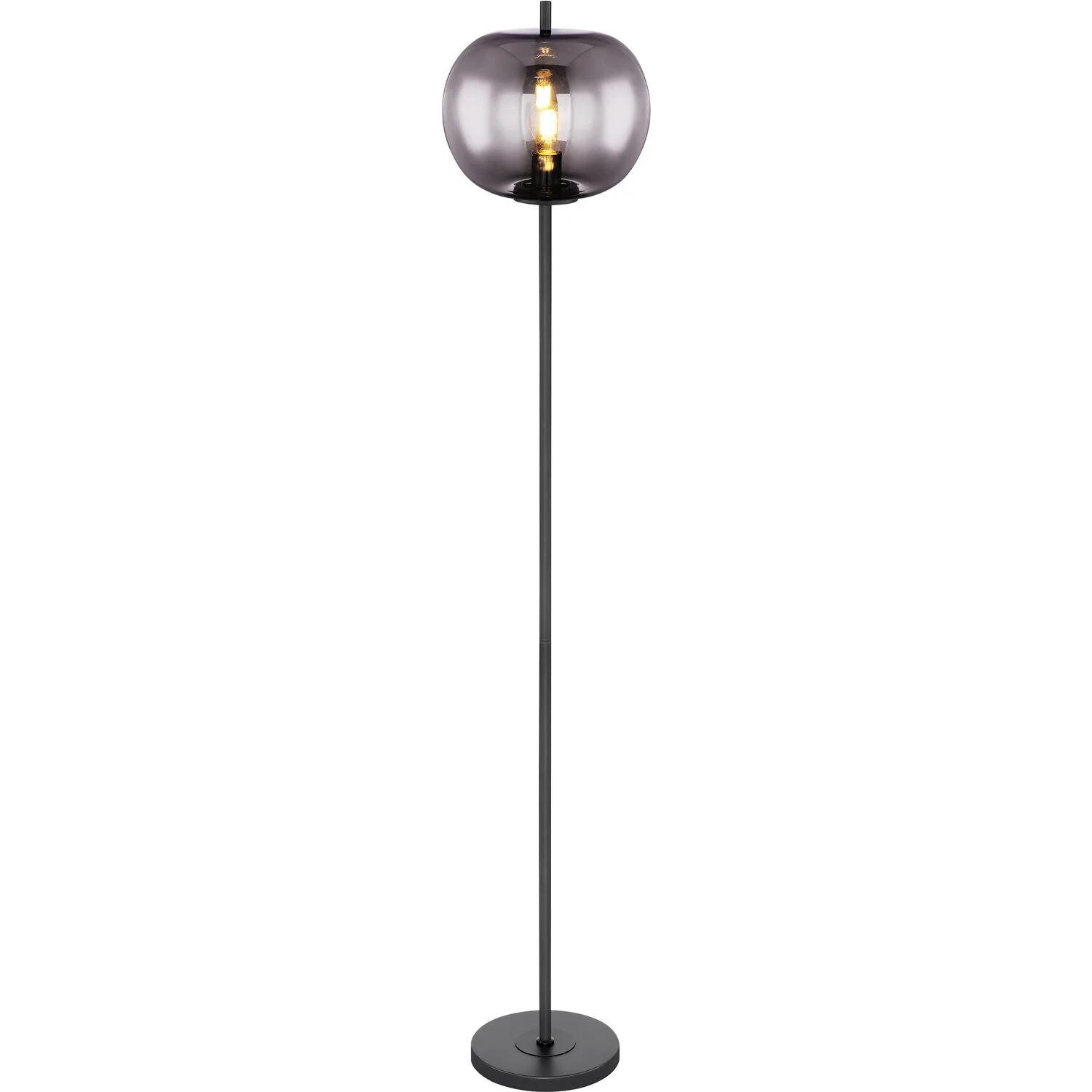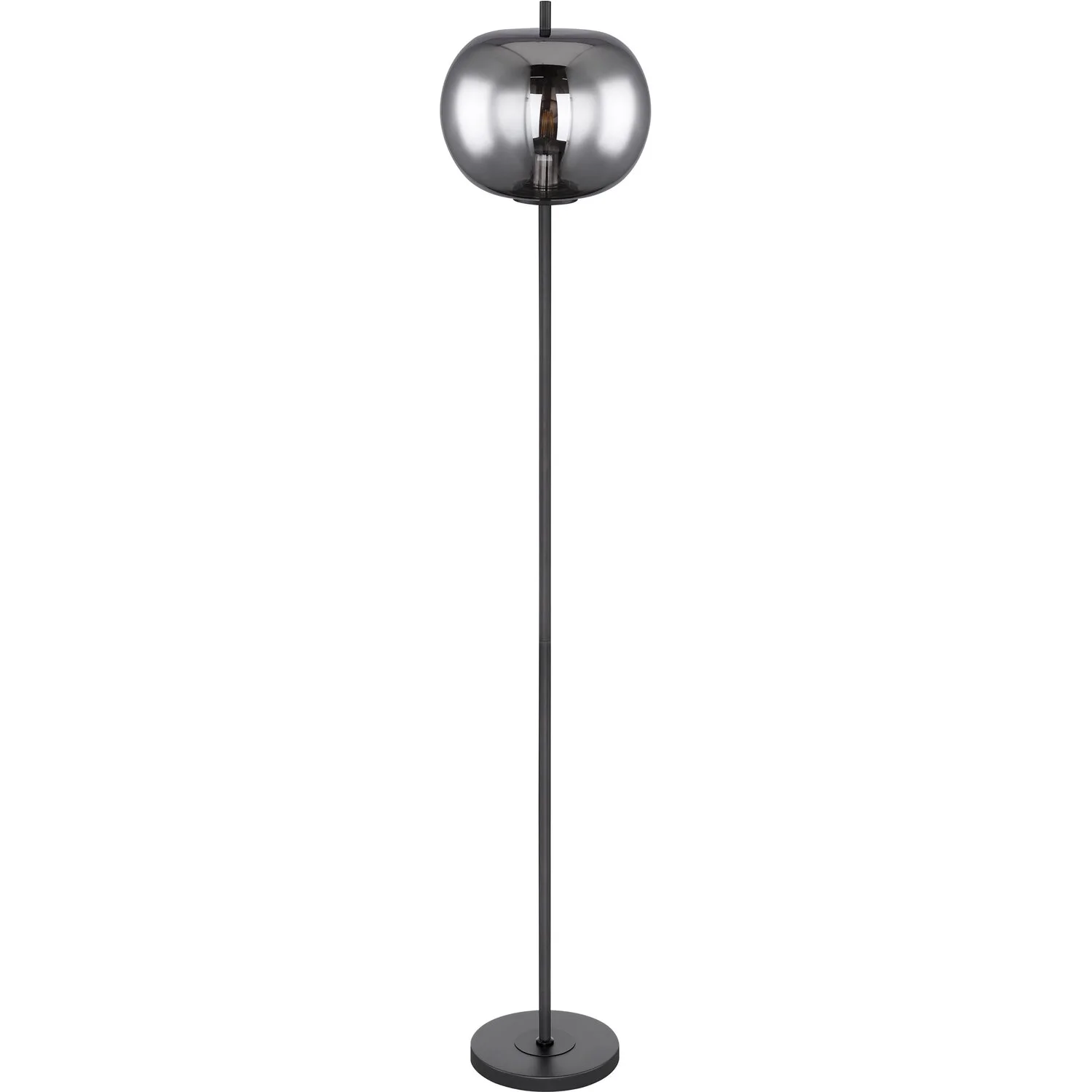 Die Stehleuchte Blacky aus schwarzem Metall mit rauchfarbenem Glas setzt moderne Akzente in Ihrer Wohnung. Der kugelförmige Glasschirm hat einen Durchmesser von 30 cm. Die 160-cm-hohe Leuchte verfügt über eine E27-Fassung (max. 60 Watt), die eine freie Leuchtmittelwahl ermöglicht.