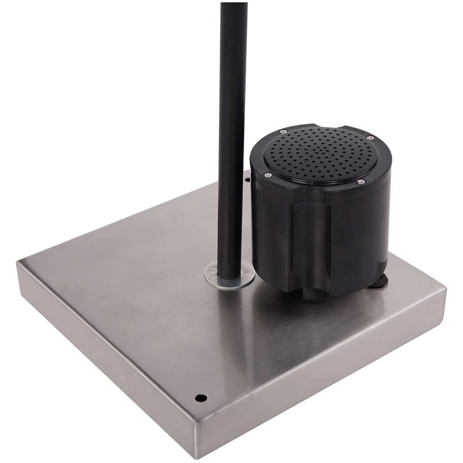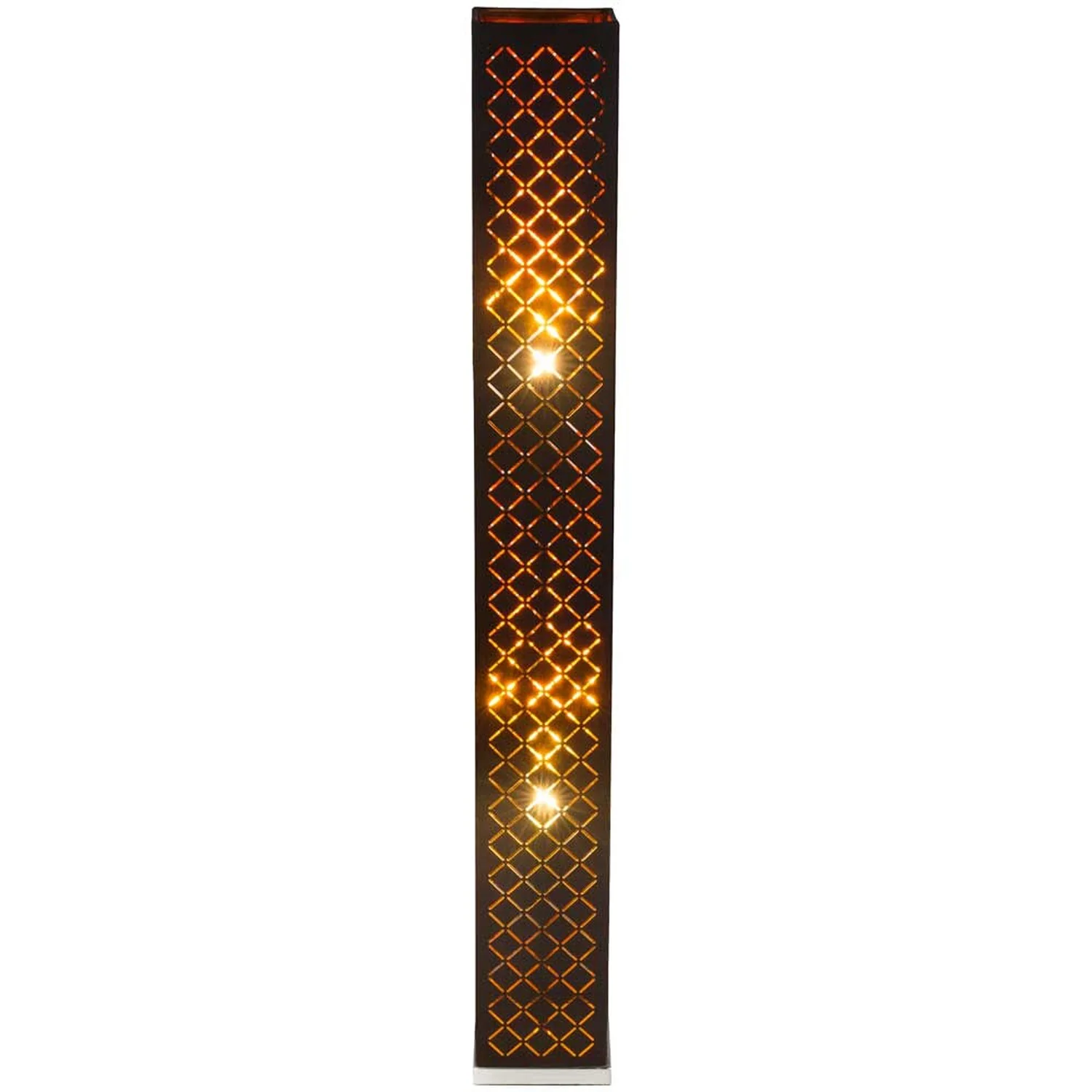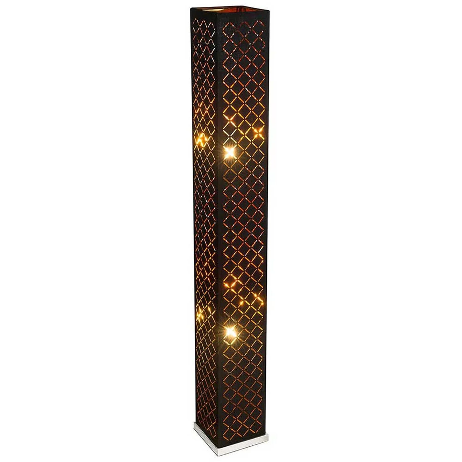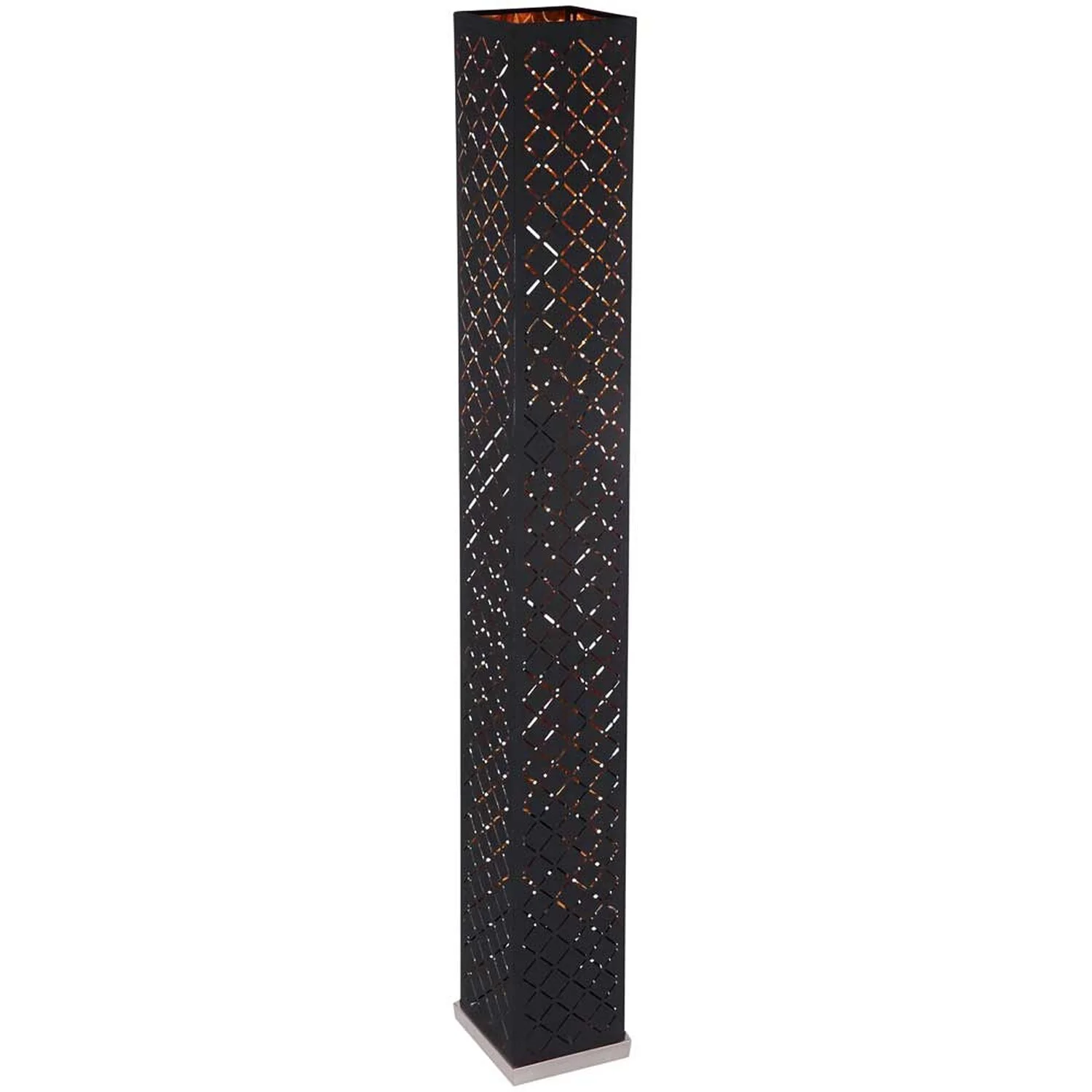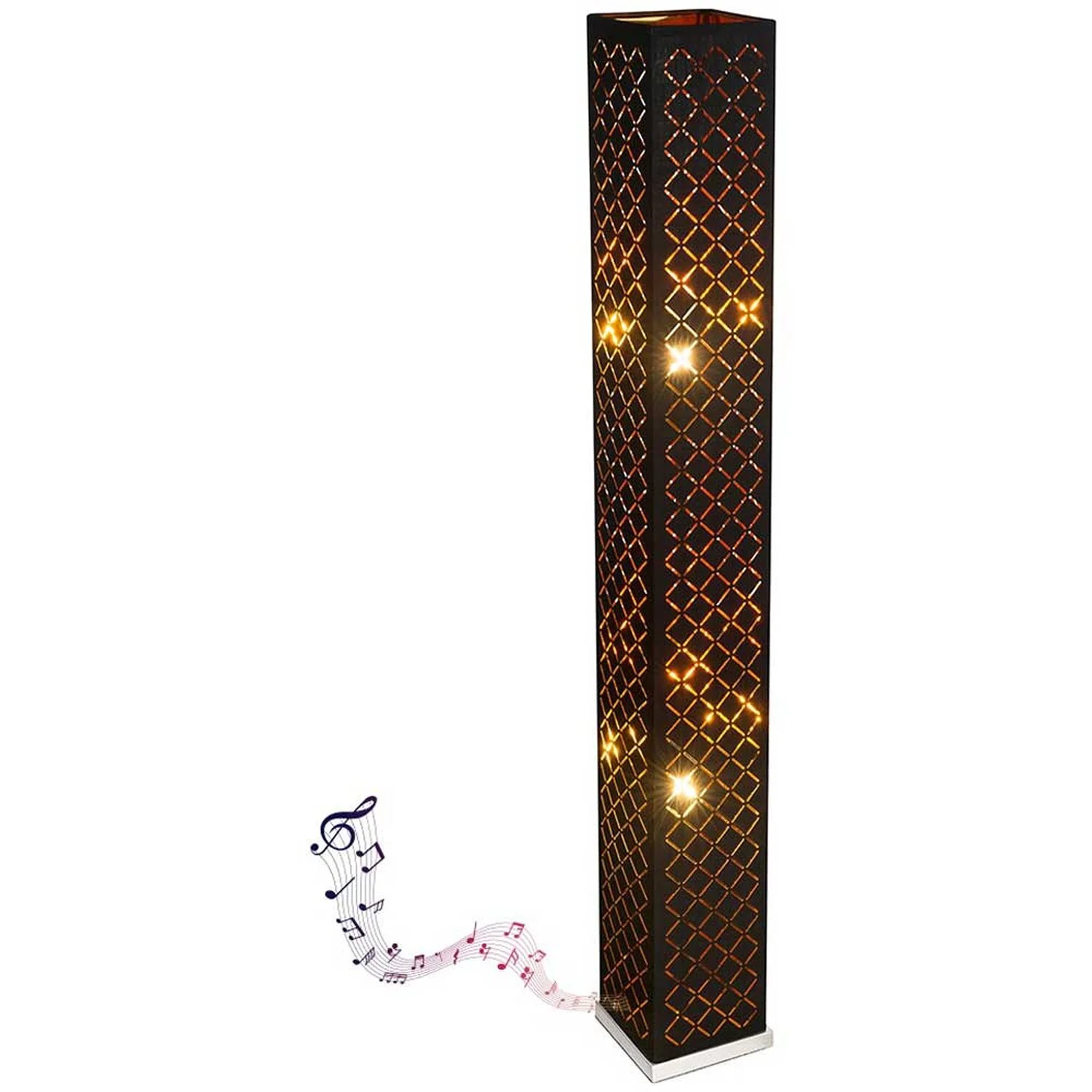 Die quadratische Stehlampe der Modellserie Clarke punktet mit ihrem Individuellen edlen Design. Die 1,18 m hohe Stehleuchte besteht hauptsächlich aus einem mit formschönen Dekorstanzungen dekoriertem schwarzen Textilschirm, der von der Innenseite mit Blattgold belegt ist. Die Innenleuchte ist mit zwei E27-Fassungen ausgestattet, die es Ihnen ermöglicht, die Leuchtmittel selbst zu bestimmen (max. 40 W) um damit über Lichtstärke und Lichtfarbe zu entscheiden. Aufgrund ihrer Stromersparnis und Langlebigkeit werden LED-Leuchtmittel empfohlen. Der serienmässige Ein- und Aus-Schalter und das 1,8 Meter lange Anschlusskabel machen die Leuchte flexibel einsetzbar. Zusätzlich verfügt die Leuchte über einen integrierten 5-W-Lautsprecher. Weitere Leuchten der gleichen Modellreihe könnten das Bild in Ihrem Wohnbereich komplettieren.