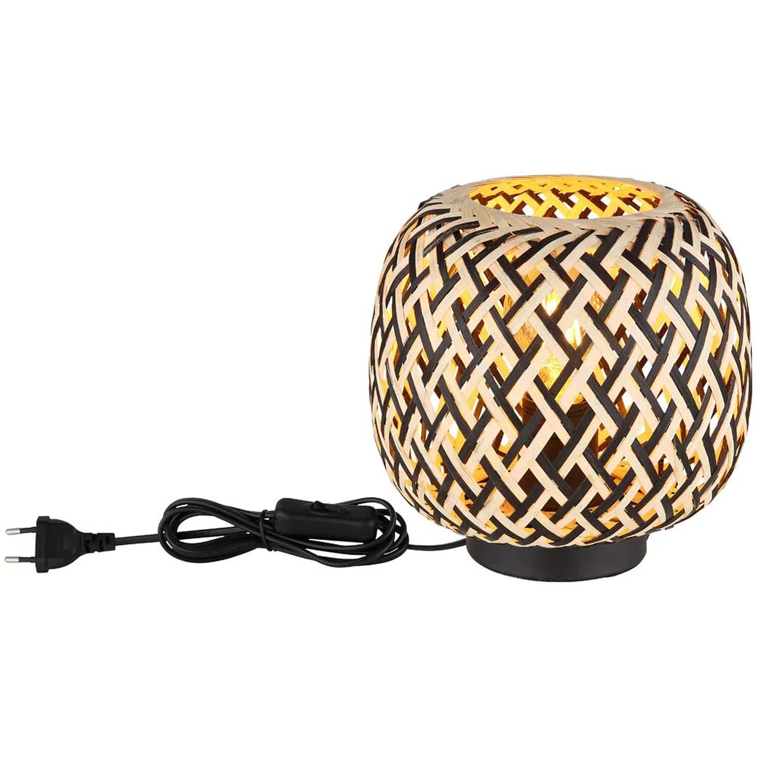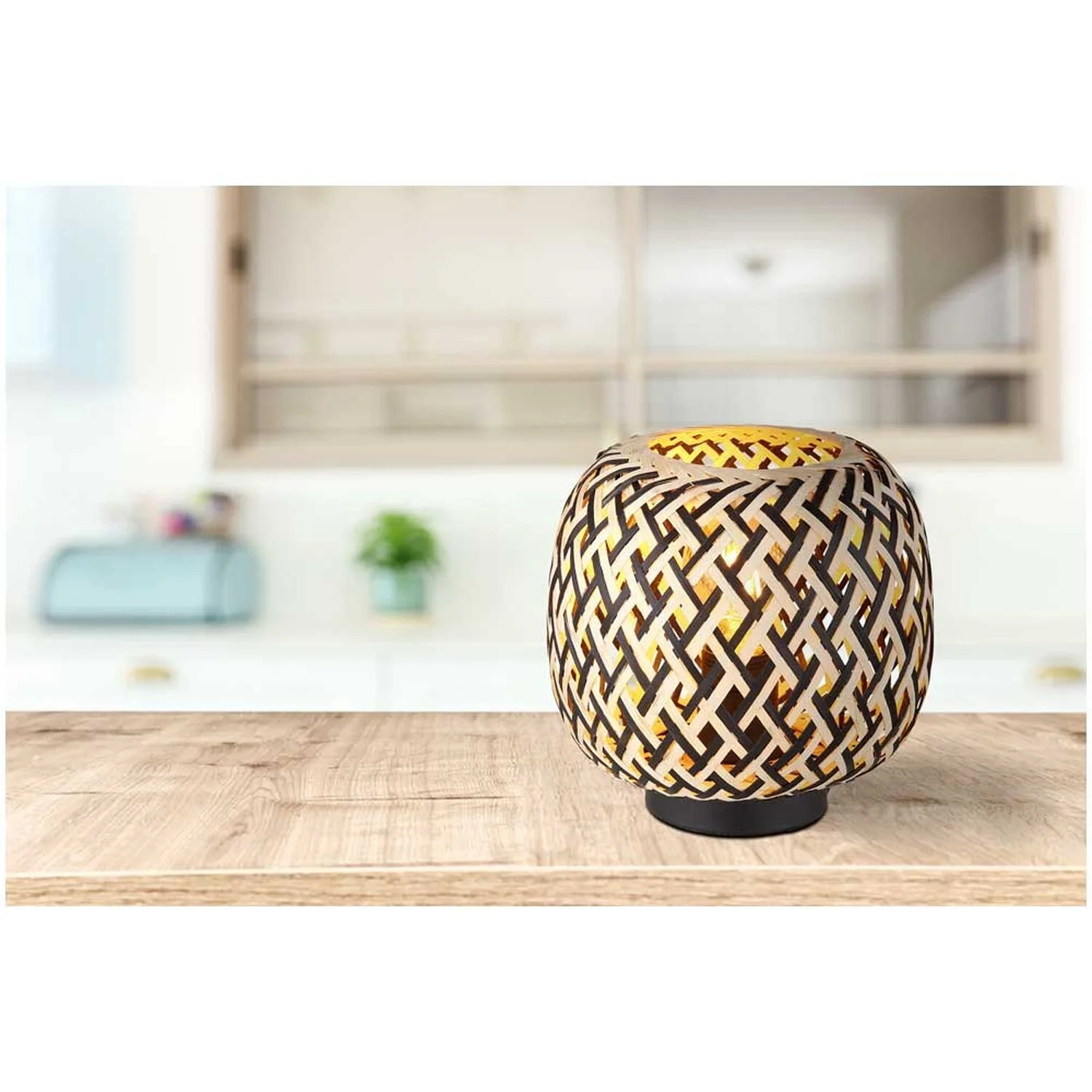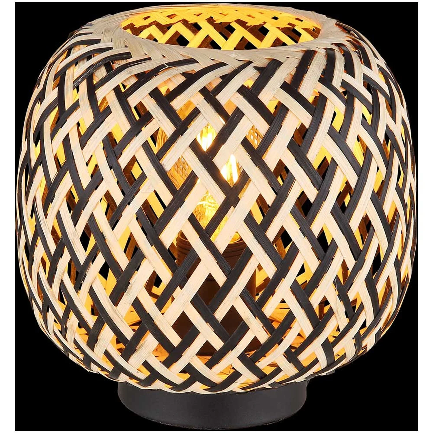 Die Tischleuchte aus der Serie Colly von Globo dient zur Platzierung auf einem Beistelltisch oder der Kommode und sorgt für ein angenehmes Ambientelicht. Die kugelförmig gestaltete Leuchte ist 19,5 cm hoch und besitzt einen Durchmesser von 20 cm. Ihr Lampenschirm besteht aus Bambus in der Farbkombination Schwarz-Natur und besticht durch seine stilvolle Flechtoptik. Dazu ist ein runder Standsockel mit 10 cm Durchmesser aus schwarzem Metall kombiniert. Er integriert einen klassischen Lampensockel der Fassungsgrösse E27. Dadurch lässt sich die Tischleuchte individuell mit einem passenden LED-Leuchtmittel bestücken, das separat erhältlich ist. Dabei stellt die einflammige Innenleuchte eine Leistungsaufnahme von bis zu 15 W zur Verfügung. Die Stromversorgung wird über das zugehörige Kabel inklusive Euro-Netzstecker und Ein-/Ausschalter hergestellt.