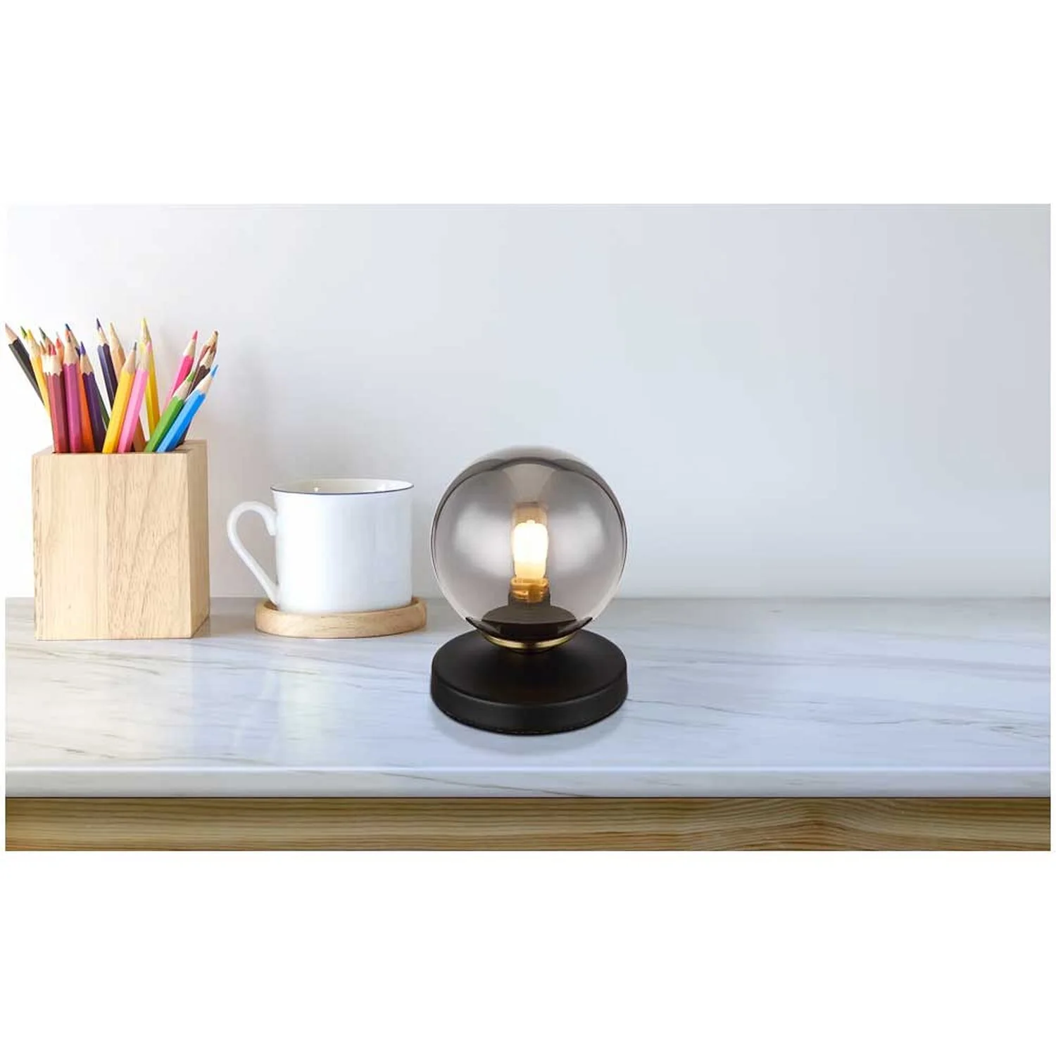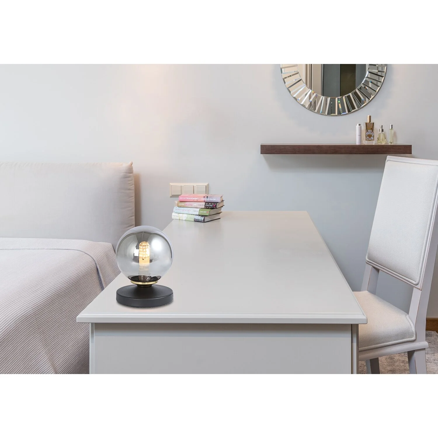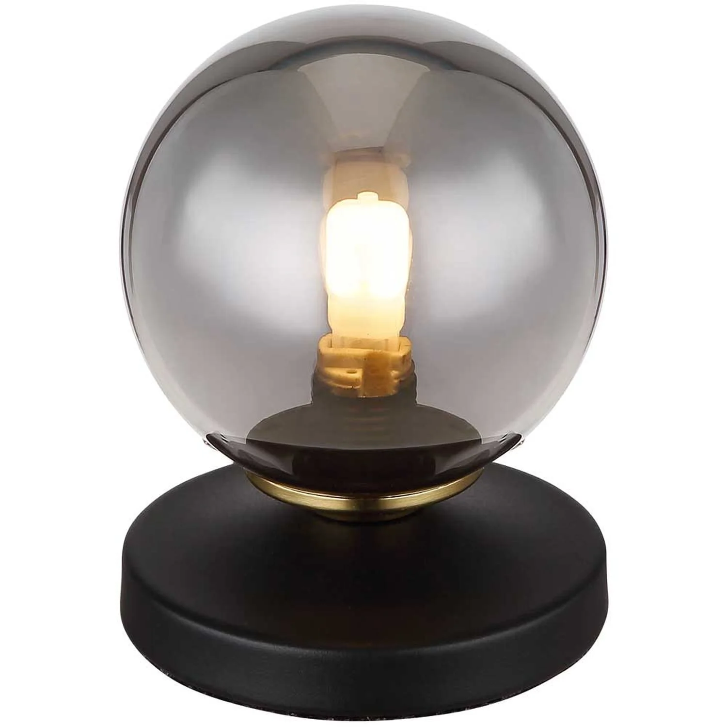 Diese schlichte Tischleuchte begeistert durch ihre schöne Farbgebung. Aus einem runden Sockel ragt eine G9-Fassung mit einem edlen, rauchfarbenen Glasschirm von 10 cm Durchmesser.