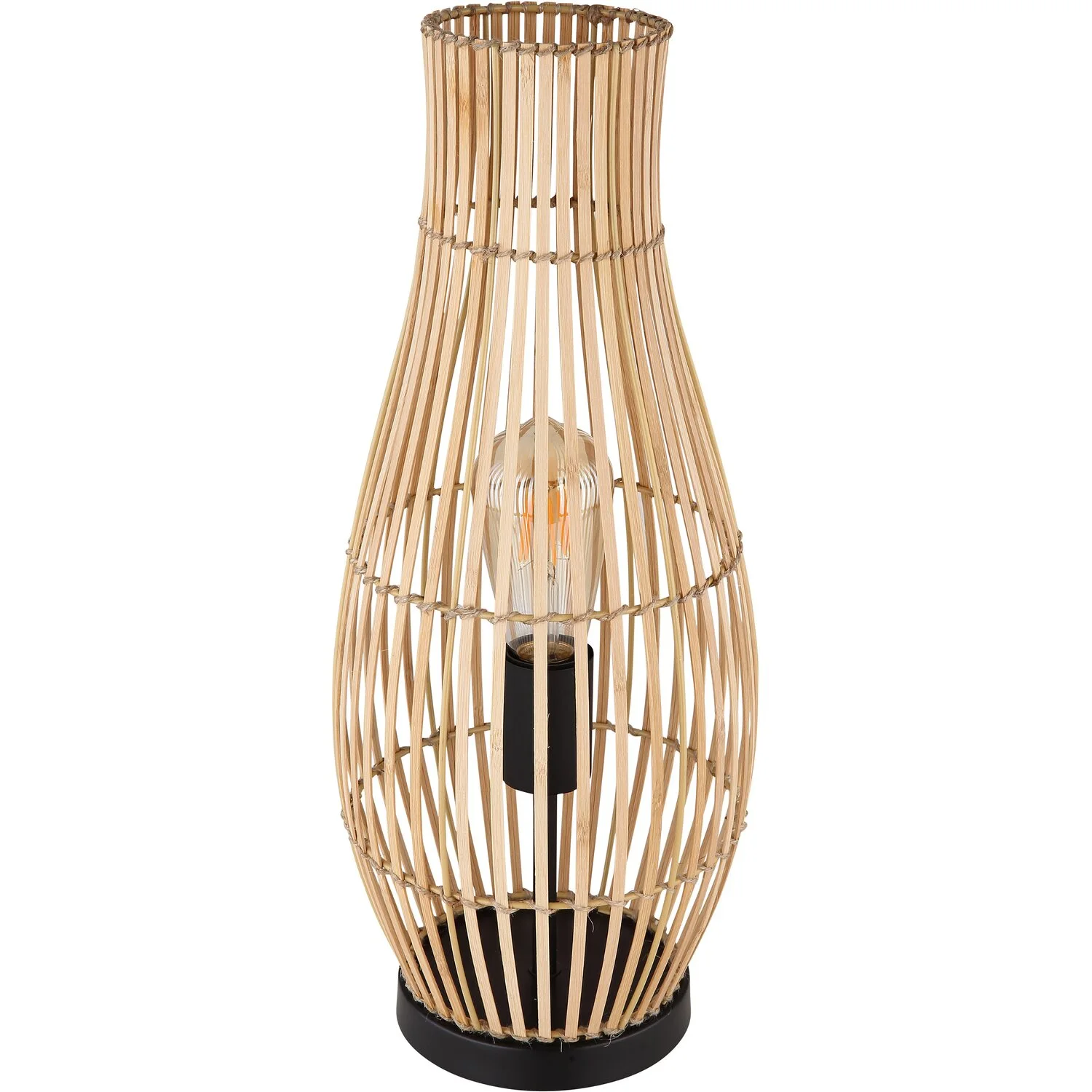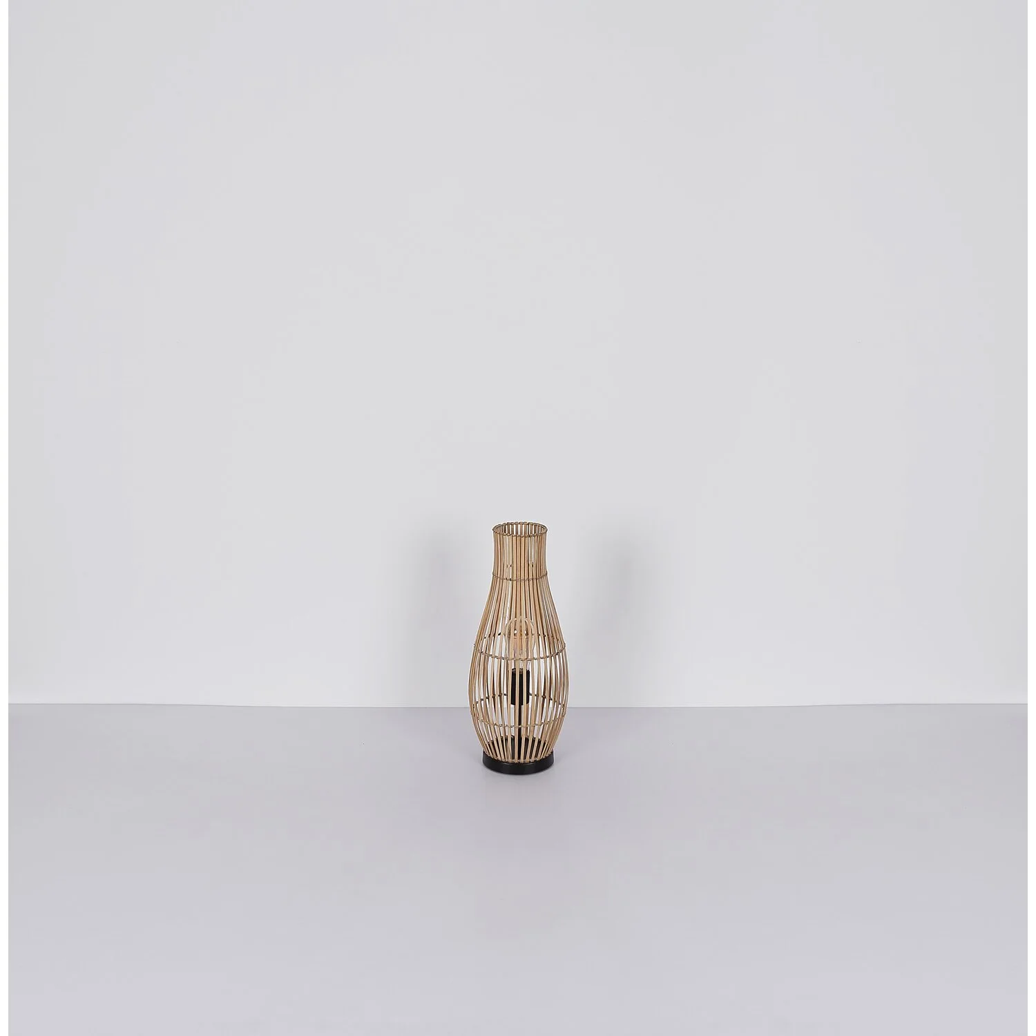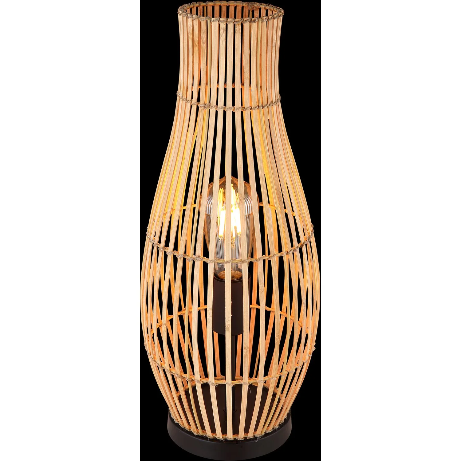 Diese tolle Tischleuchte begeistert durch die Materialien Bambus und Hanf. Aus einem runden Sockel in Schwarz verläuft ein ovaler Schirm aus Bambus und Hanf ca. 48 cm in die Höhe. Im Inneren des Bambusschirms befindet sich eine E27-Fassung für eine maximale Leistung von 60 W, sodass Sie selbst über Lichtfarbe und Helligkeit bestimmen können. Aufgrund von Langlebigkeit und Stromersparnis ist ein LED-Leuchtmittel empfehlenswert.
