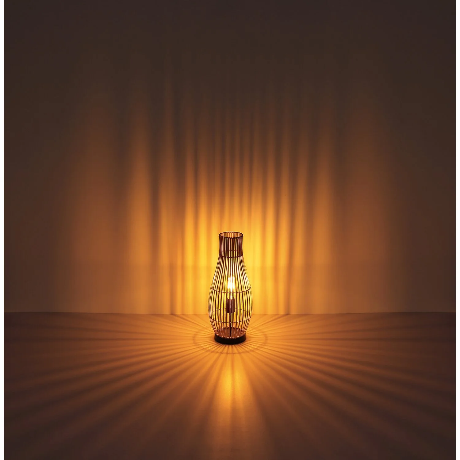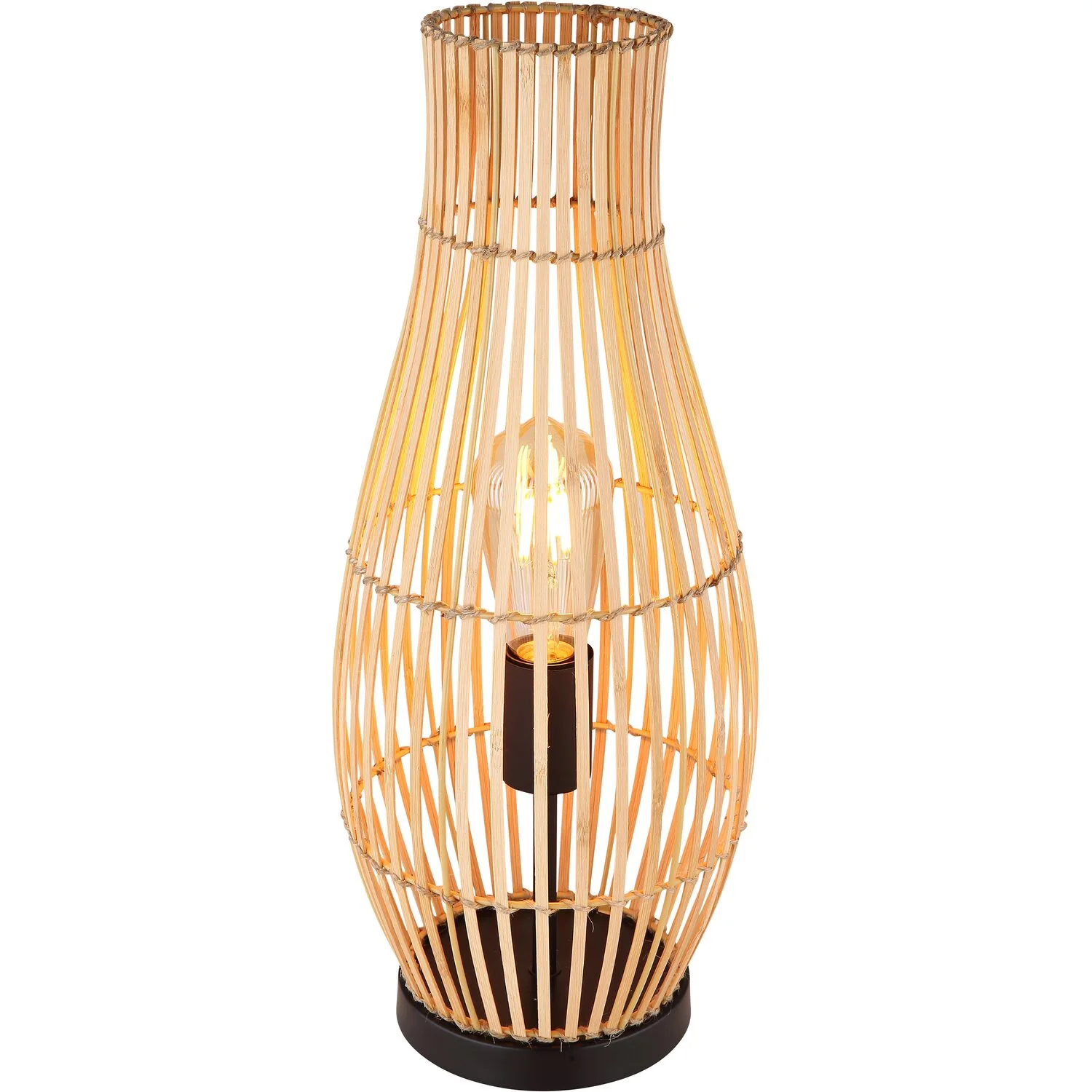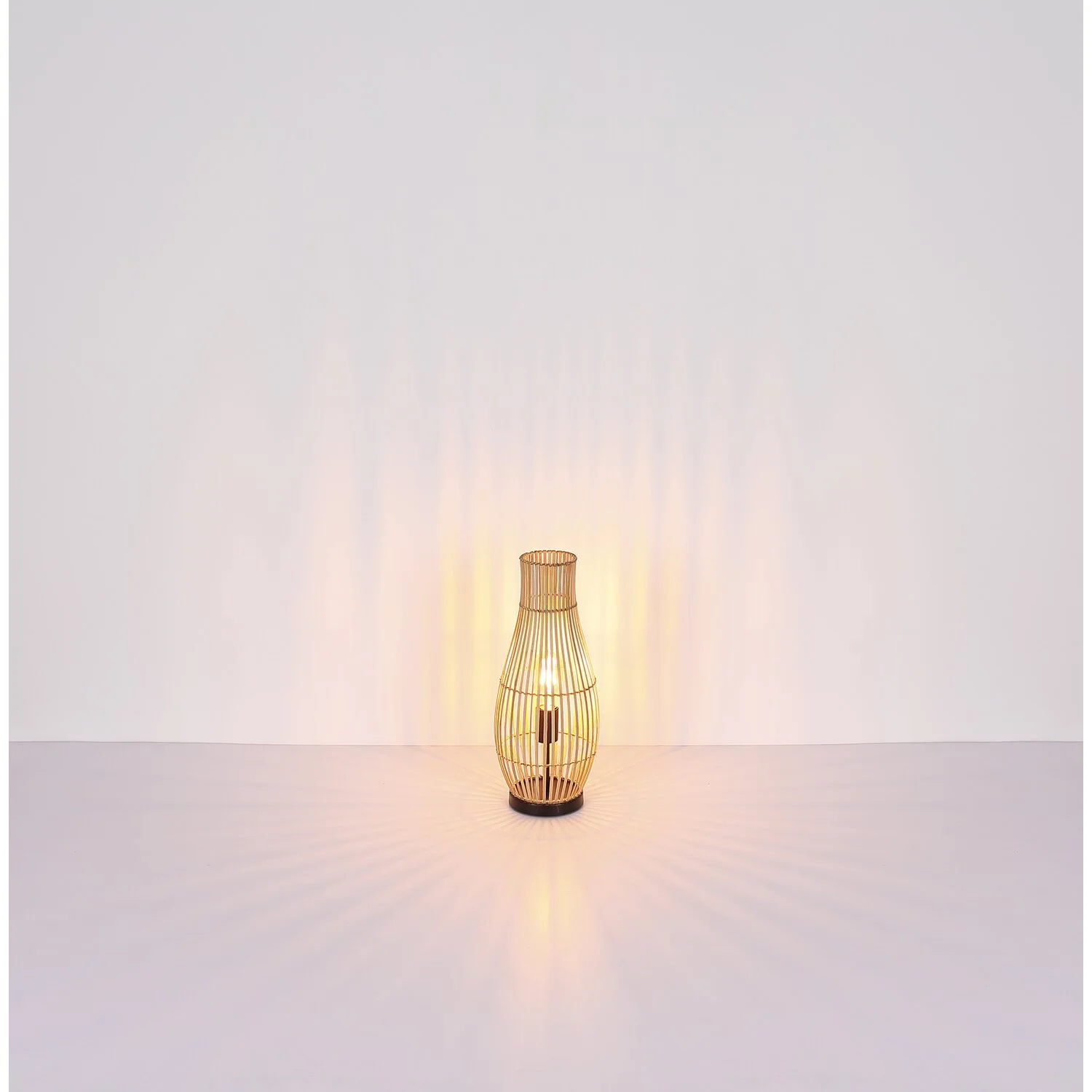 Diese tolle Tischleuchte begeistert durch die Materialien Bambus und Hanf. Aus einem runden Sockel in Schwarz verläuft ein ovaler Schirm aus Bambus und Hanf ca. 48 cm in die Höhe. Im Inneren des Bambusschirms befindet sich eine E27-Fassung für eine maximale Leistung von 60 W, sodass Sie selbst über Lichtfarbe und Helligkeit bestimmen können. Aufgrund von Langlebigkeit und Stromersparnis ist ein LED-Leuchtmittel empfehlenswert.