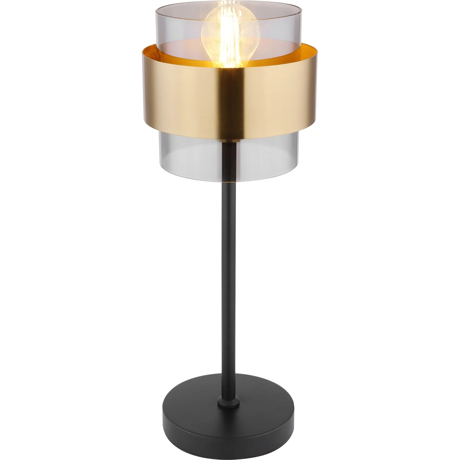 Die Tischlampe Milley von Globo mit einem Durchmesser von 18 cm besticht durch ihr ästhetisches Design aus mattem schwarzen Metall und rauchigem Glas. Die 47 cm grosse Tischleuchte besteht aus einem runden Metallsockel, der mit einem Metallstab versehen ist. Dieser verfügt an der Spitze über einen zylinderförmigen, rauchigen Glasschirm mit Messingring, den Sie mit einem passenden Leuchtmittel Ihrer Wahl bestücken können. Dadurch haben Sie die Möglichkeit, Lichtfarbe und Helligkeit individuell zu bestimmen. Durch weitere Modelle der gleichen Serie können Sie in Ihren Innenräumen stilvolle Akzente setzen und das Gesamtbild komplettieren.