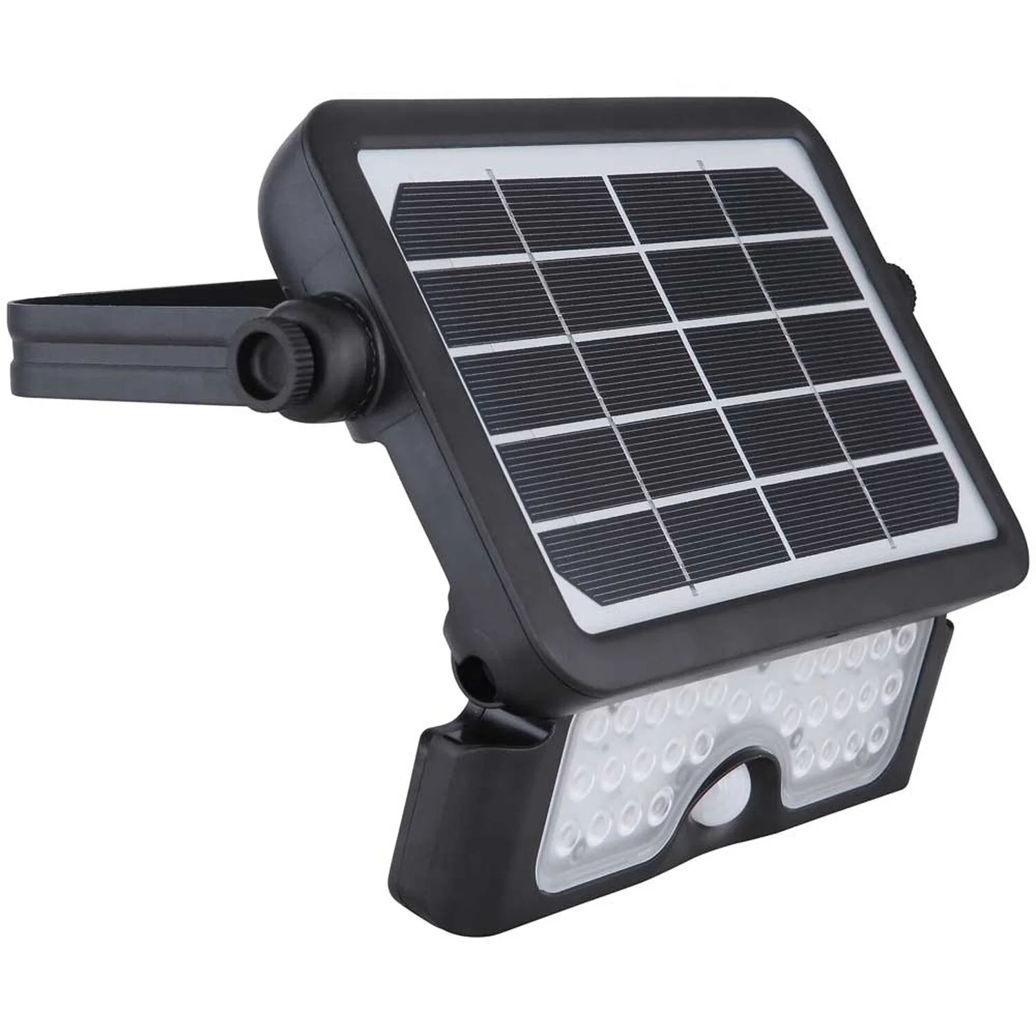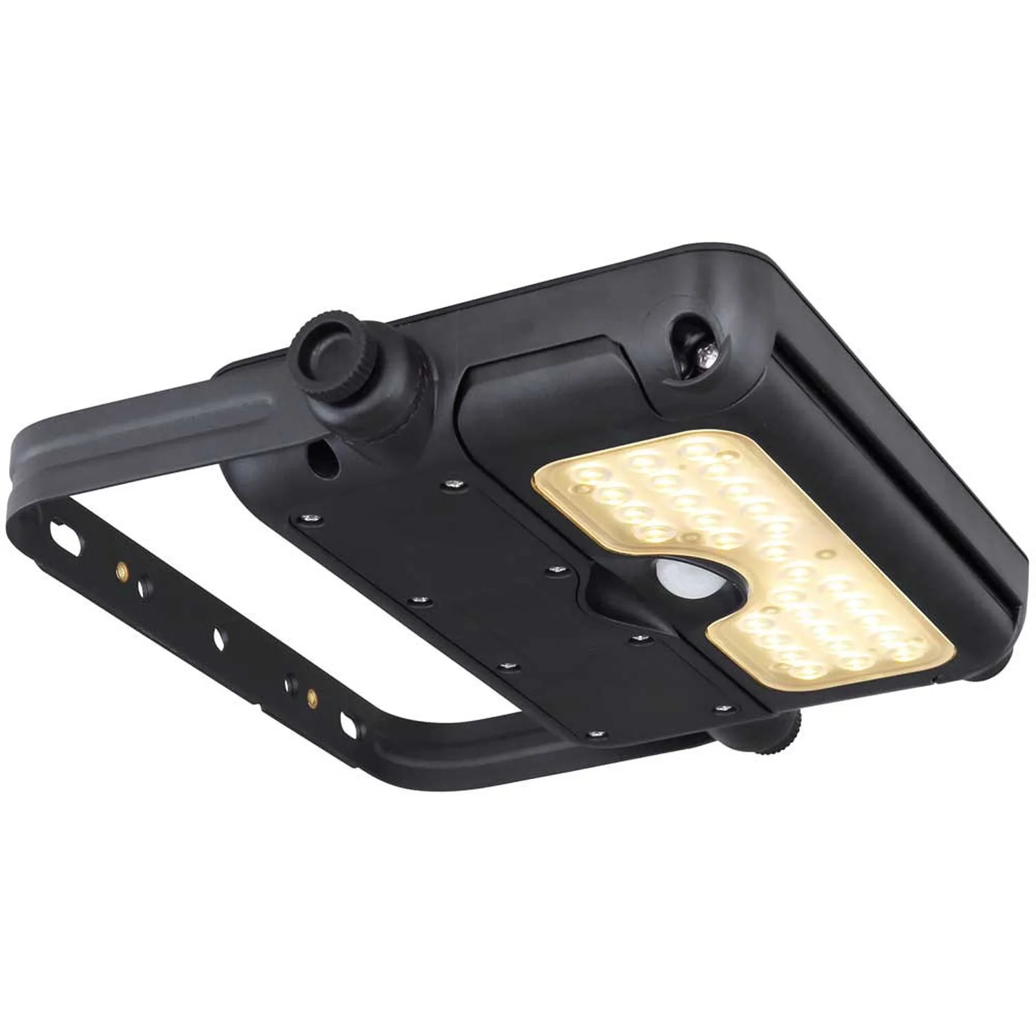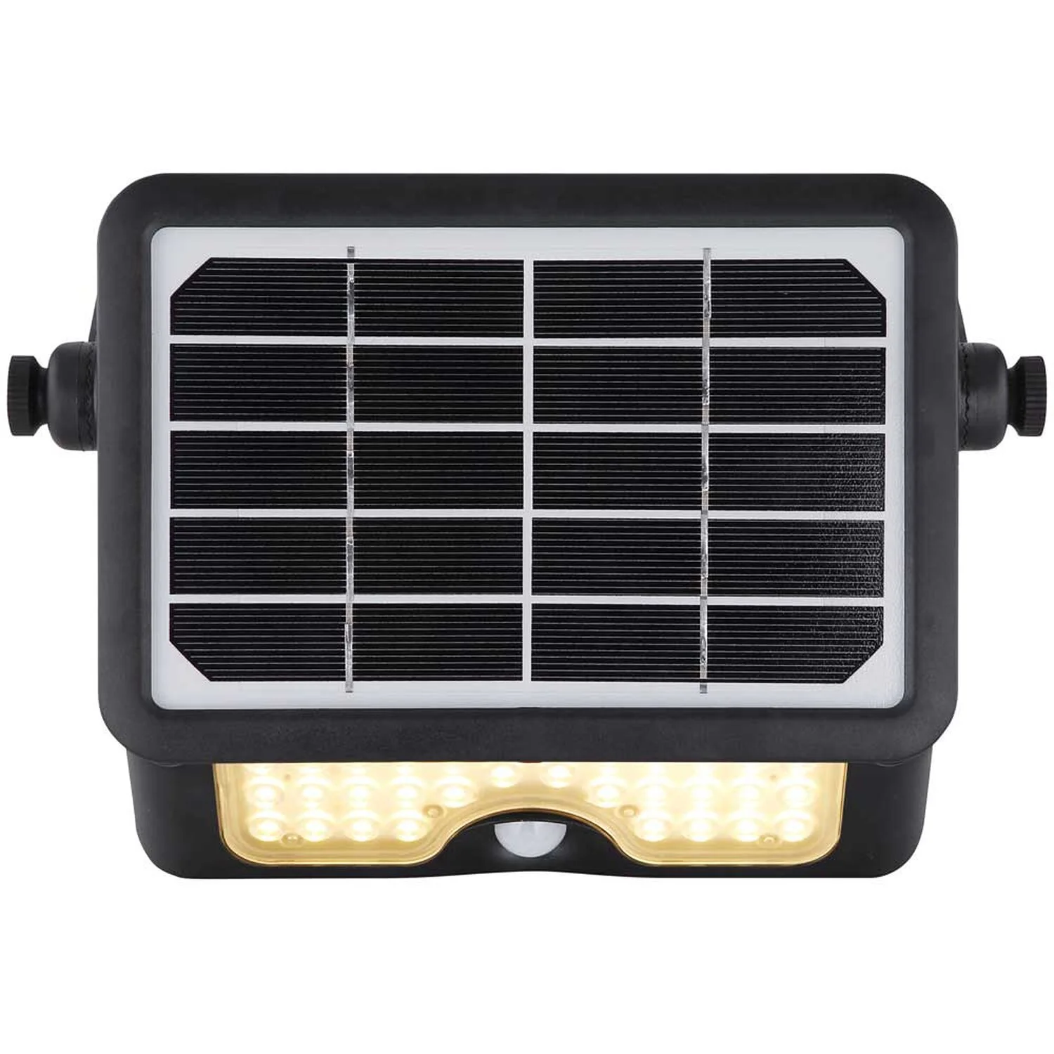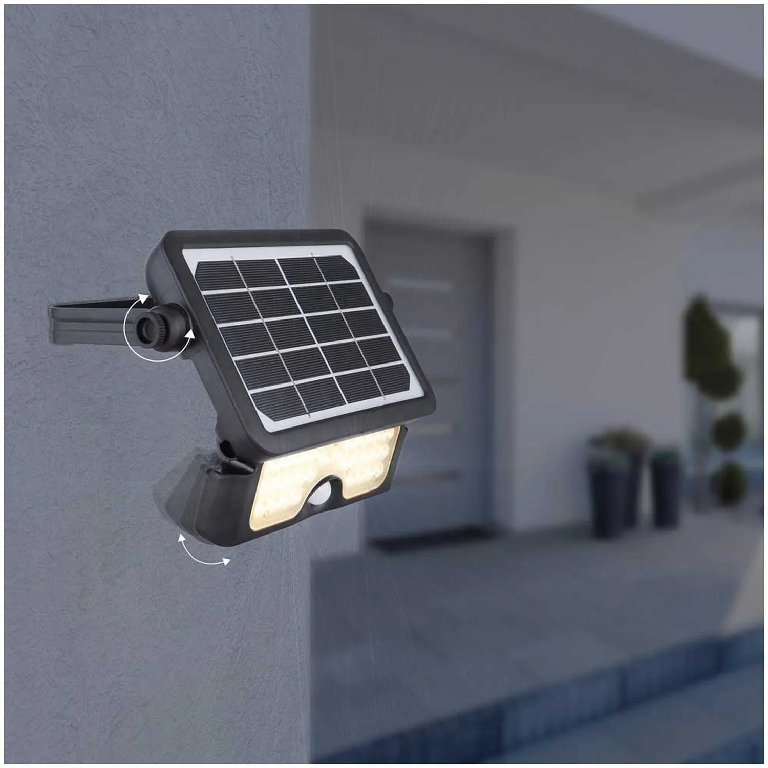 Diese Solarleuchte aus schwarzem Kunststoff ist eine wunderschöne Ergänzung für Ihren Aussenbereich. Die 23,2 cm breite Solarleuchte wird mithilfe des Bügels an die Wand montiert. Dieser ist auch für die Drehfunktion der Solarzellen zuständig, an denen wiederum das LED-Leuchtmittel montiert ist, dessen Winkel Sie ebenfalls individuell einstellen können. Die Solarleuchte verfügt auch über einen Bewegungsmelder. Zusammen mit dem 500 lm starken und angenehm warmweissen Licht (3’000 K) des solarbetriebenen LED-Leuchtmittels können Sie für eine stilvolle Beleuchtung Ihres Aussenbereichs sorgen.