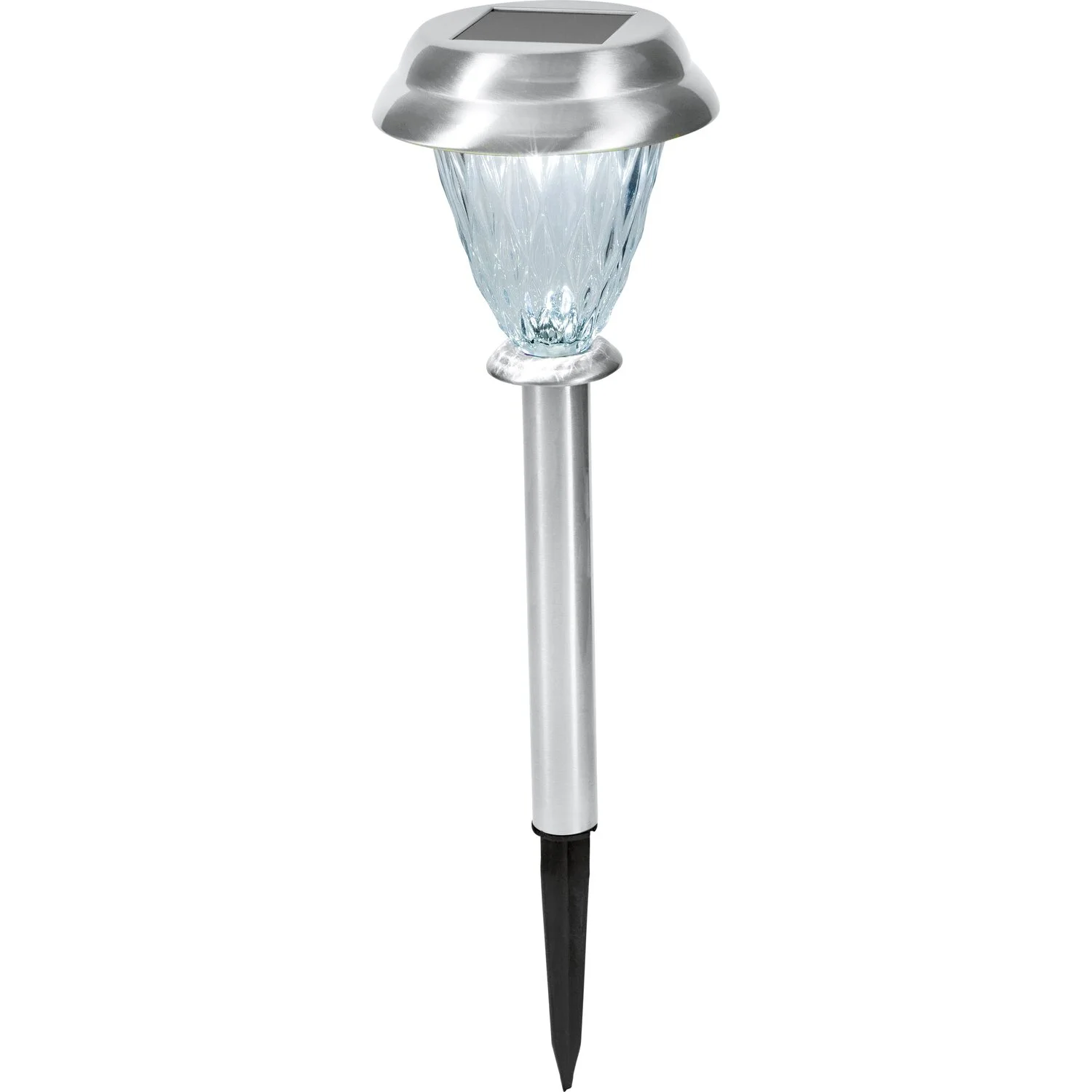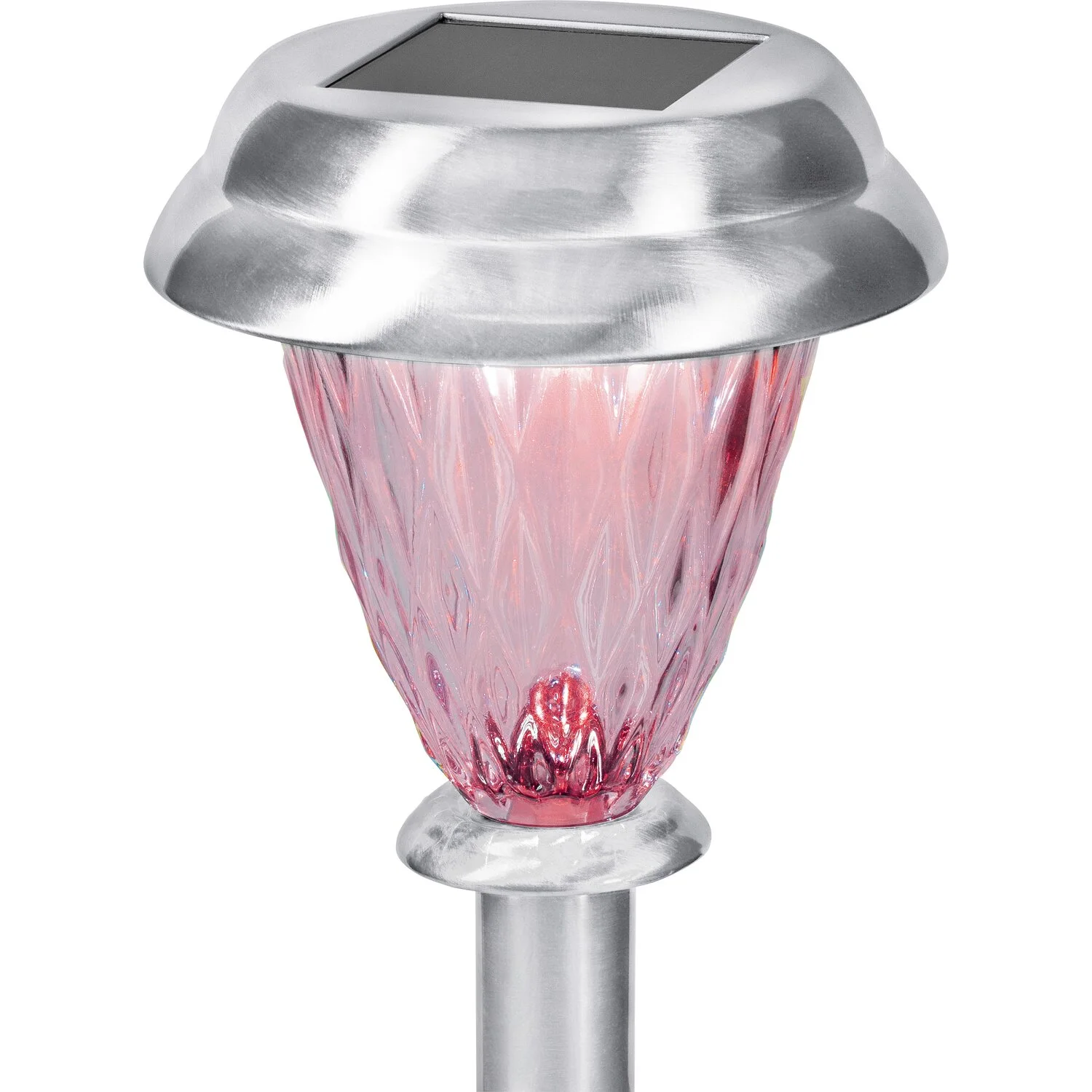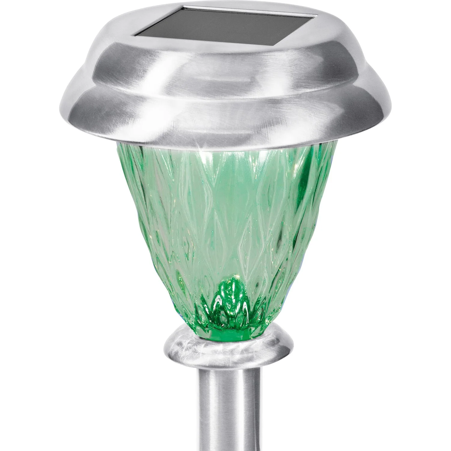 Der LED-Solarspiess in schlichter Optik ist für die zusätzliche Beleuchtung im Garten, auf der Terrasse oder auch an Gehwegen geeignet. Er besteht aus Edelstahl und Glas, welches durch die Oberflächenstruktur für besondere Lichteffekte sorgt. Die Lichtfarbe der fest verbauten 0,06-W-LED kann über einen innen liegenden Schalter gesteuert werden. Zur Auswahl wird ein schlichtes Weiss oder farbwechselnde RGB geboten. Der Akku wird durch das Solarpanel auf der Abdeckung geladen und sorgt im voll geladenem Zustand für bis zu 8 h Leuchtdauer. Die Schutzart IP44 schützt den Solarspiess vor Spritzwasser.